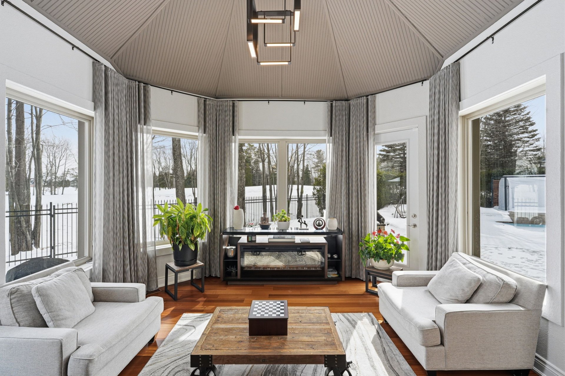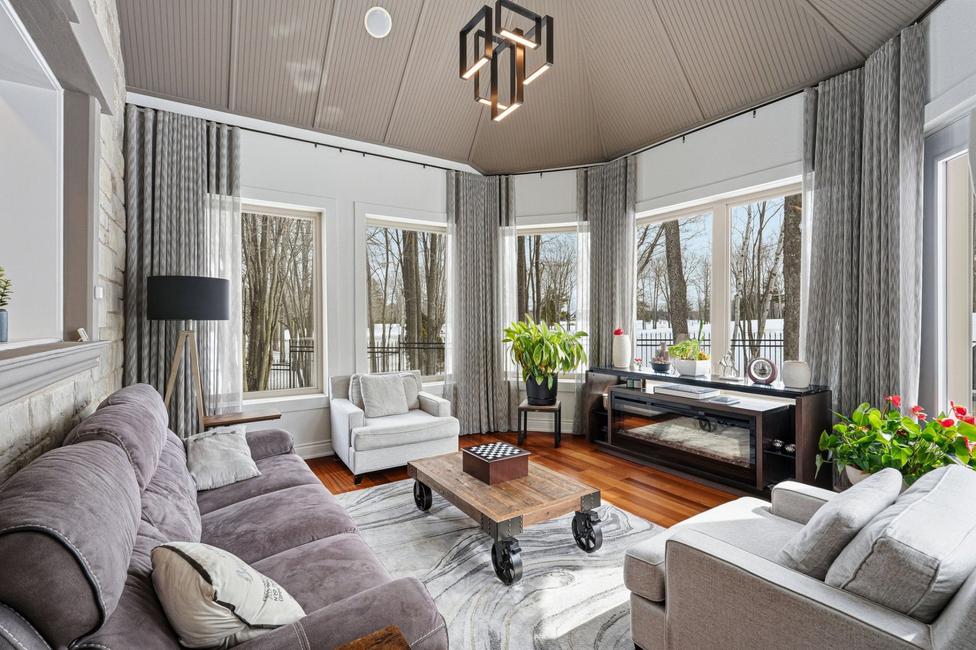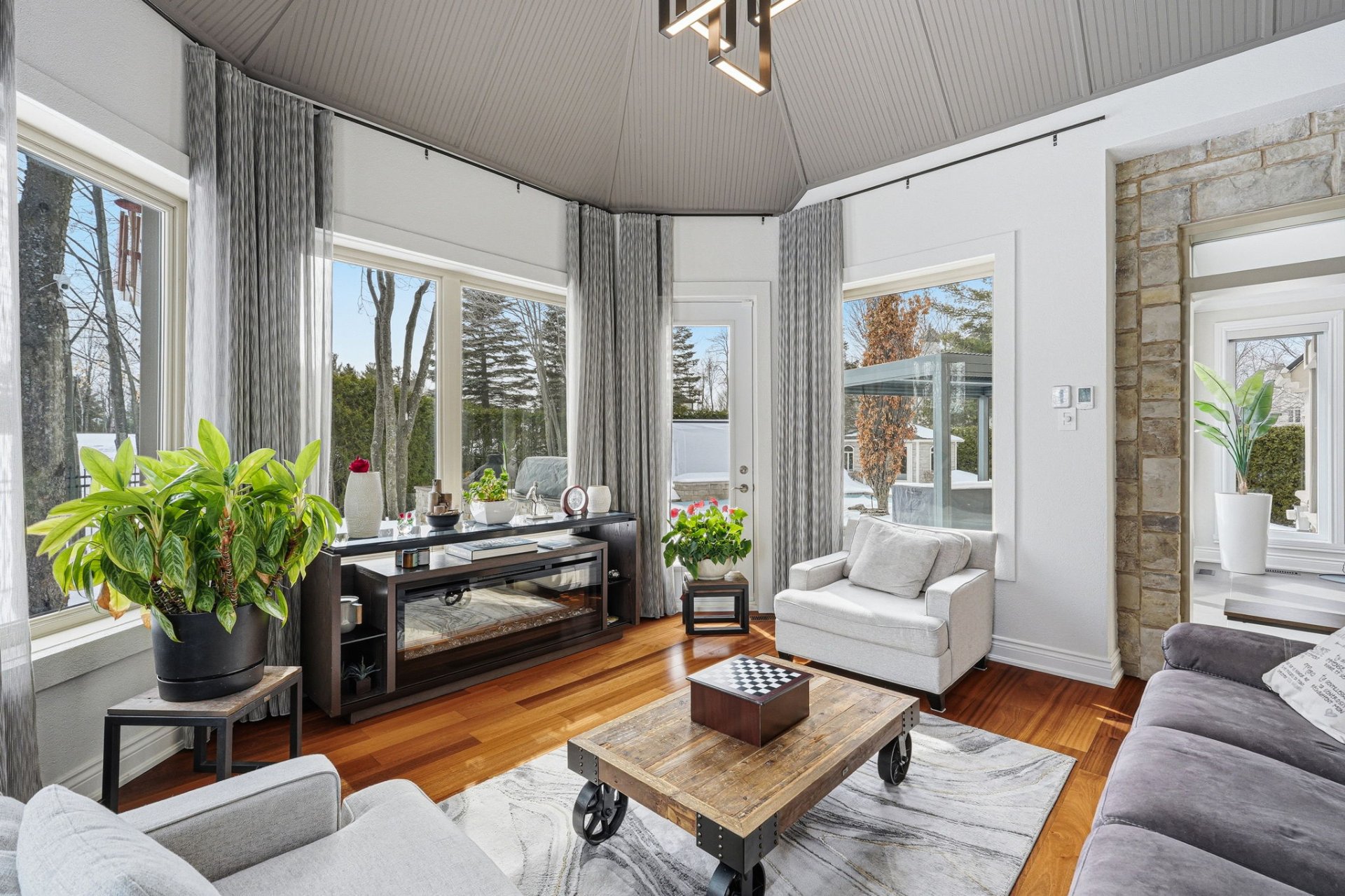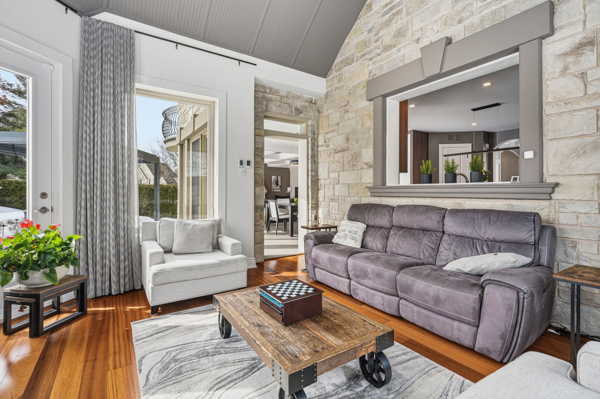 - Salon fermé avec mur en Pierre et vue sur la cour arrière et le golf.