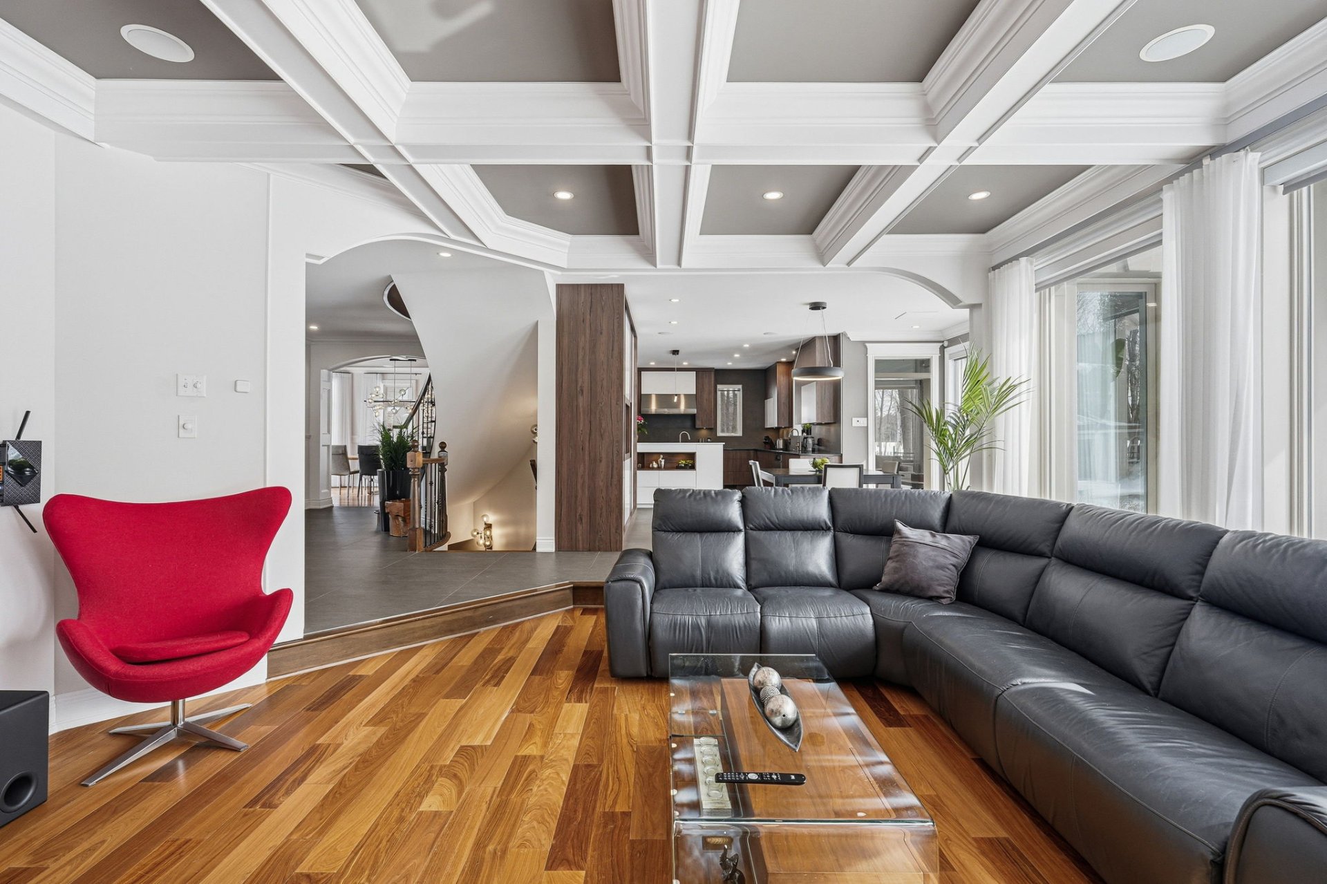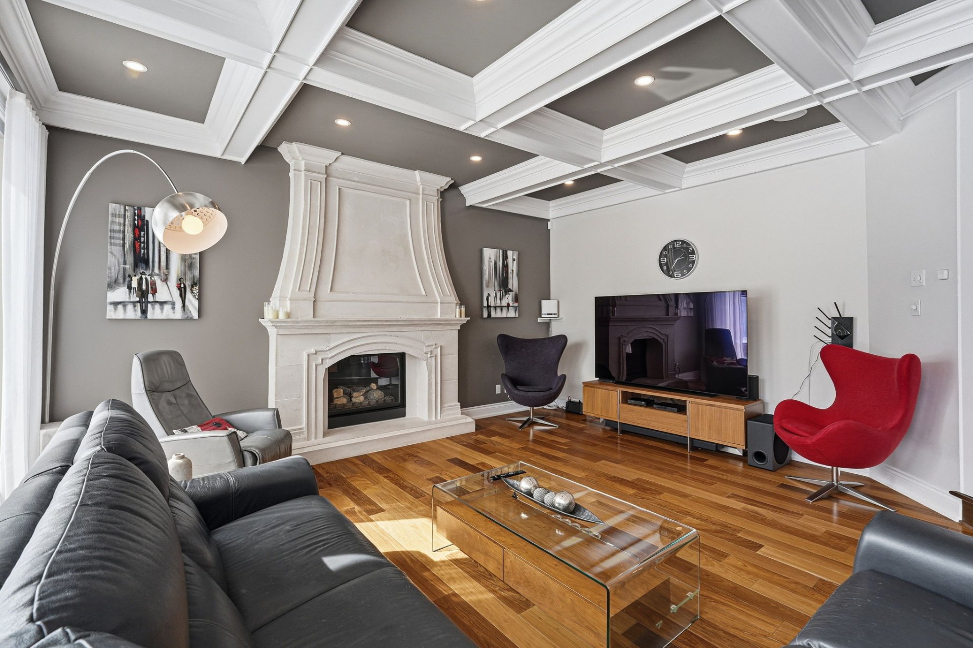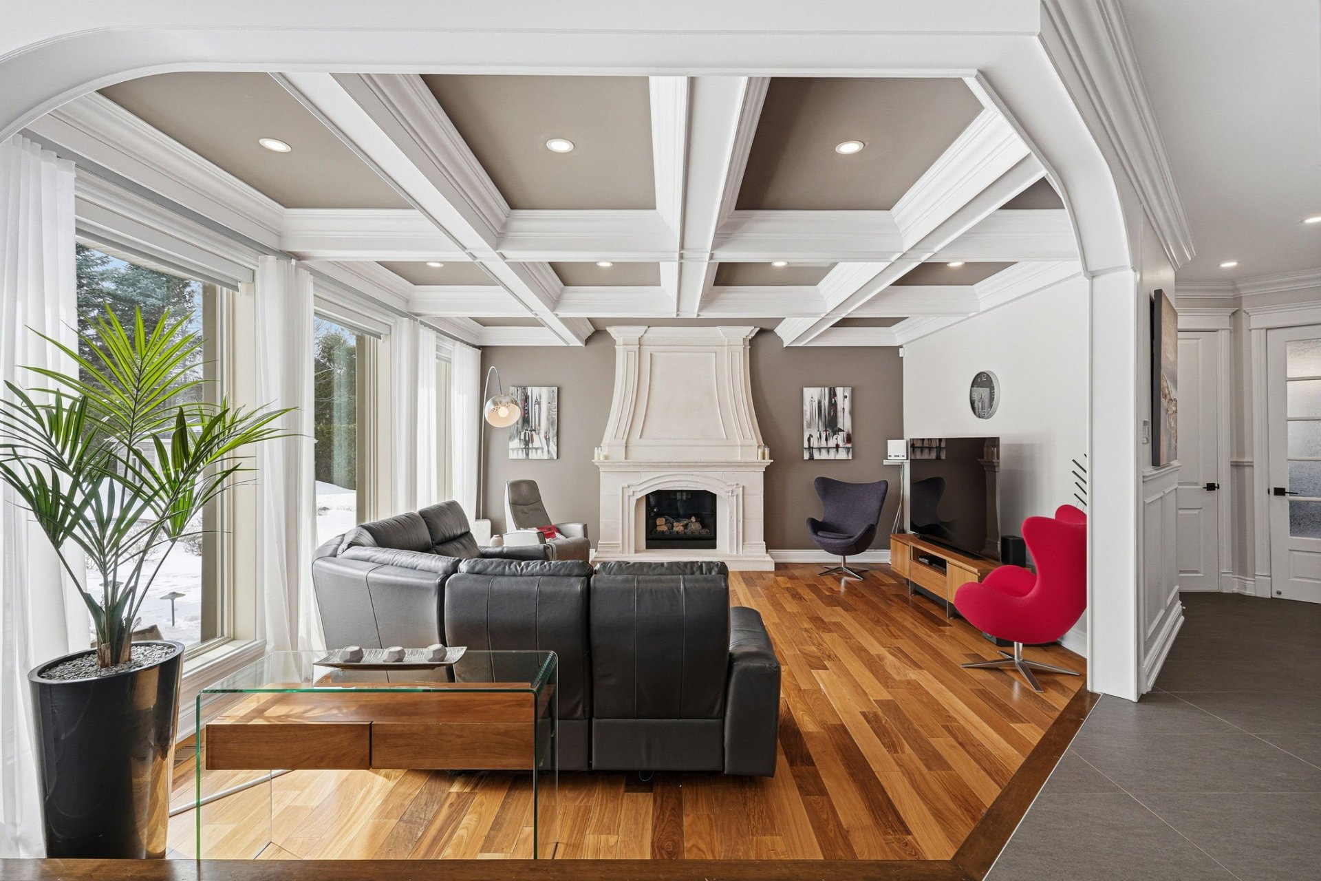 - Spacieuse salle familiale avec foyer au gaz et jolies moulures suspendues au plafond.