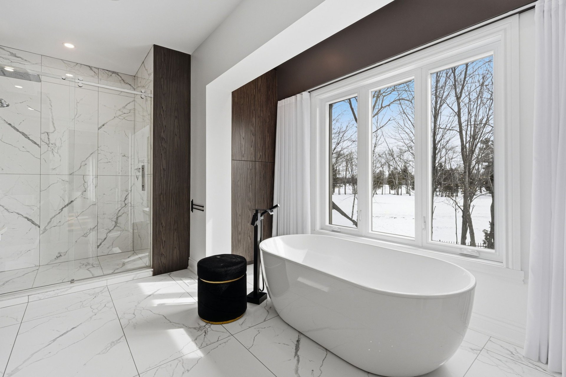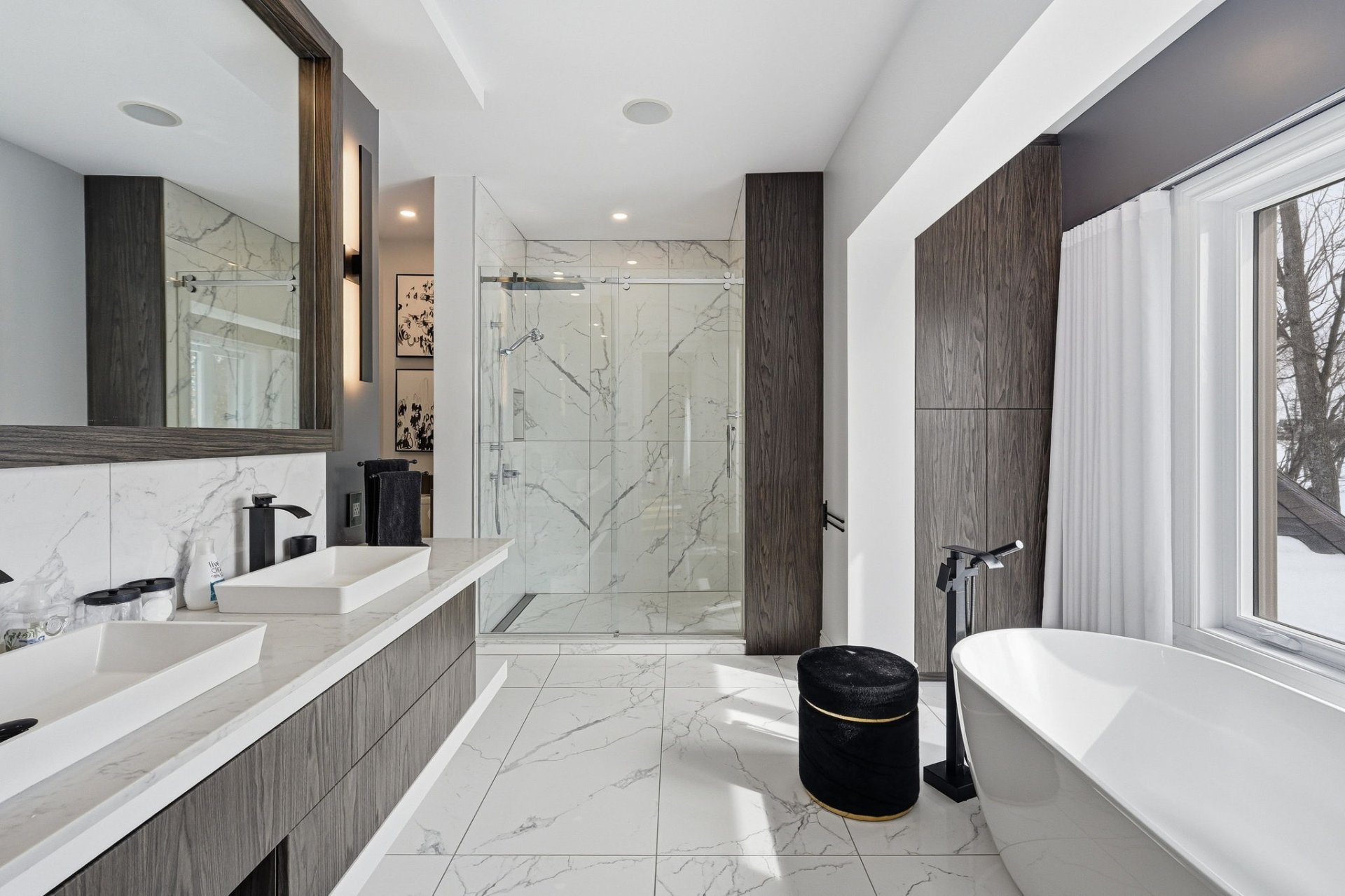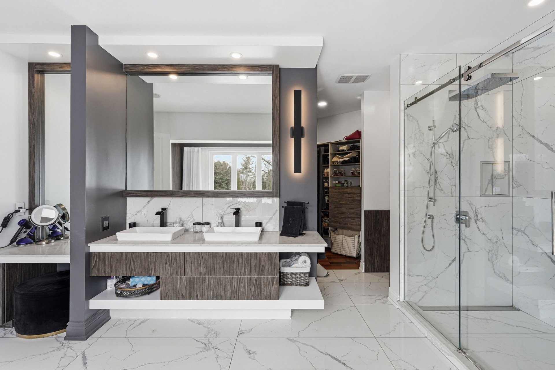 - Salle de bain des maîtres avec double vanité, comptoirs en Quartz, douche vitrée séparée, et bain moderne séparé.
