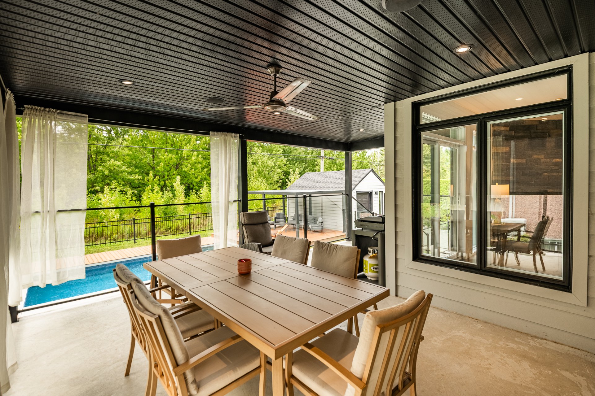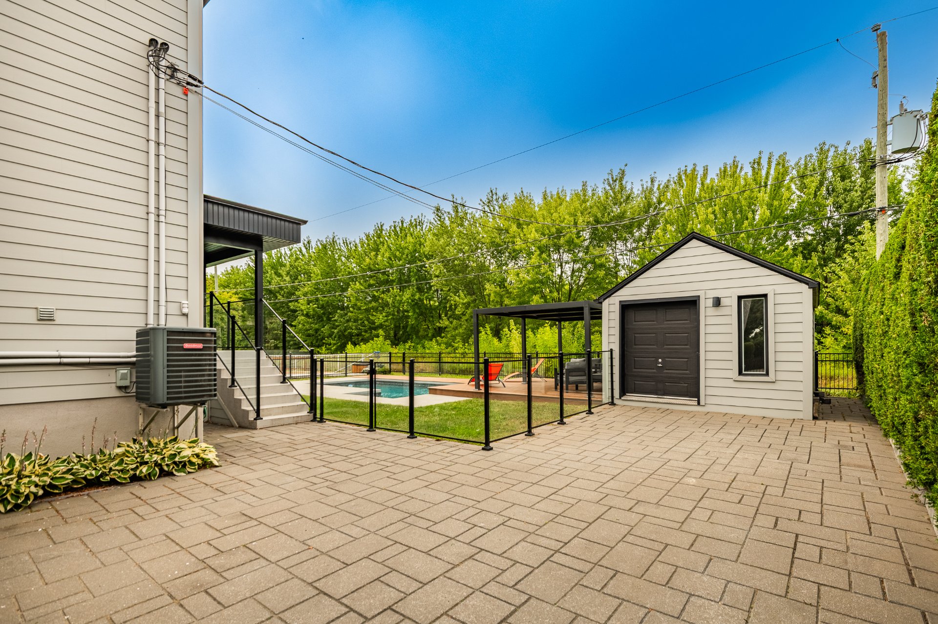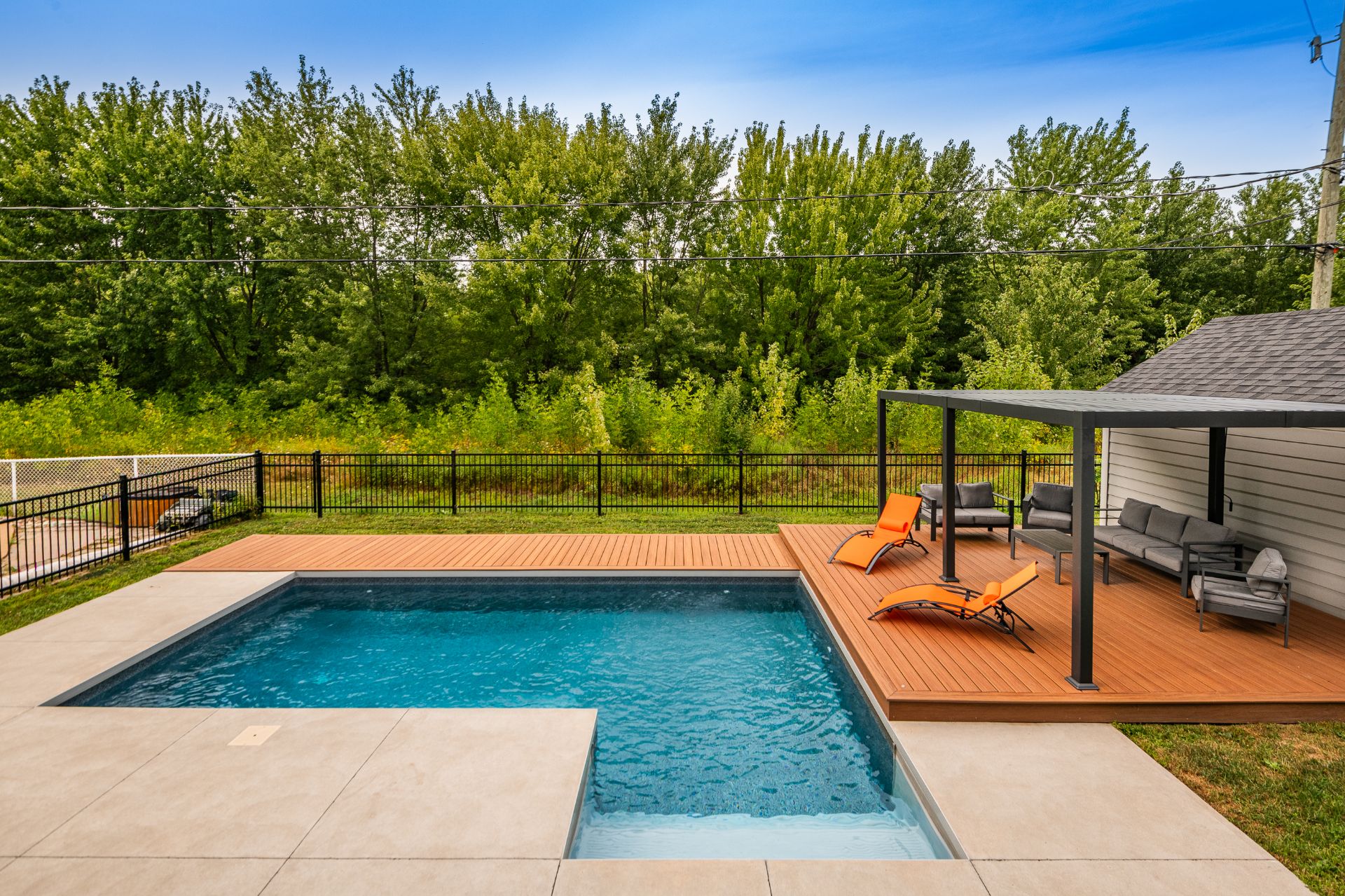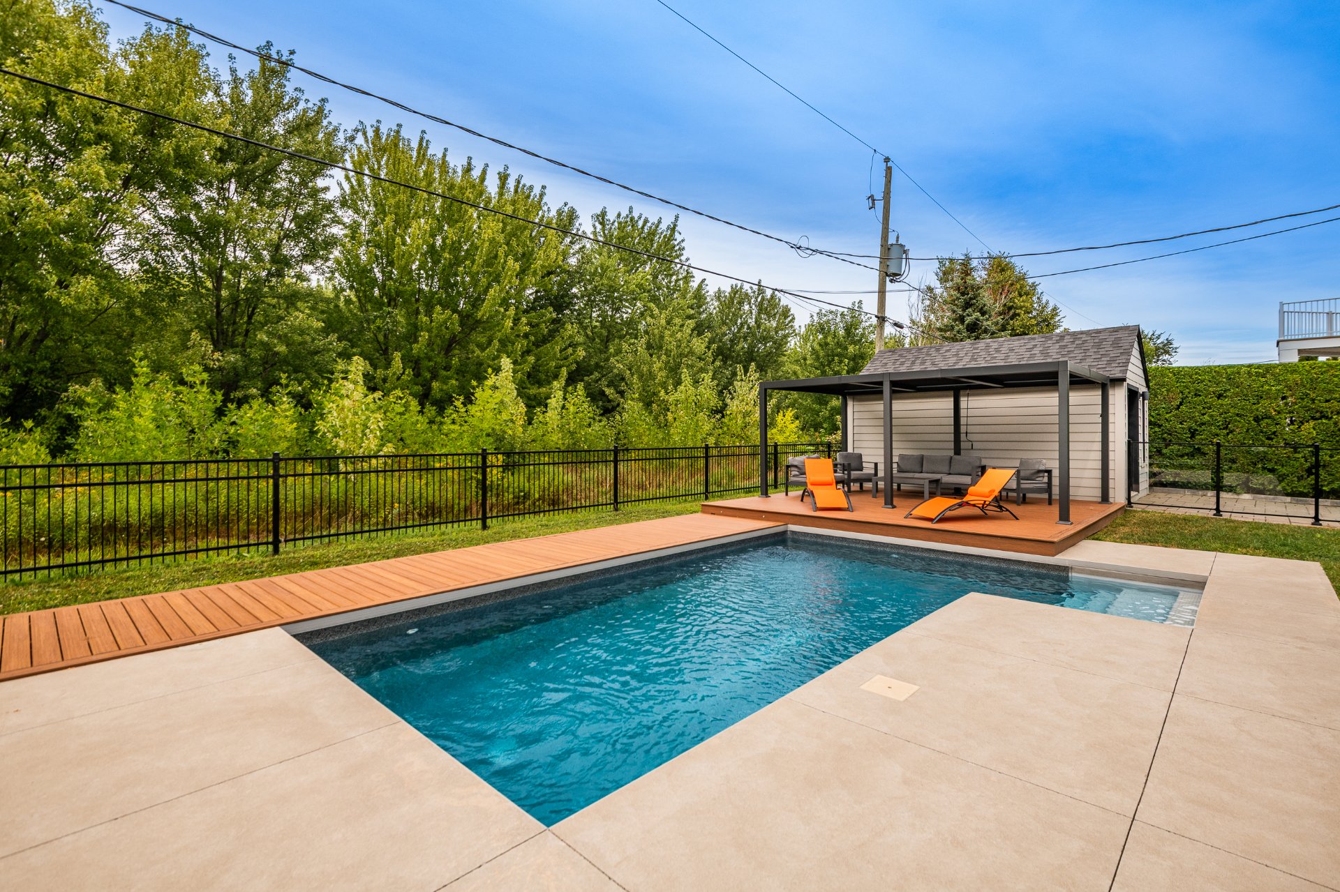 -Patio en planche de composite avec lumière intégré entoure la piscine creusée chauffée et clôturée