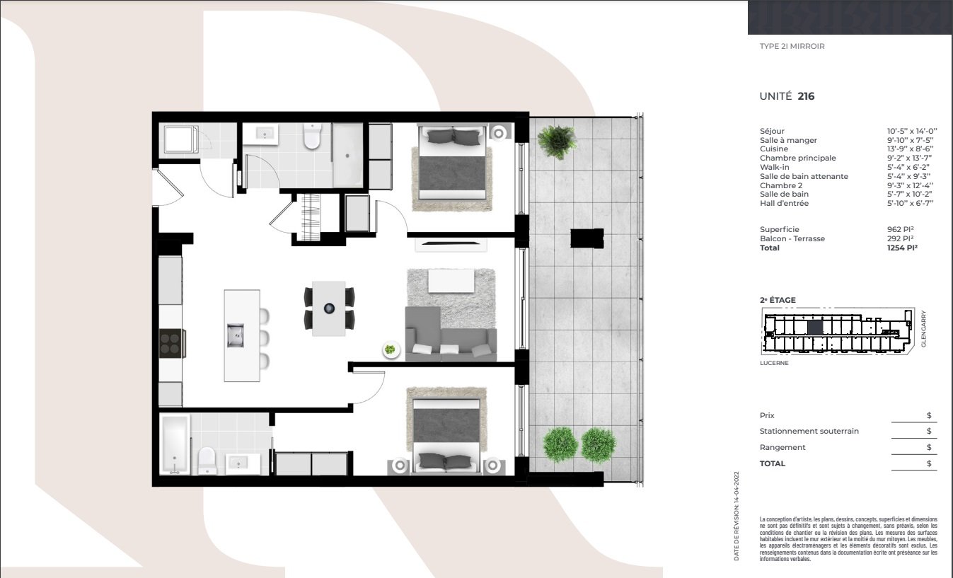 - Laveuse et sécheuse $2,400 + tx, Stationnement à partir de $58,500 + tx, Rangement à partir de $7,000 + tx, Borne électrique $8,000 + tx