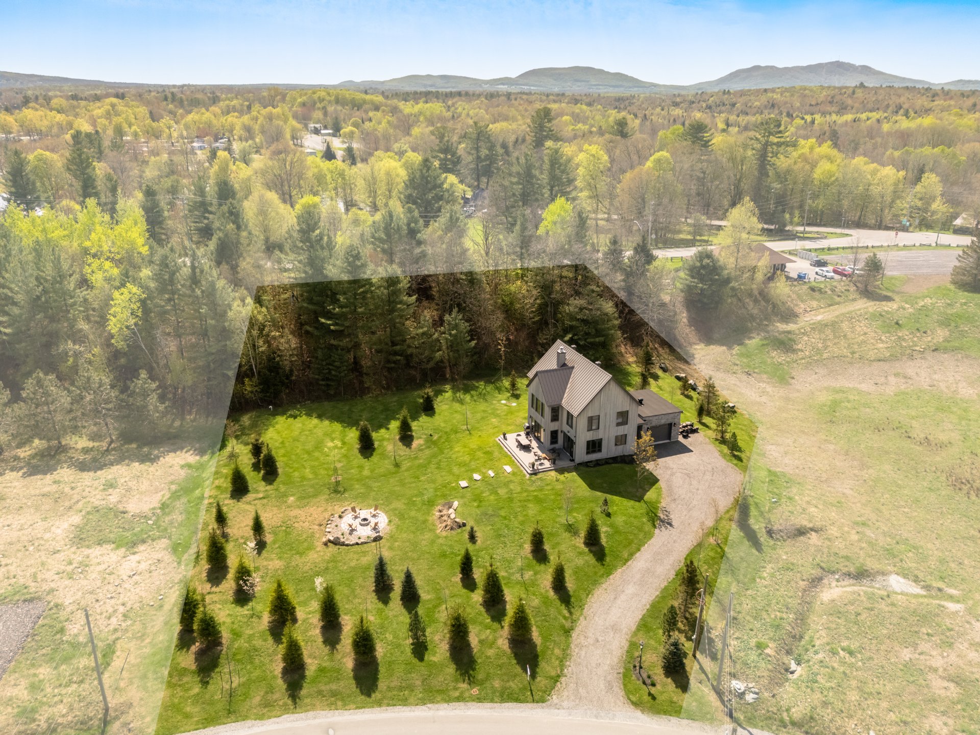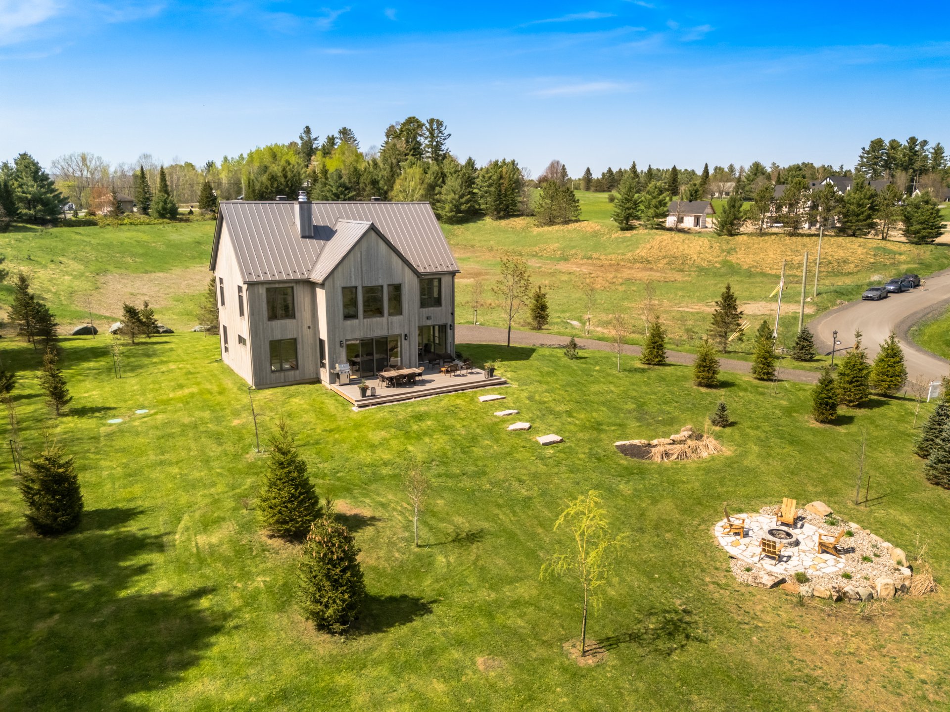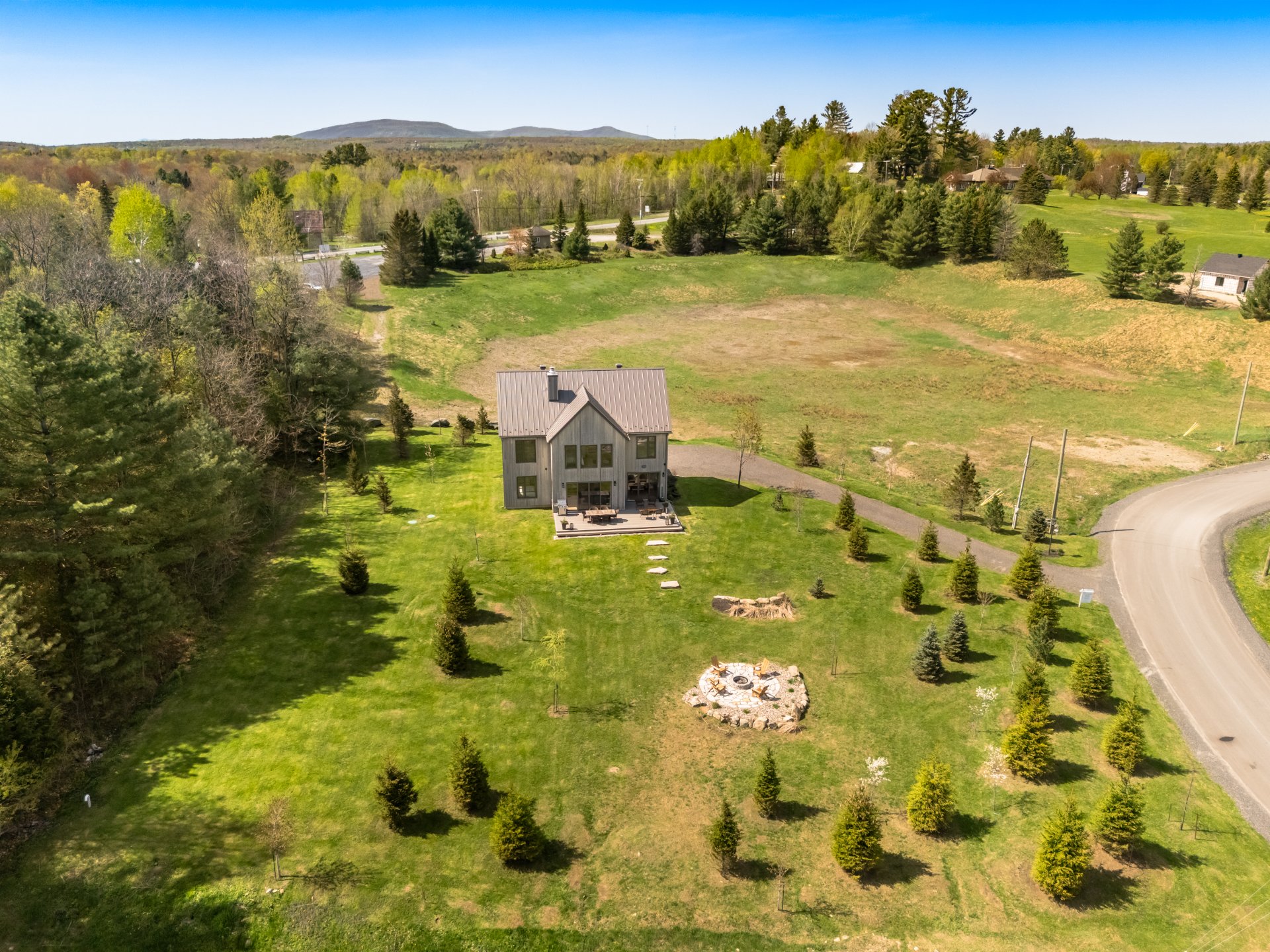 Le terrain, quant à lui, a été soigneusement aménagé pour mettre en valeur son dénivelé naturel et ses vues magnifiques. Une soixantaine d'arbres ont été soigneusement choisis dont plusieurs conifères de grande taille pour offrir charme et intimité. Une aire de feu en pierres naturelles entoure un foyer en bloc de pierre et son pare-étincelles. Des feuillus d'essences variées ainsi qu'un boisé à l'arrière de la maison enrichissent le décor.