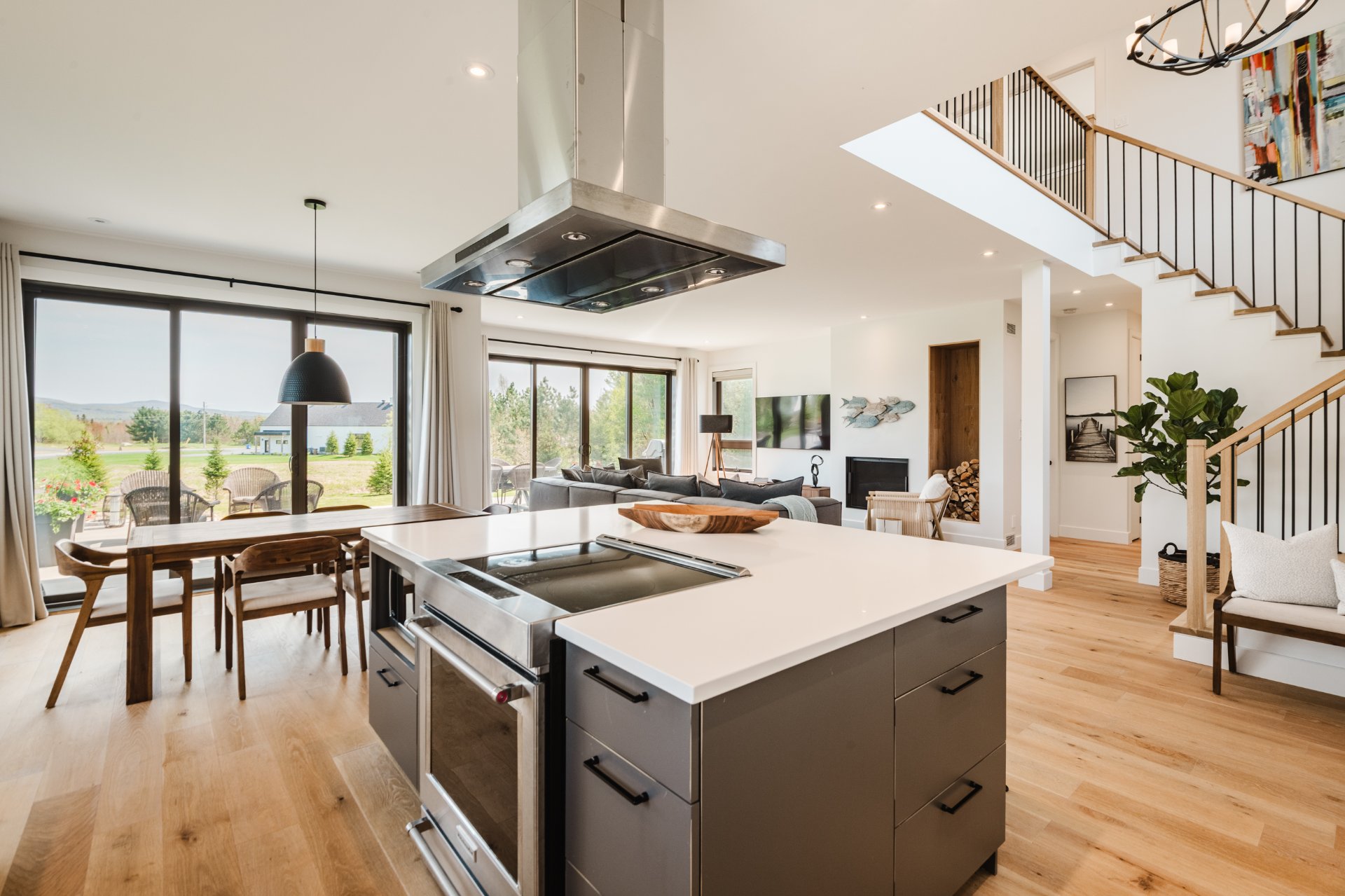 Dès l'entrée, vous serez accueilli dans un hall s'ouvrant sur un espace en toit cathédrale de plus de 18 pieds où l'escalier conçu en deux paliers favorise une grande luminosité. De ce hall, un mudroom charmant est connecté au garage chauffé. L'aire de vie avec ses hauts plafonds dispose d'un plan ouvert et convivial. La conception de cette propriété est soignée et chaleureuse. La cuisine épurée allie fonctionnalité et qualité. Le salon comporte un foyer au bois STUV qui ajoute une touche de sophistication tout en apportant une chaleur enveloppante. De grandes portes patio s'ouvrent sur l'extérieur où une large terrasse en composite a été aménagée. Une chambre d'amis, une salle de bain avec douche et une salle de lavage complètent ce premier niveau.