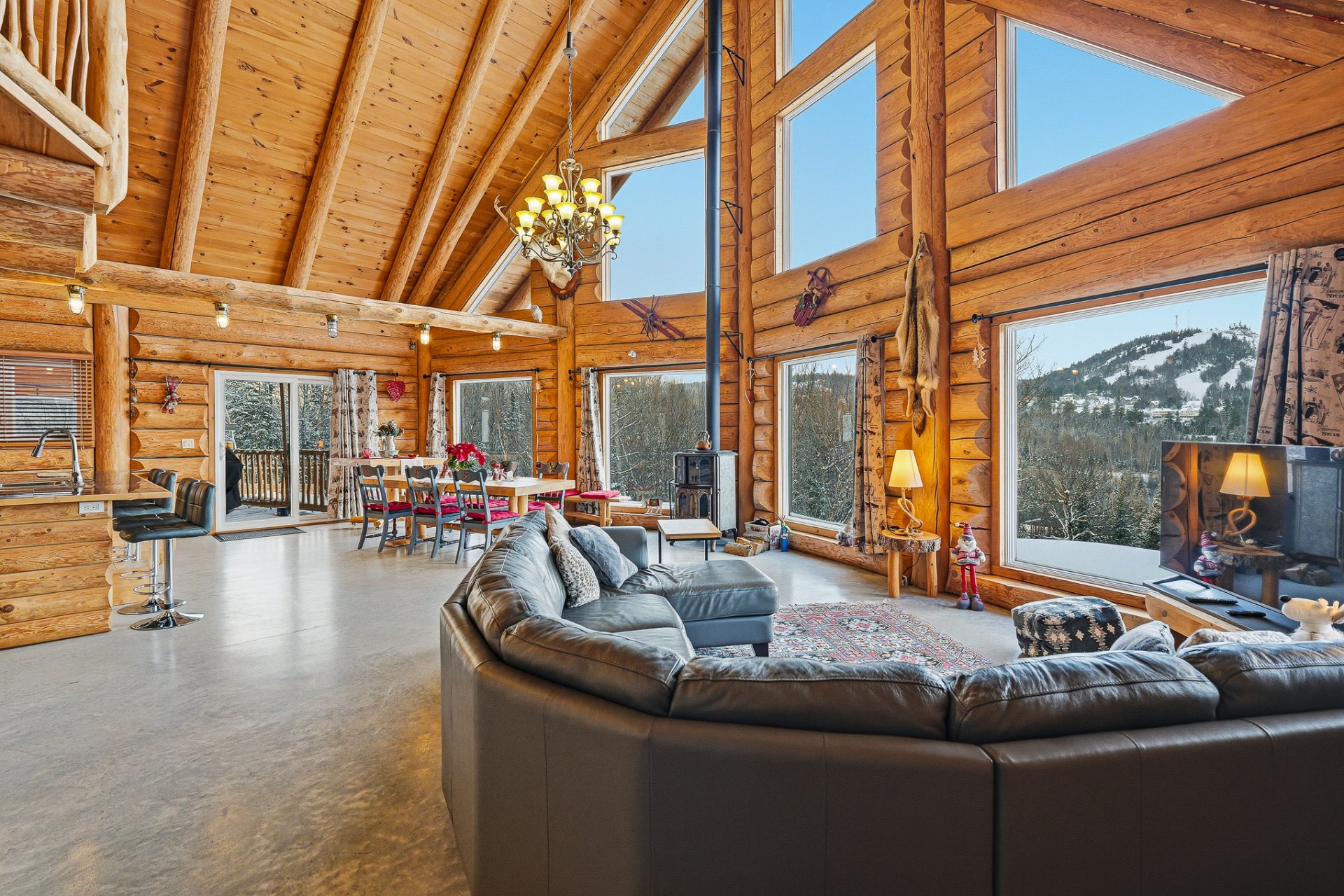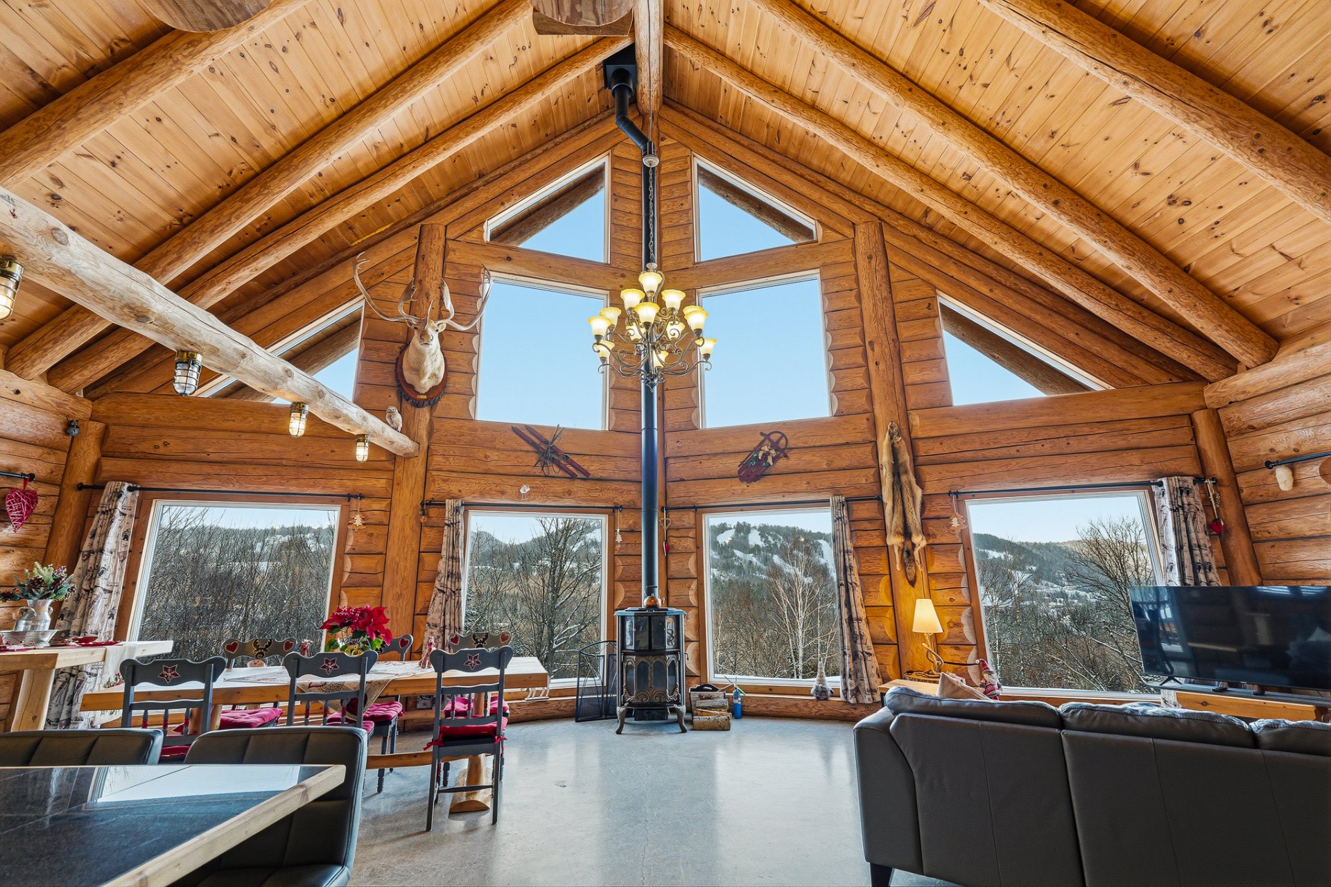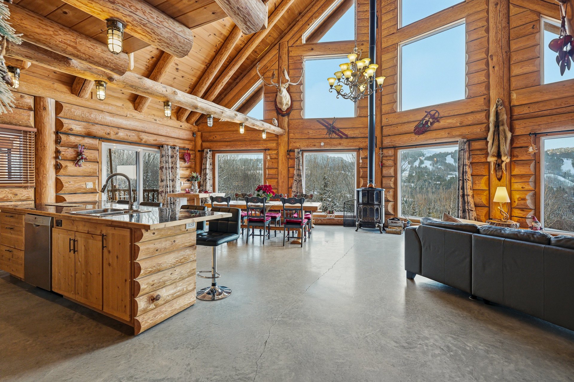 Chaque section dispose d'une grande aire ouverte combinant cuisine, salon et salle à manger, agrémentée d'un poêle à bois. Fenestration abondante offrant une vue imprenable sur la montagne.