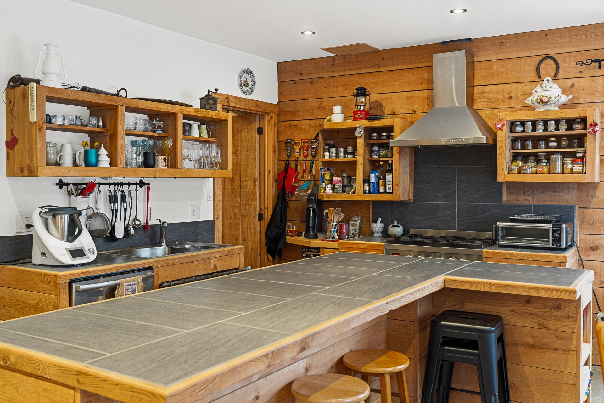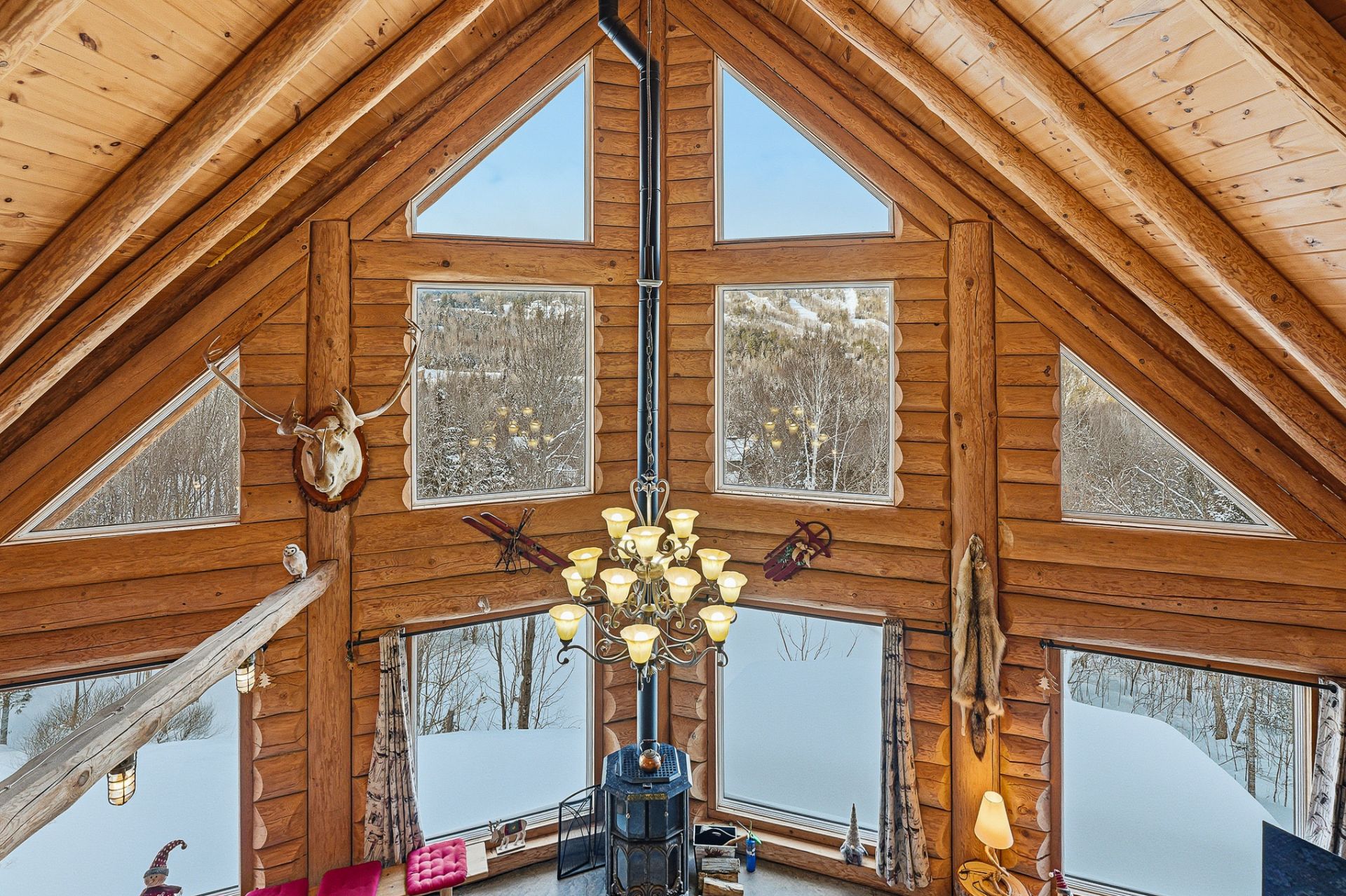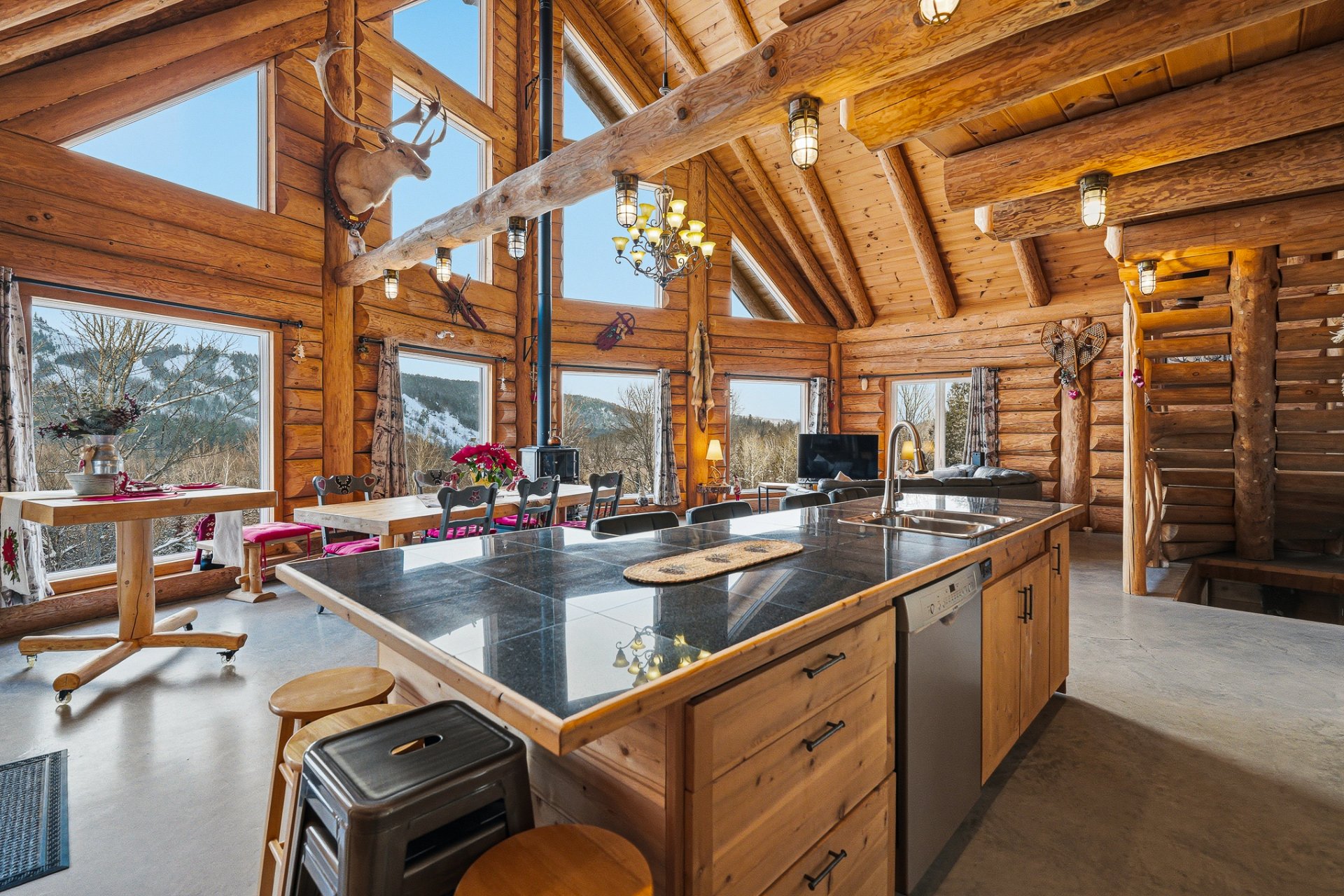 Chaque section dispose d'une grande aire ouverte combinant cuisine, salon et salle à manger, agrémentée d'un poêle à bois. Fenestration abondante offrant une vue imprenable sur la montagne.