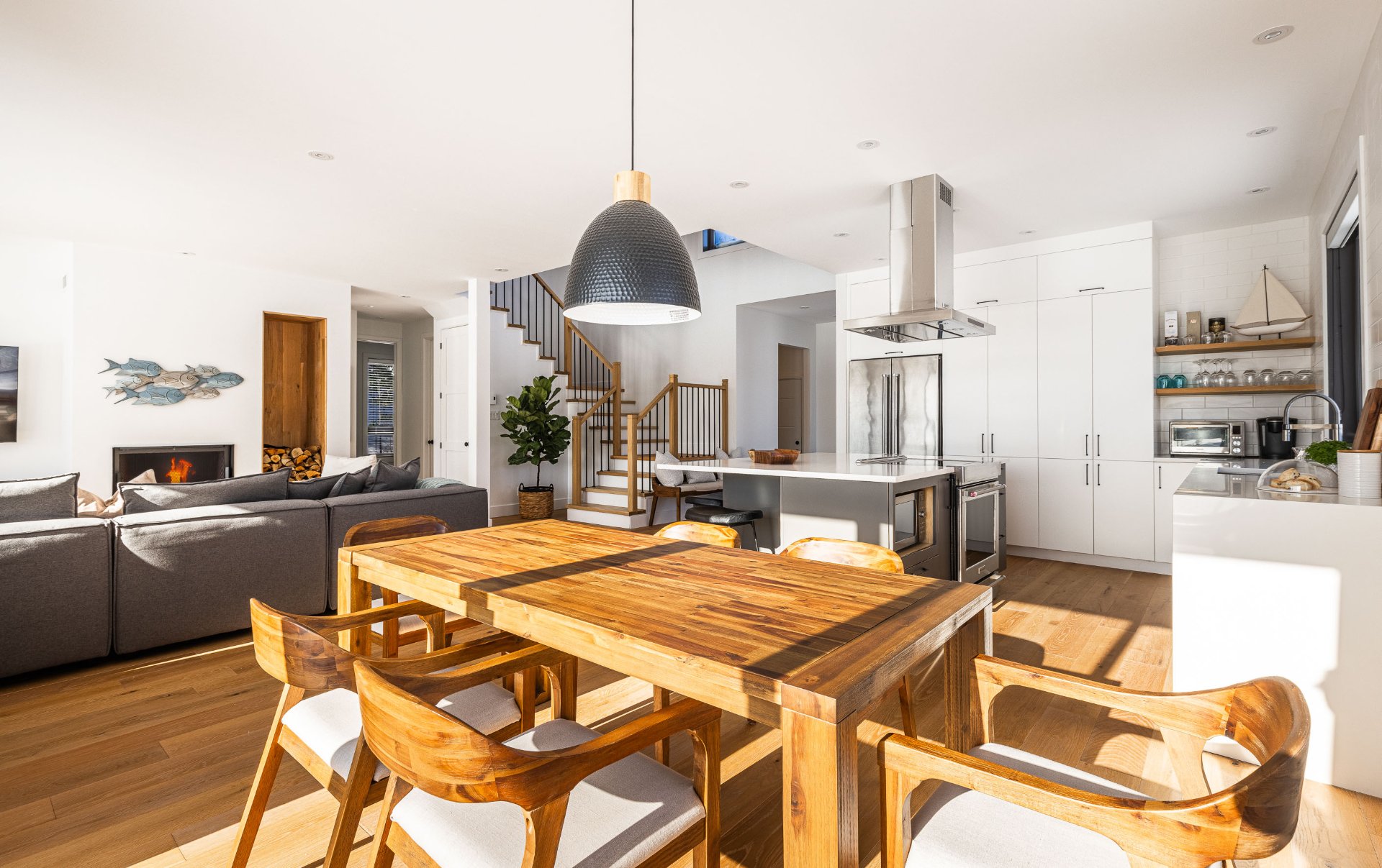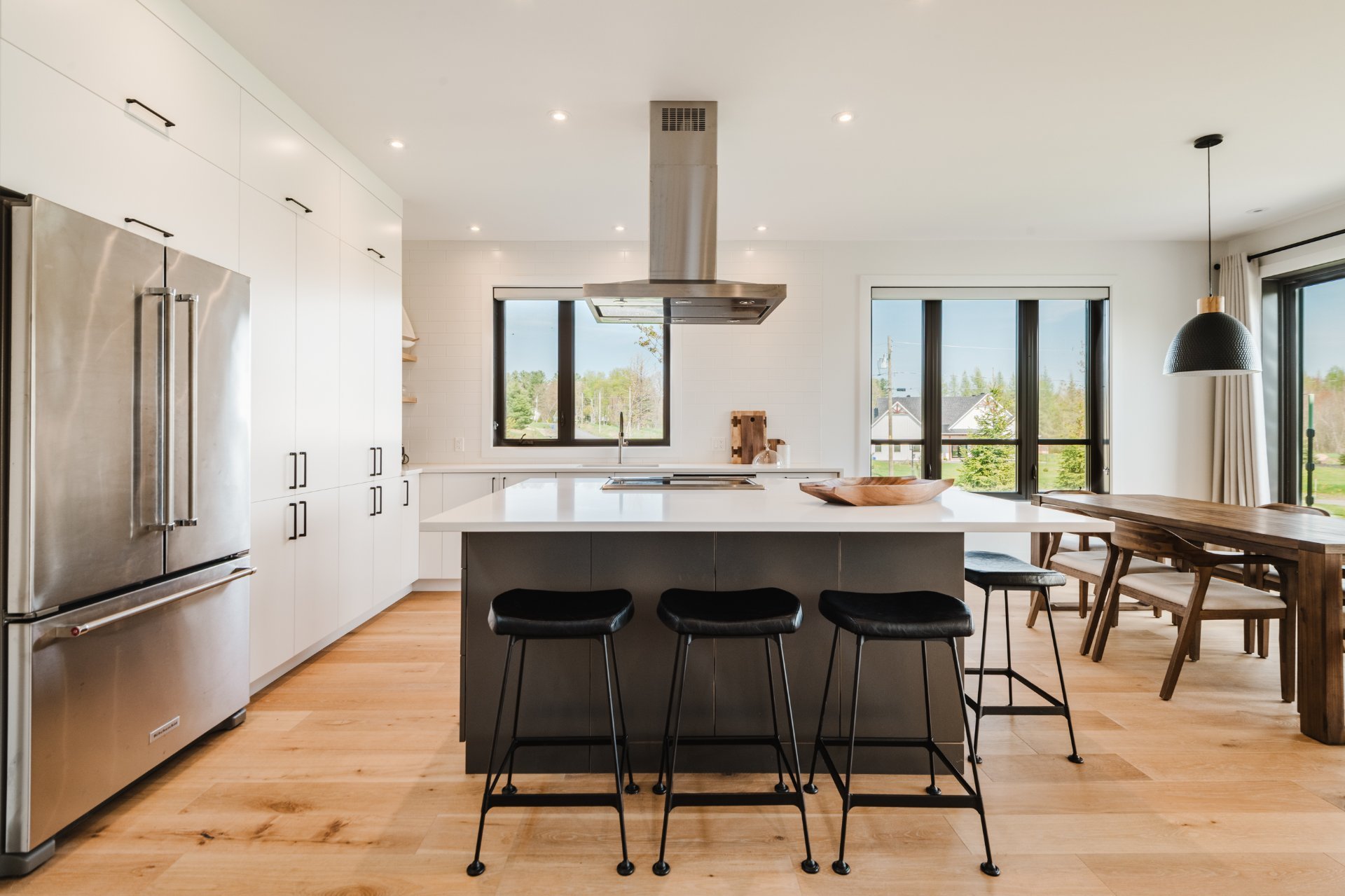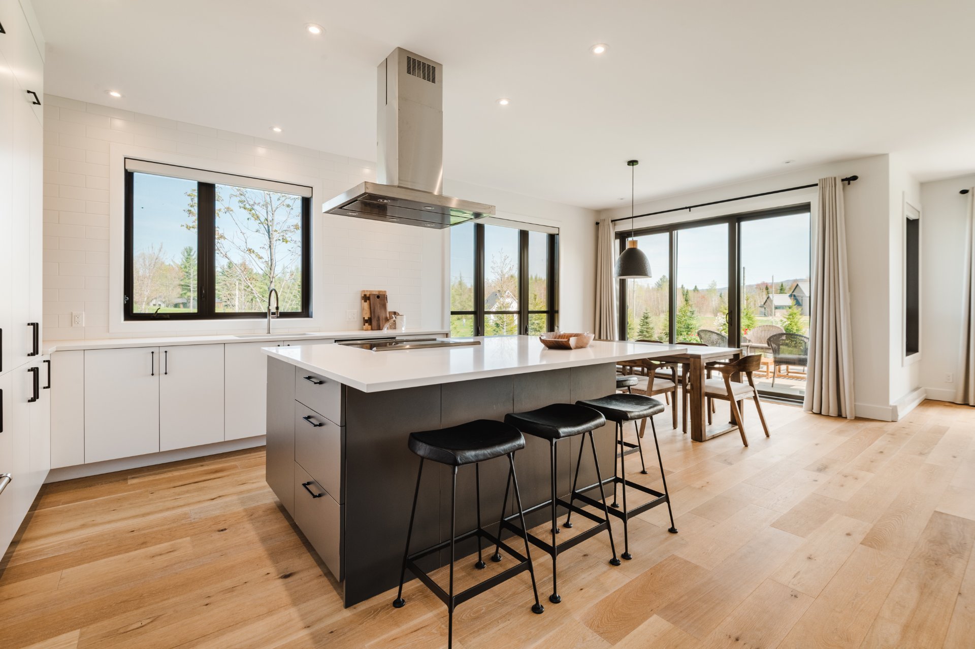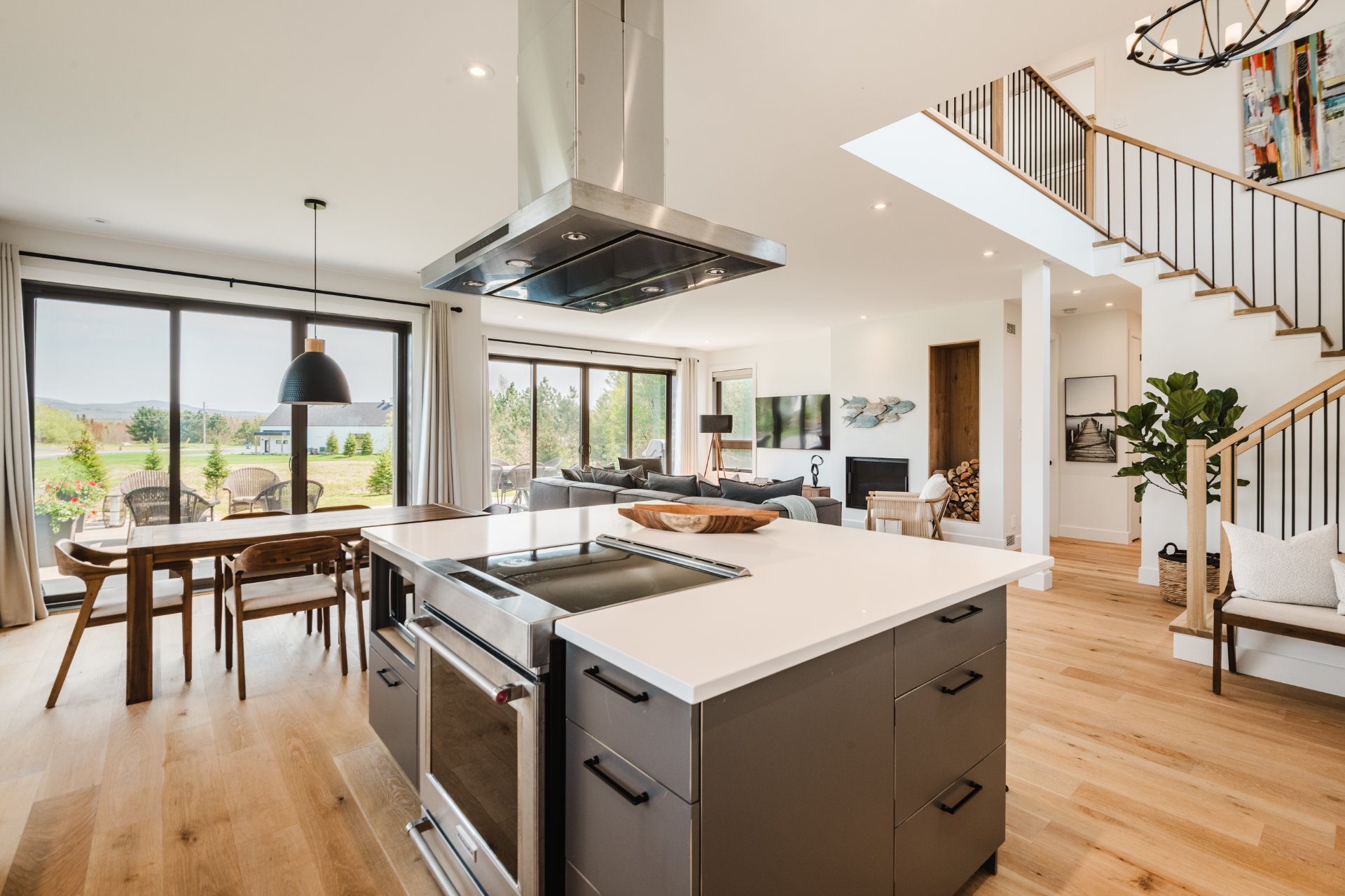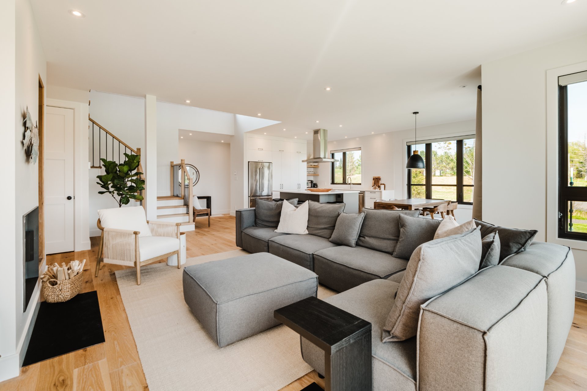 L'aire de vie avec ses hauts plafonds dispose d'un plan ouvert et convivial. La conception et le décor sont soignés et chaleureux. La cuisine épurée allie fonctionnalité et qualité. Le salon comporte un foyer au bois STUV qui ajoute une touche de sophistication tout en apportant une chaleur enveloppante. De grandes portes patio s'ouvrent sur l'extérieur où une large terrasse en composite a été aménagée. Une chambre d'amis, une salle de bain avec douche et une salle de lavage complètent ce premier niveau.