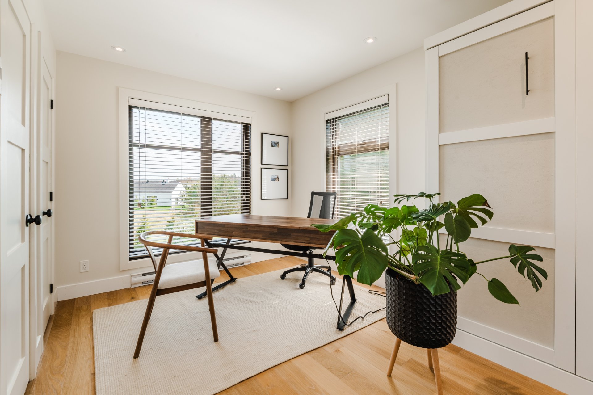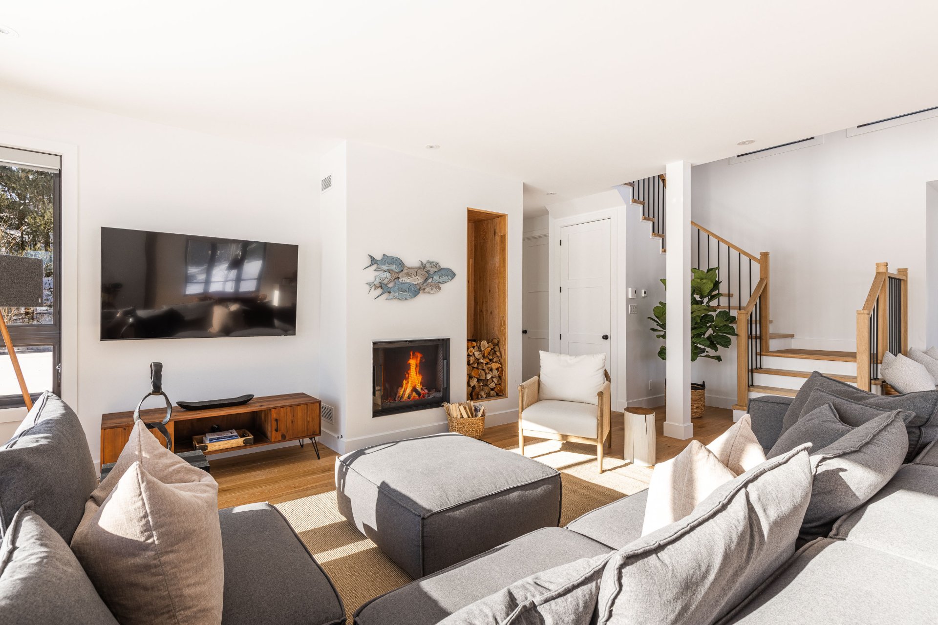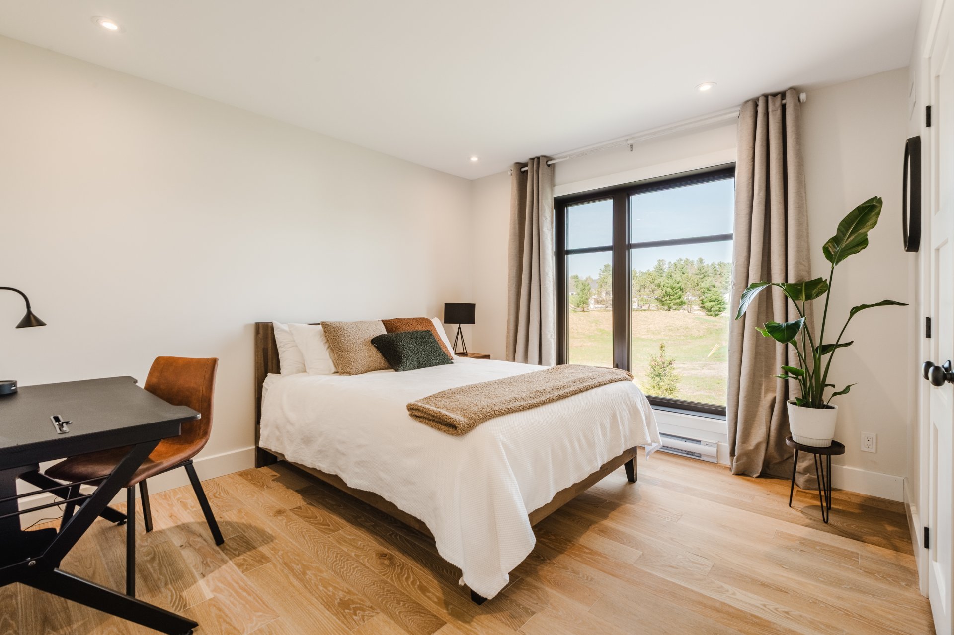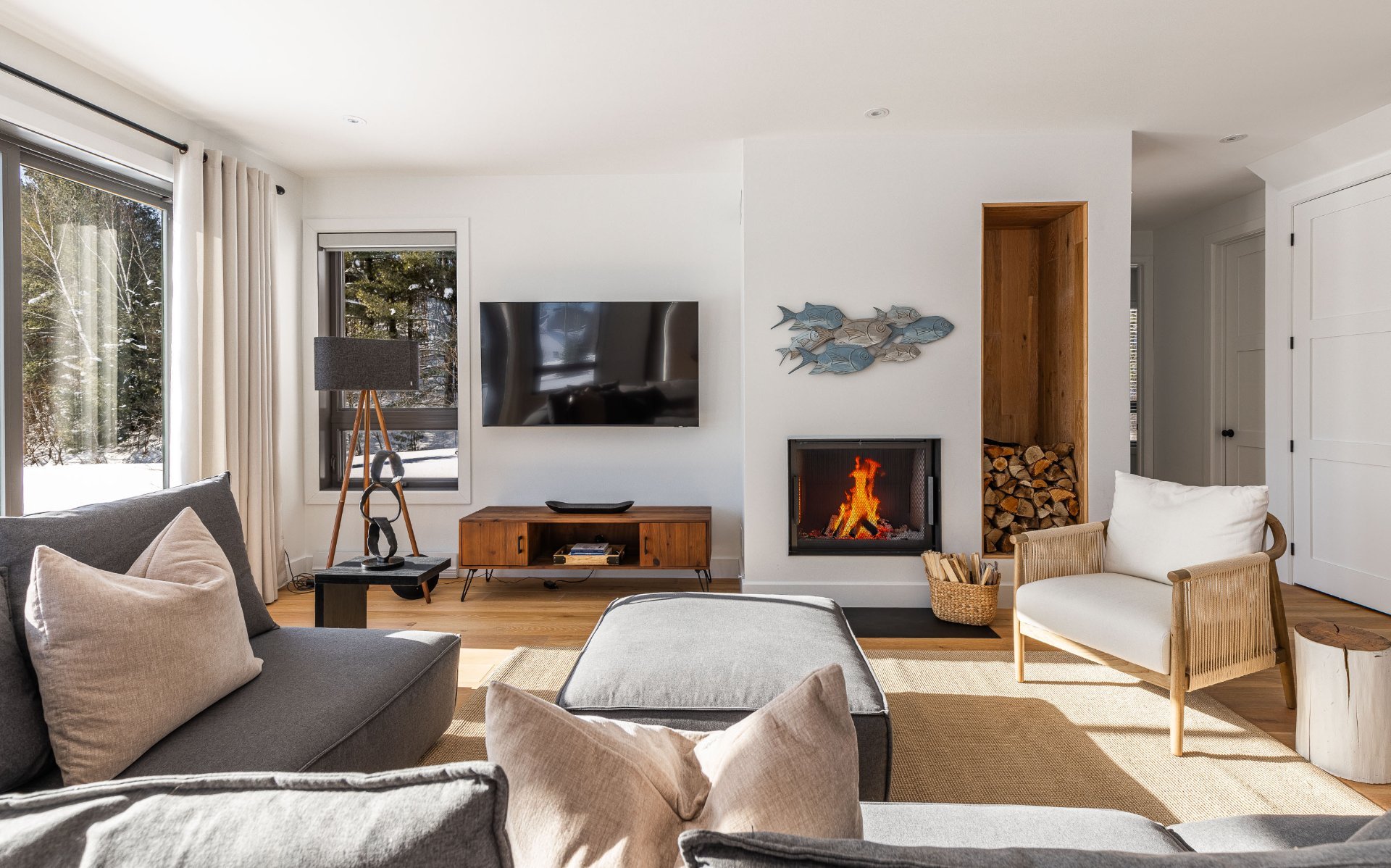 L'aire de vie avec ses hauts plafonds dispose d'un plan ouvert et convivial. La conception et le décor sont soignés et chaleureux. La cuisine épurée allie fonctionnalité et qualité. Le salon comporte un foyer au bois STUV qui ajoute une touche de sophistication tout en apportant une chaleur enveloppante. De grandes portes patio s'ouvrent sur l'extérieur où une large terrasse en composite a été aménagée. Une chambre d'amis, une salle de bain avec douche et une salle de lavage complètent ce premier niveau.