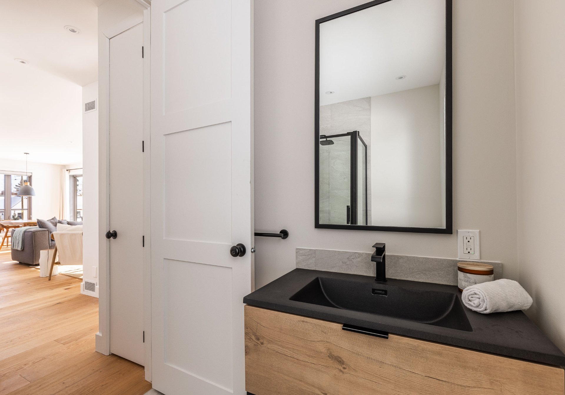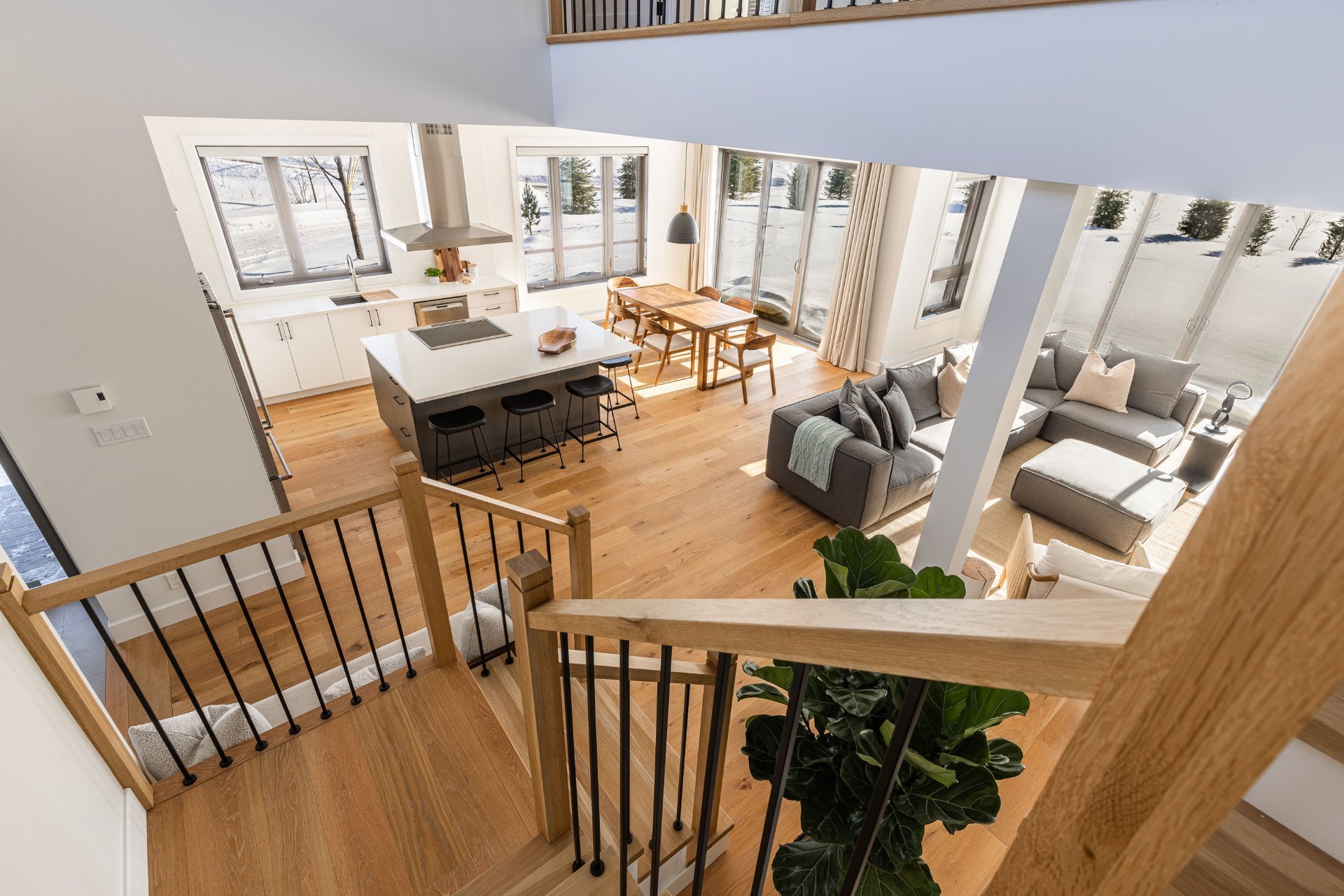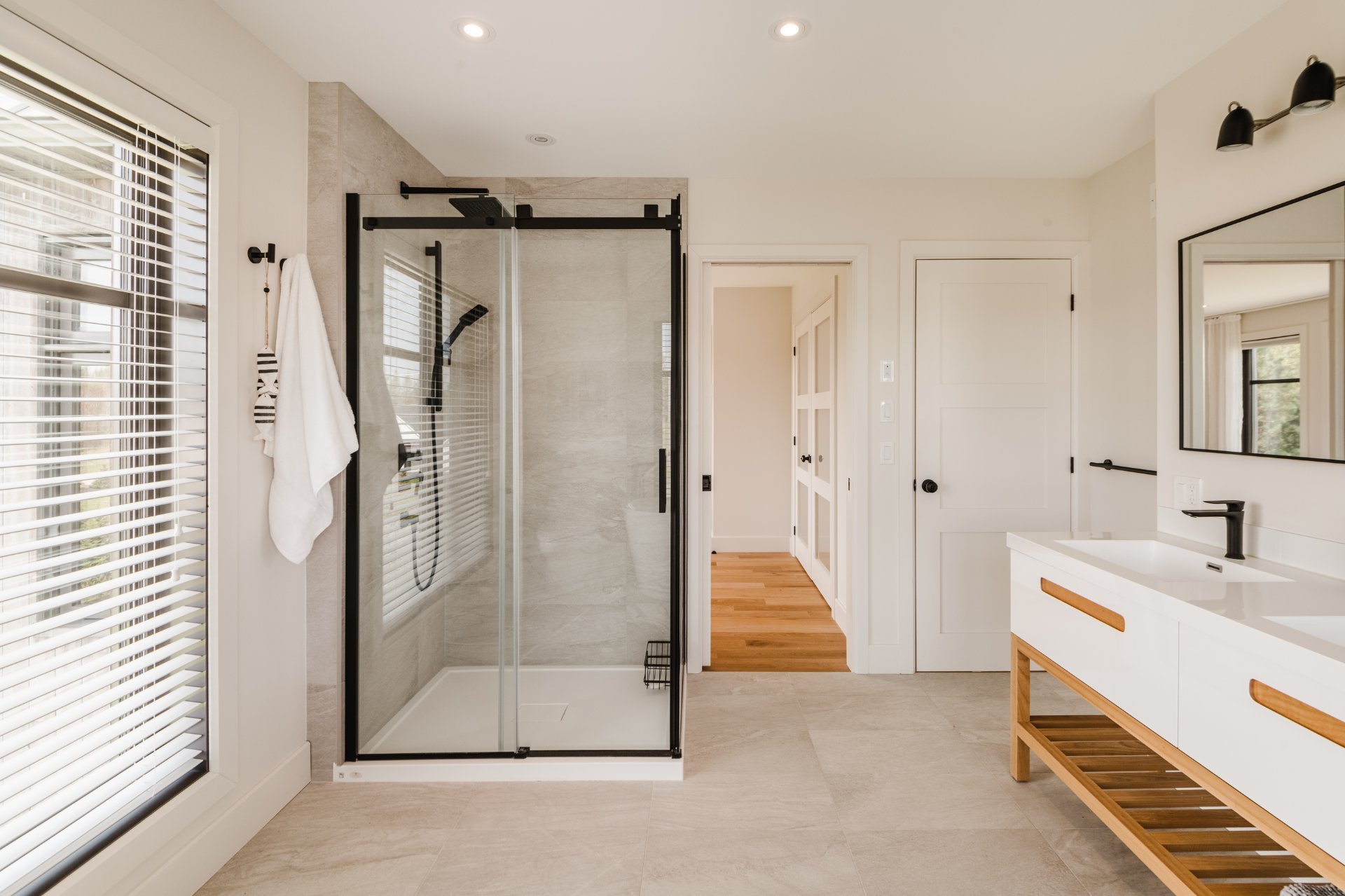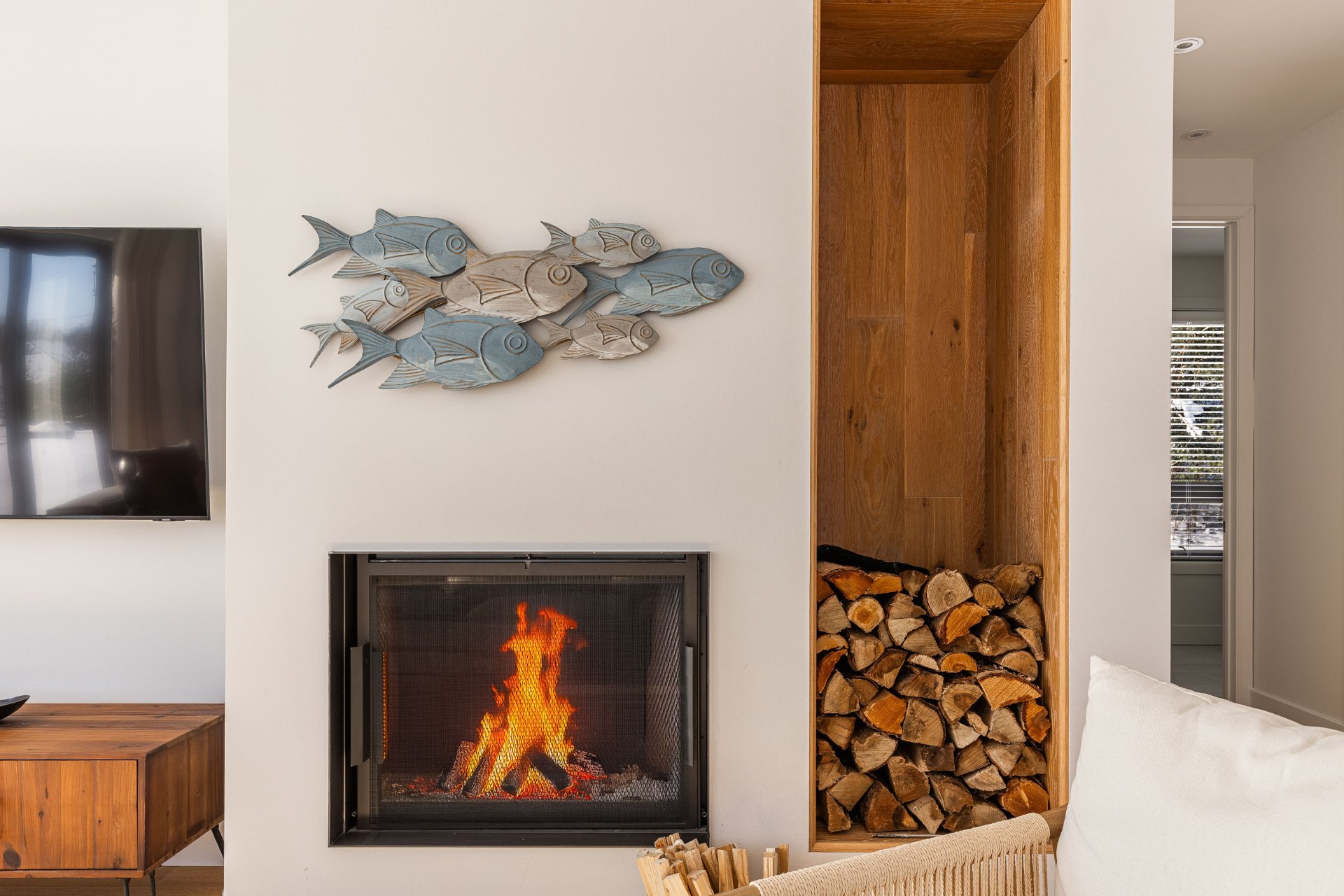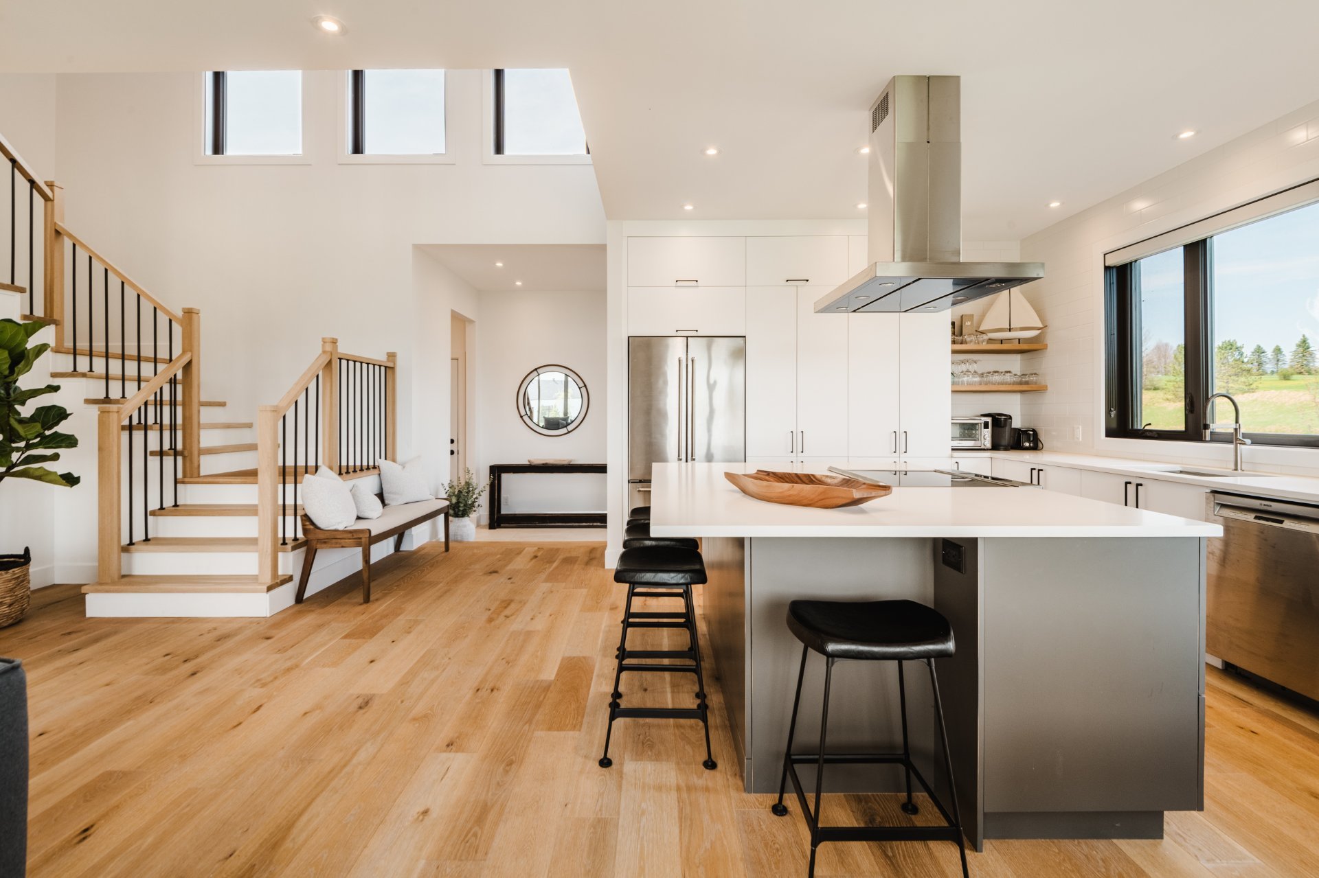 L'aire de vie avec ses hauts plafonds dispose d'un plan ouvert et convivial. La conception et le décor sont soignés et chaleureux. La cuisine épurée allie fonctionnalité et qualité. Le salon comporte un foyer au bois STUV qui ajoute une touche de sophistication tout en apportant une chaleur enveloppante. De grandes portes patio s'ouvrent sur l'extérieur où une large terrasse en composite a été aménagée. Une chambre d'amis, une salle de bain avec douche et une salle de lavage complètent ce premier niveau.