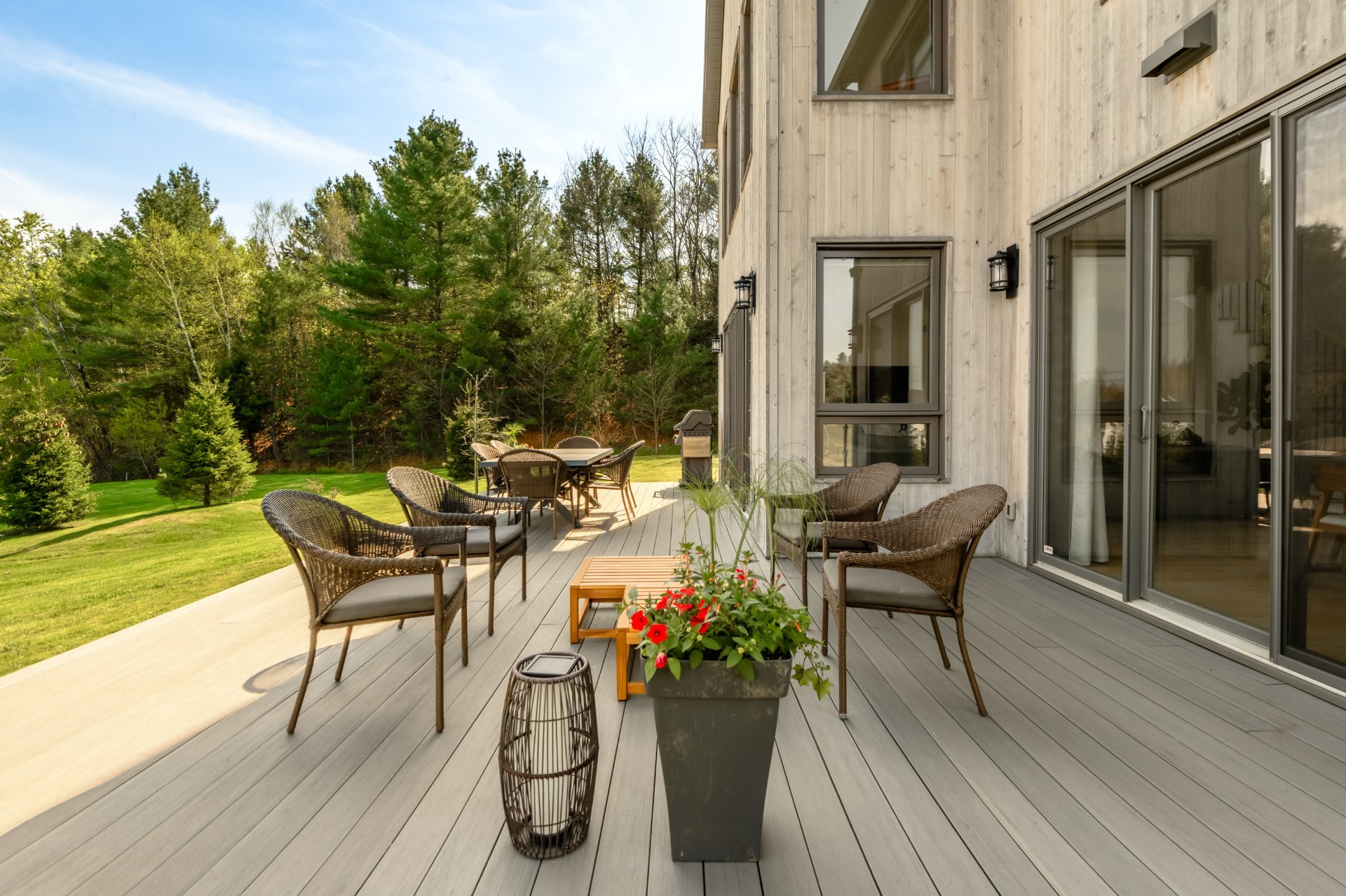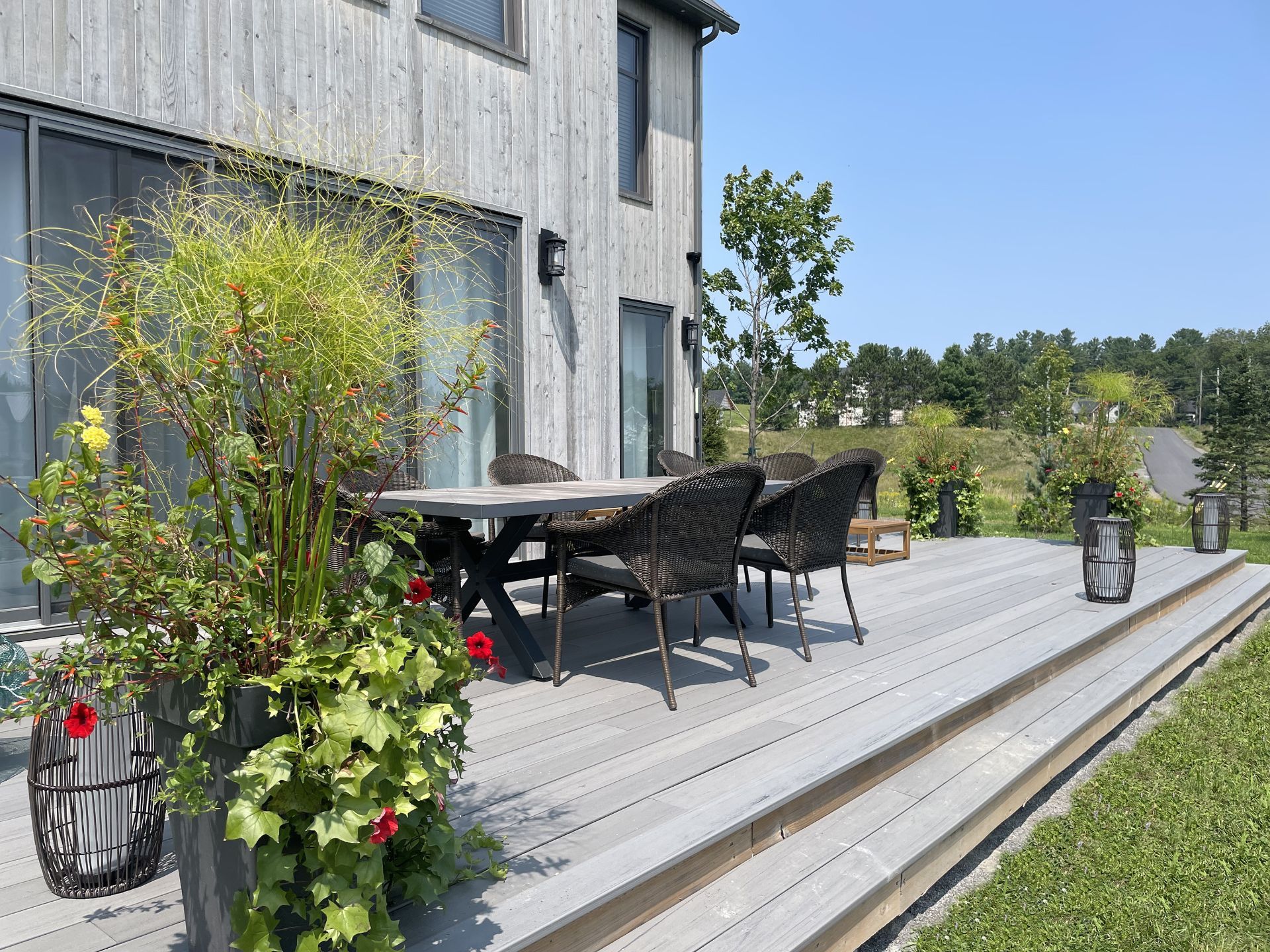 Le terrain a été soigneusement aménagé pour mettre en valeur son dénivelé naturel et ses vues magnifiques. Une soixantaine d'arbres ont été minutieusement choisis dont plusieurs conifères de grande taille pour agrémenter le terrain tout en favorisant l'intimité. Une aire de feu en pierres naturelles entoure un foyer en bloc de pierre et son pare-étincelles. Des feuillus d'essences variées ainsi qu'un boisé à l'arrière de la maison enrichissent le décor.