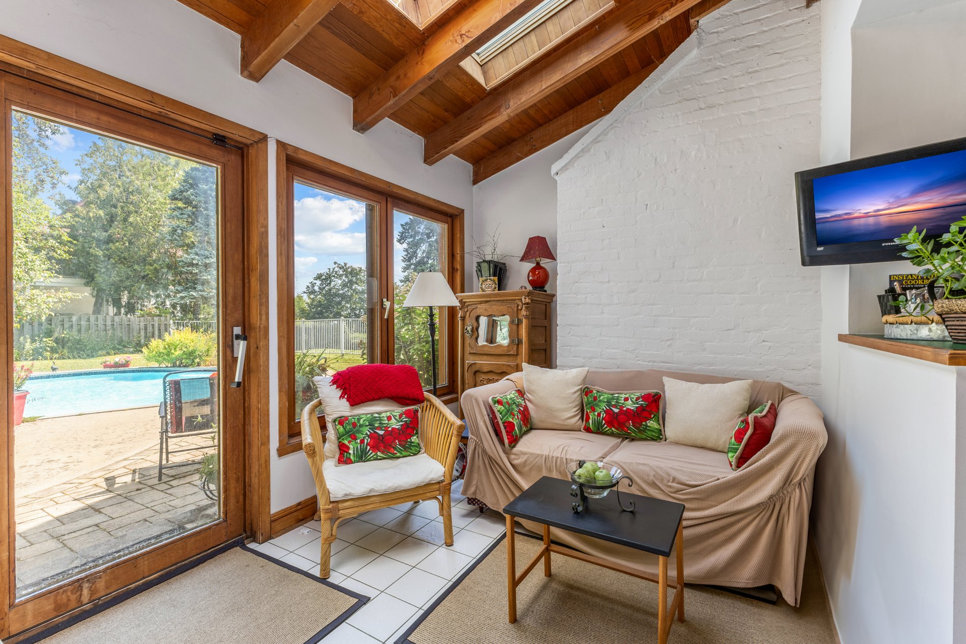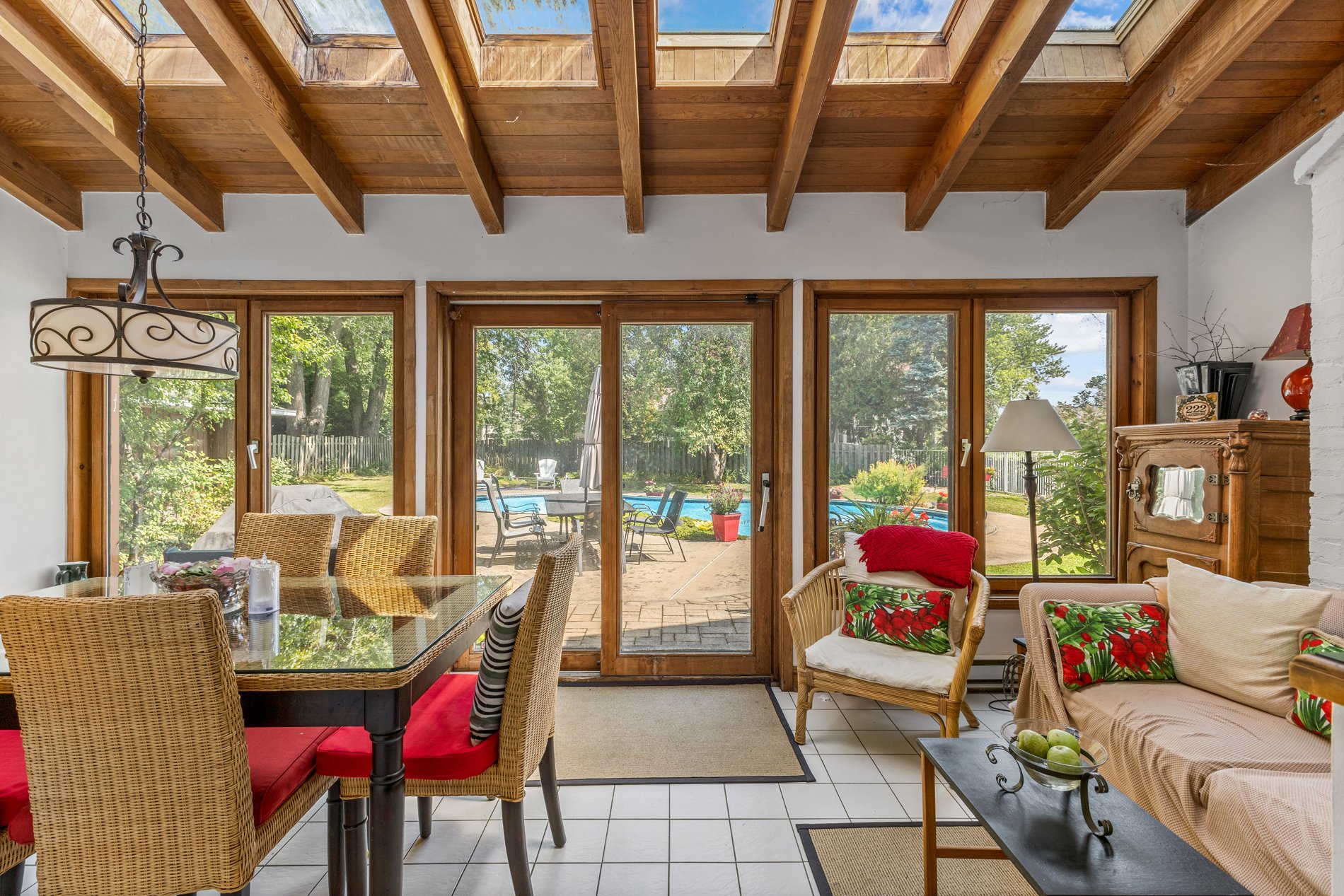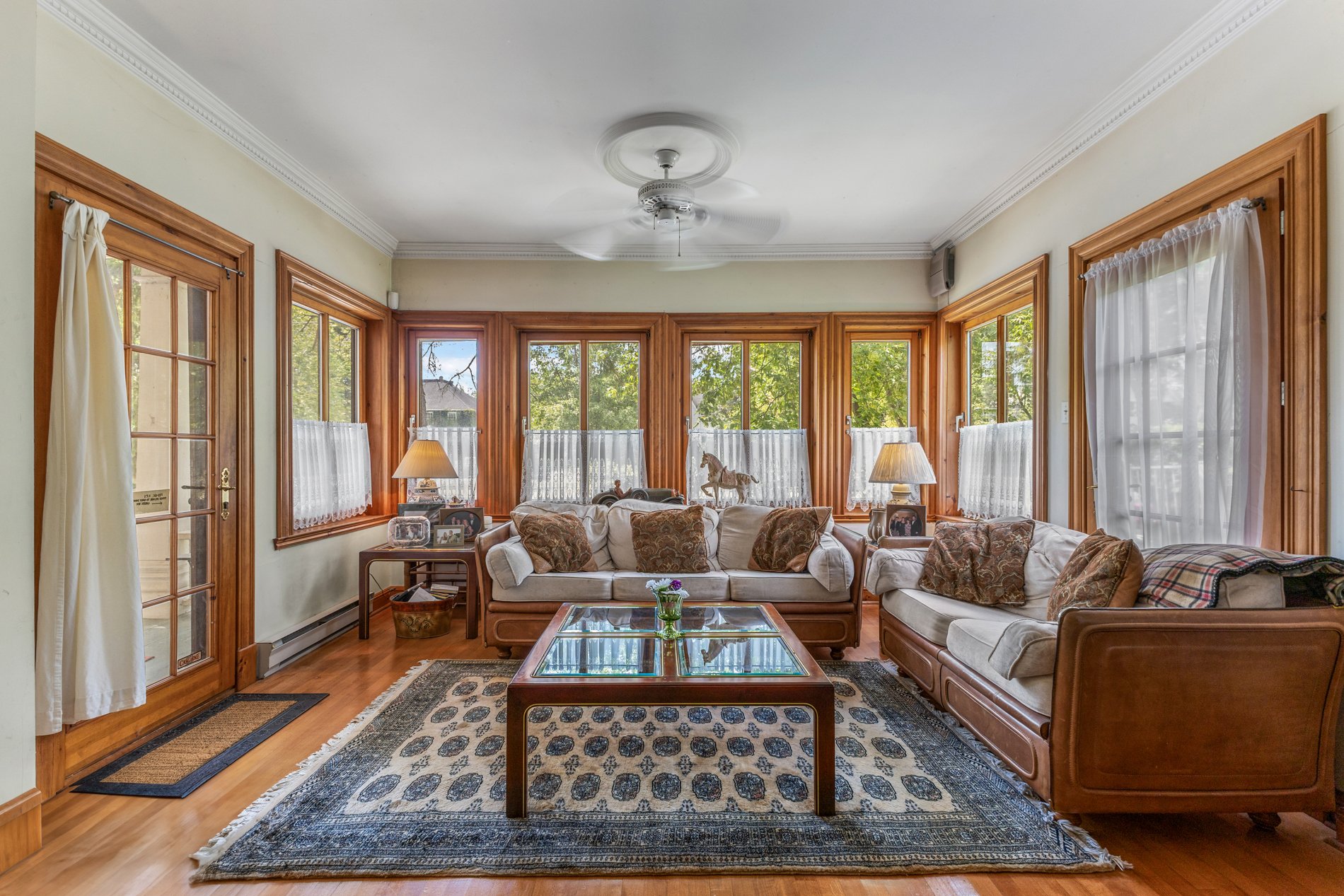 * Salon familial généreux entouré de fenêtres, menant à une véranda couverte confortable, un endroit parfait pour admirer un orage d'été en toute détente.