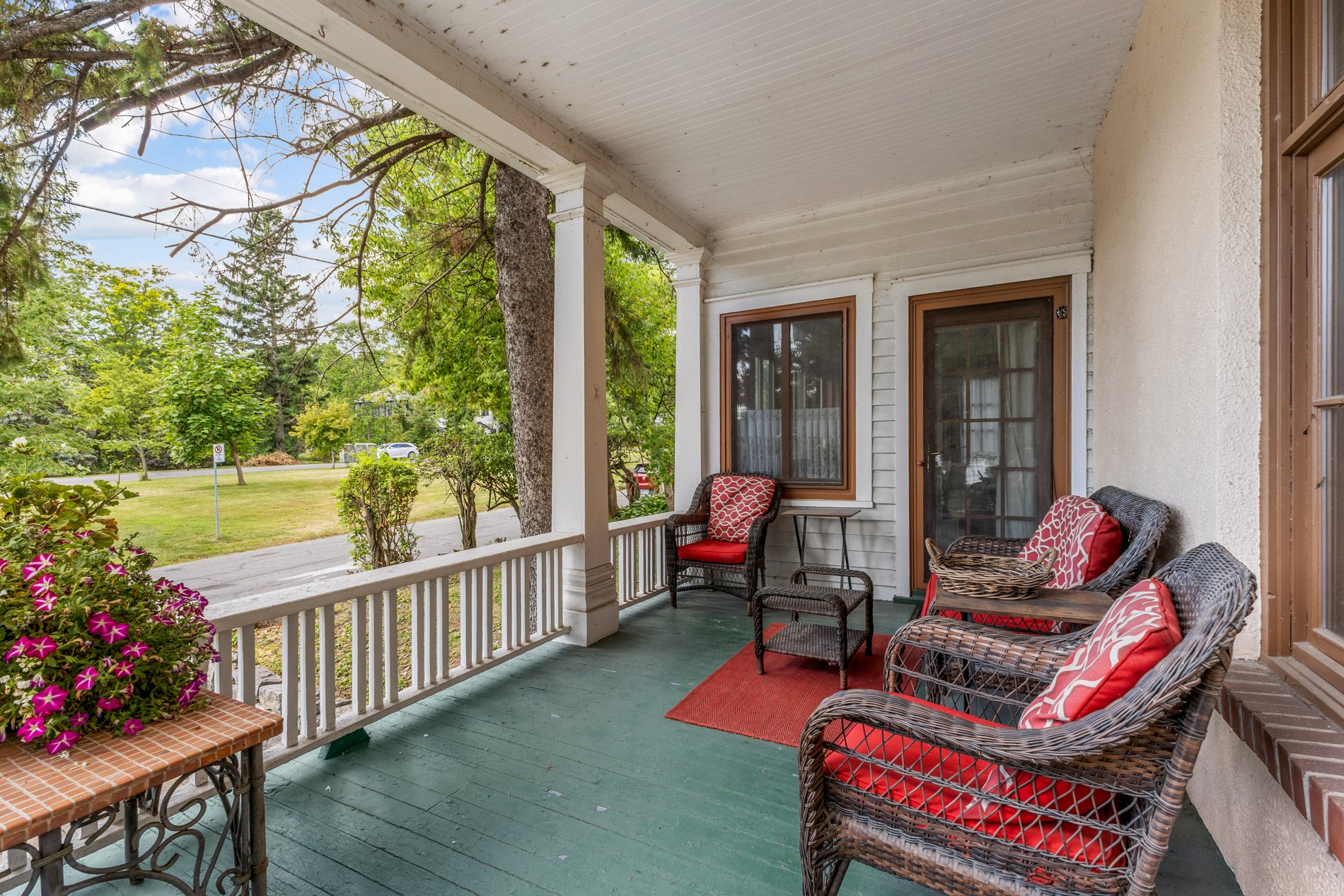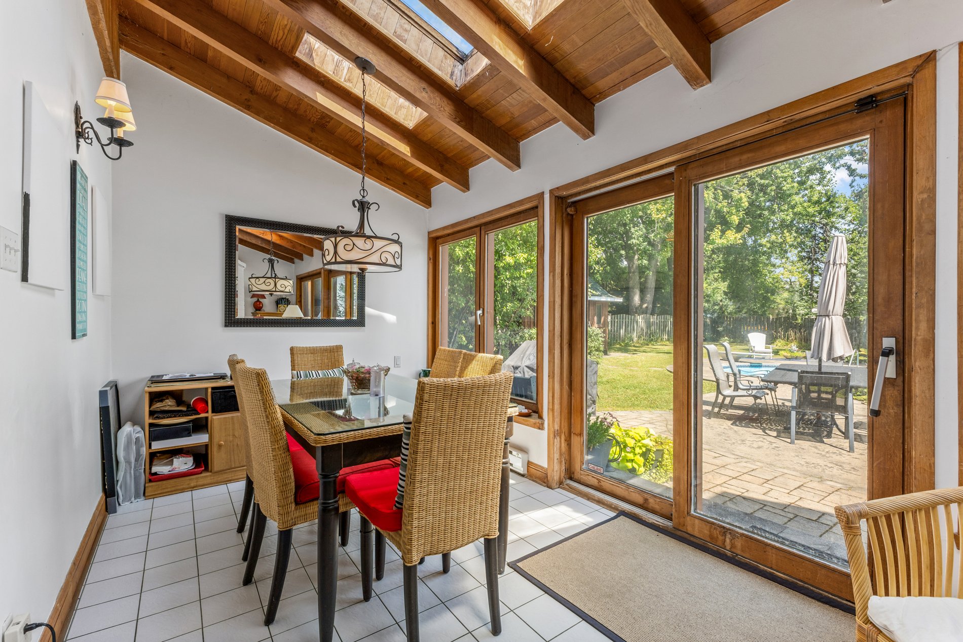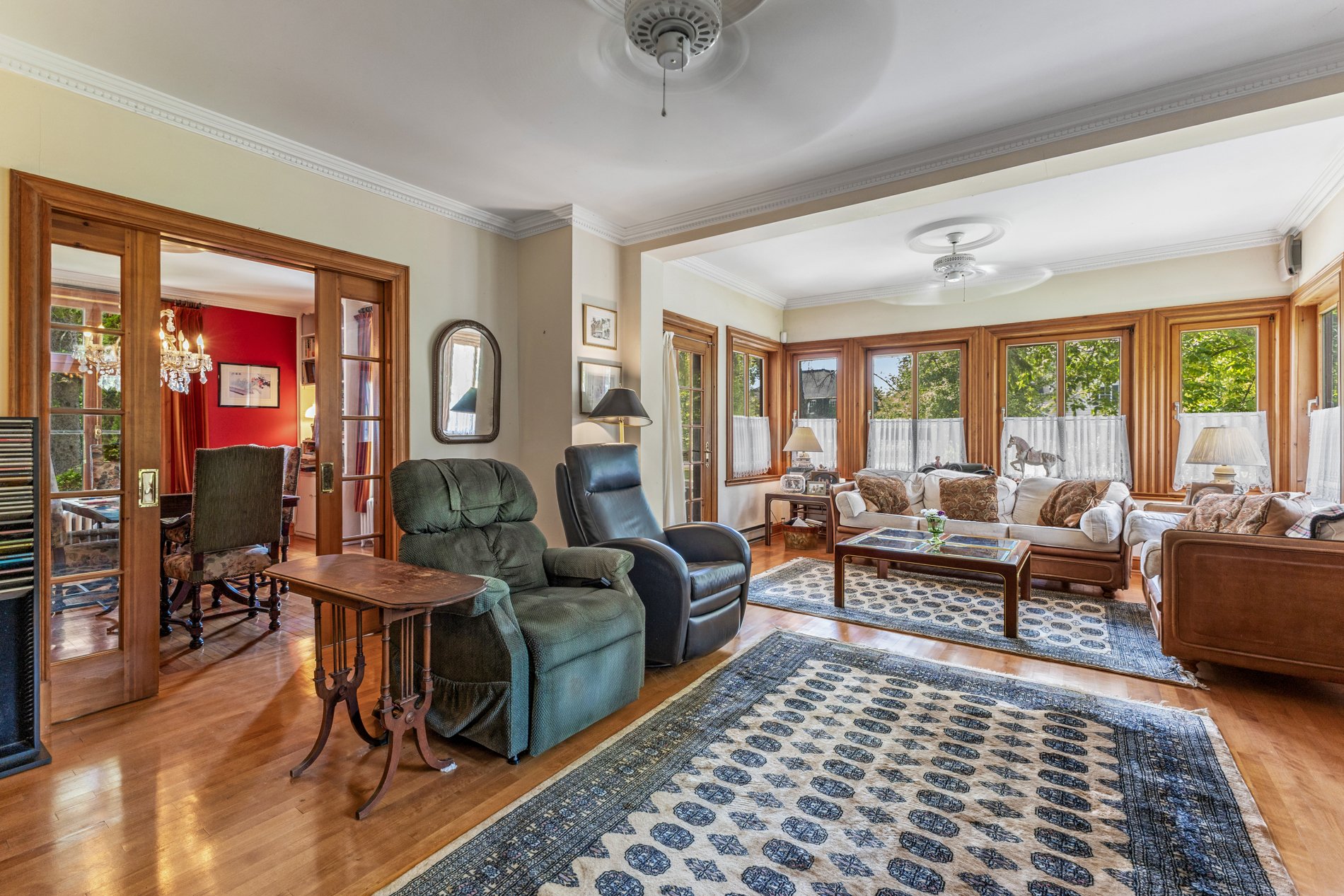 * Salon familial généreux entouré de fenêtres, menant à une véranda couverte confortable, un endroit parfait pour admirer un orage d'été en toute détente.