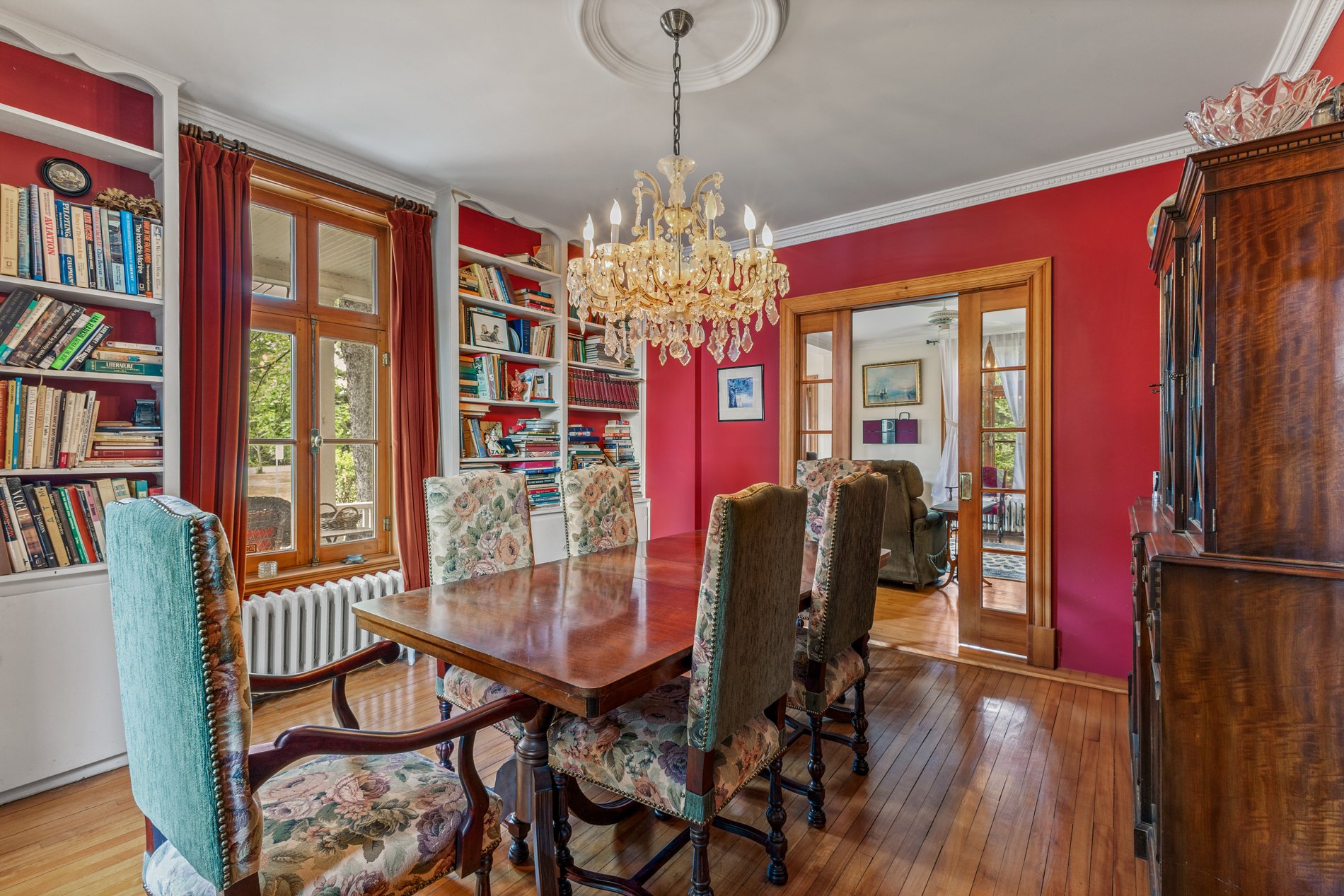 * Salle à manger formelle élégante avec étagères intégrées, boiseries raffinées et vues exceptionnelles sur l'eau, avec portes doubles françaises coulissantes ouvrant sur le salon familial.