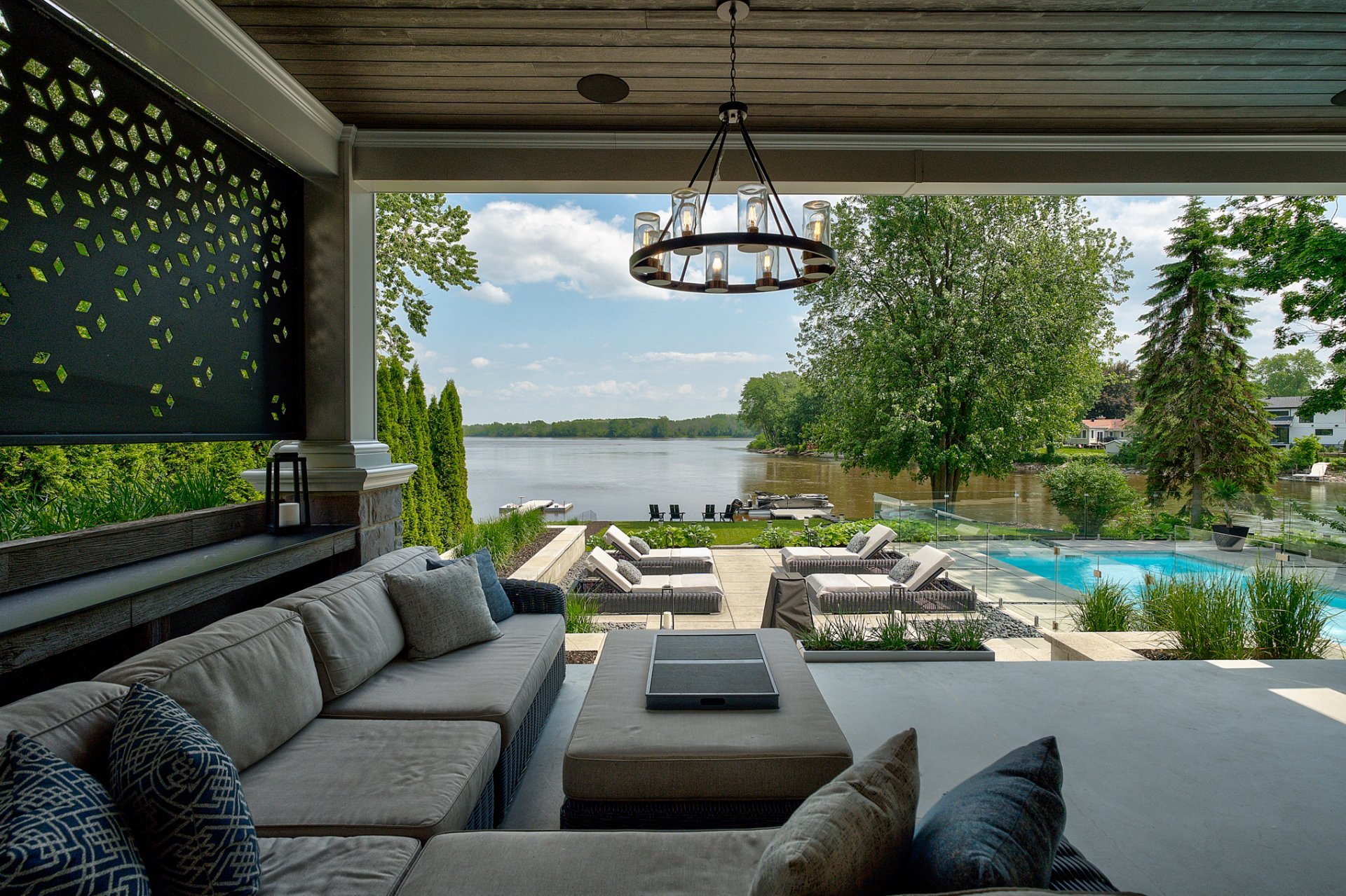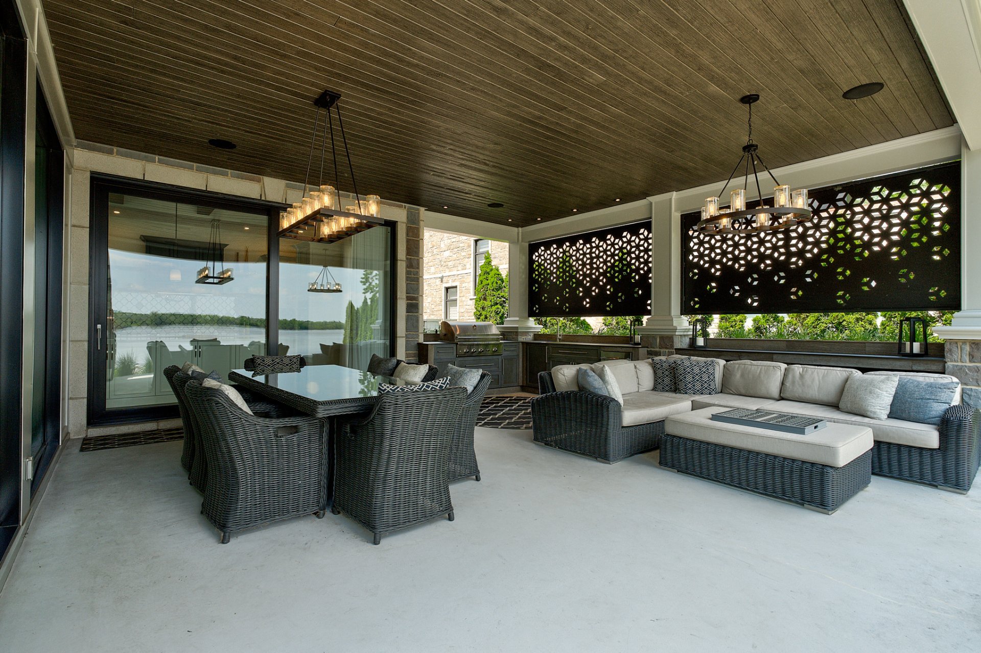 Terrasse couverte avec cuisinière extérieure haut de gamme complète et aire de vie spacieuse.