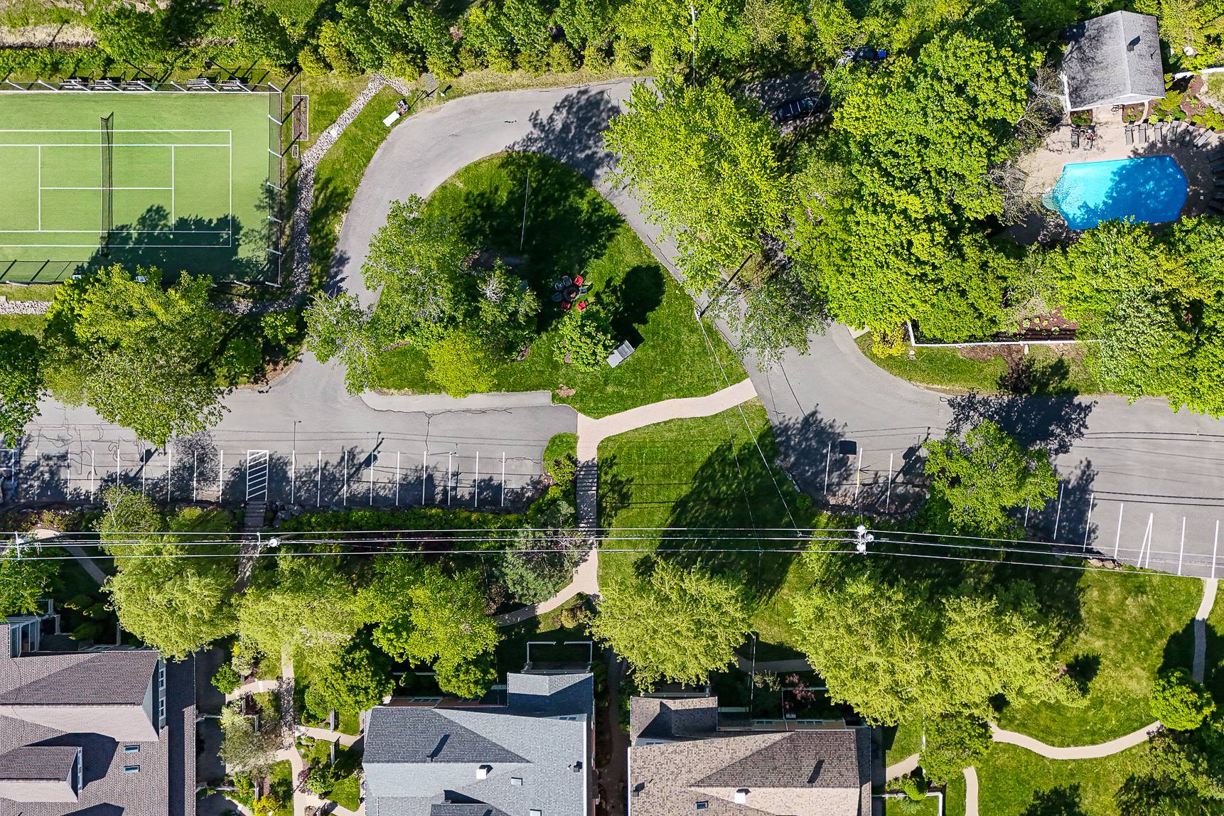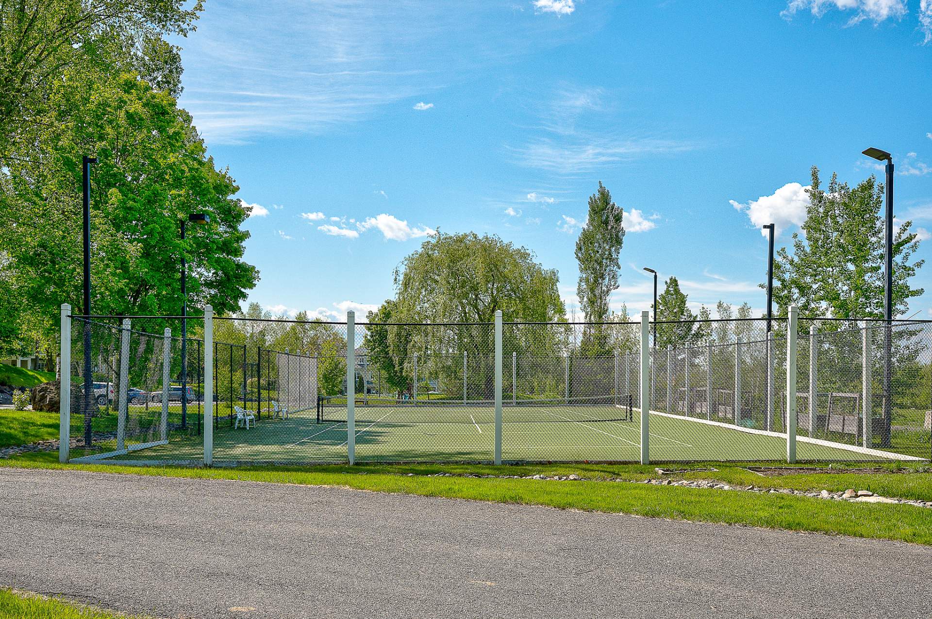 À l'extérieur, la grande terrasse couverte devient une extension naturelle de l'espace de vie intérieur, offrant un coin repas extérieur agréable avec vue imprenable sur l'aménagement paysager luxuriant et la nature environnante. L'espace communautaire du complexe est une véritable oasis de loisirs : une piscine creusée invitante entourée de jardins fleuris, un terrain de tennis privé, un gym, des aires de détente ombragées et un espace foyer extérieur idéal pour prolonger les soirées d'été sous les étoiles.