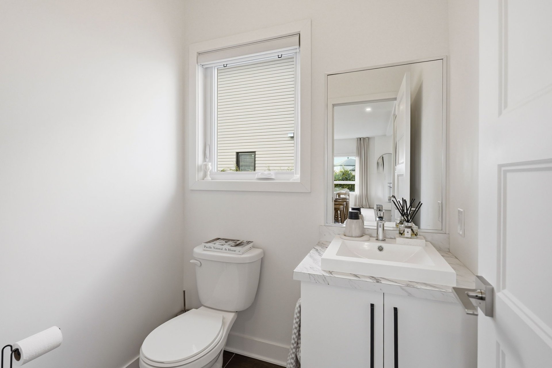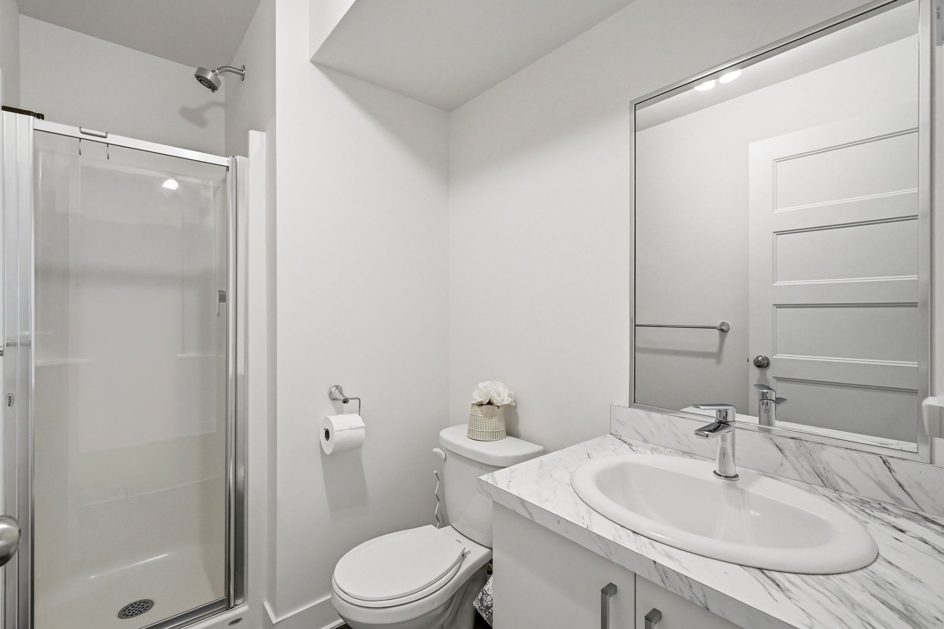 Le rez-de-chaussée propose une aire de vie ouverte où la lumière naturelle est omniprésente grâce à une généreuse fenestration. Le salon, la salle à manger et la cuisine s'enchaînent naturellement, créant un espace convivial et fluide. Une salle d'eau complète s'y ajoute, pratique et bien intégrée.
