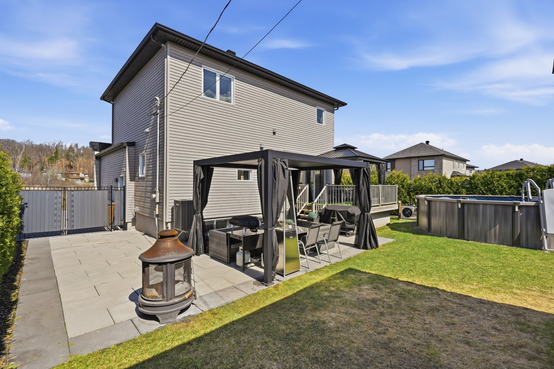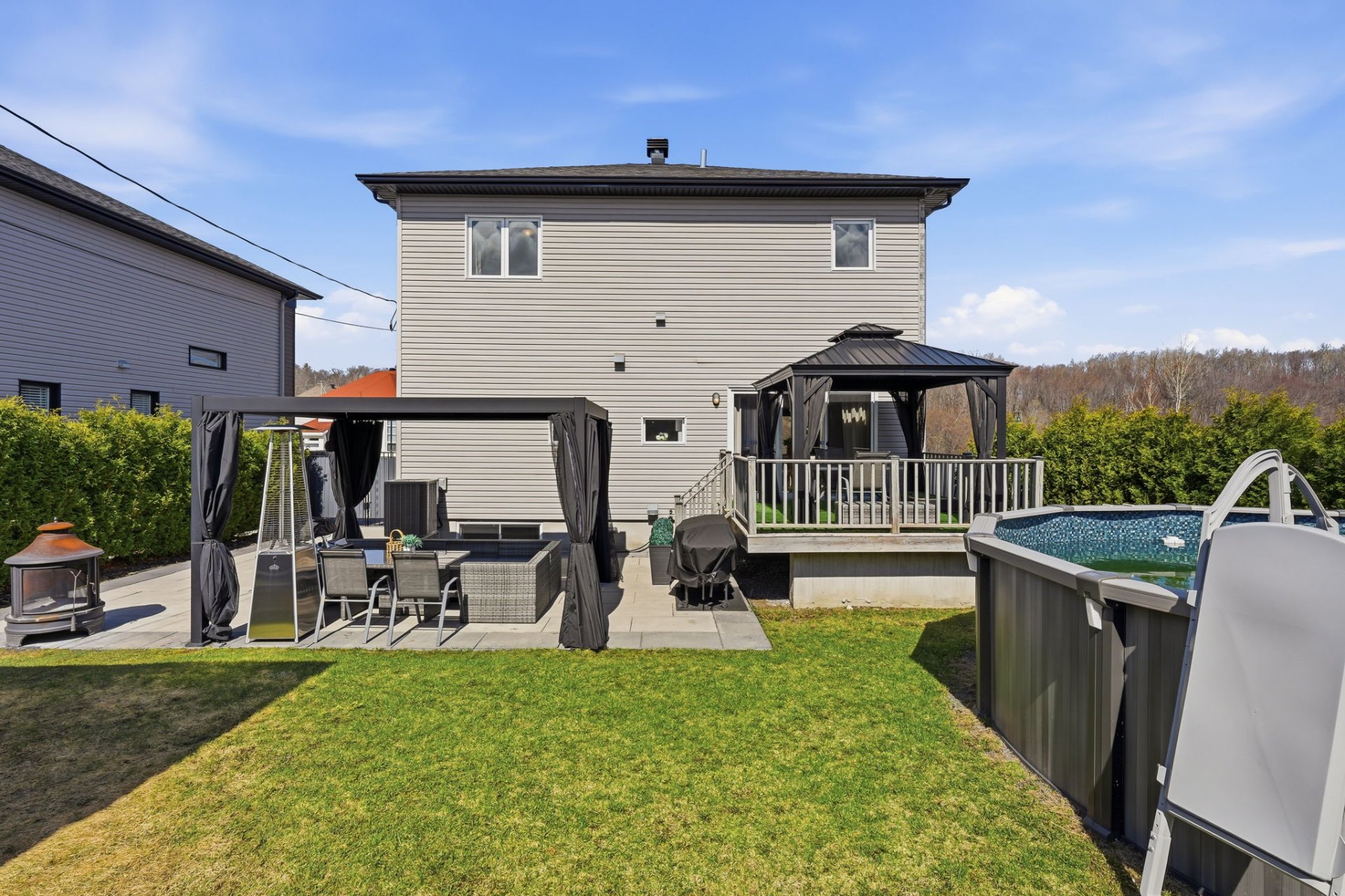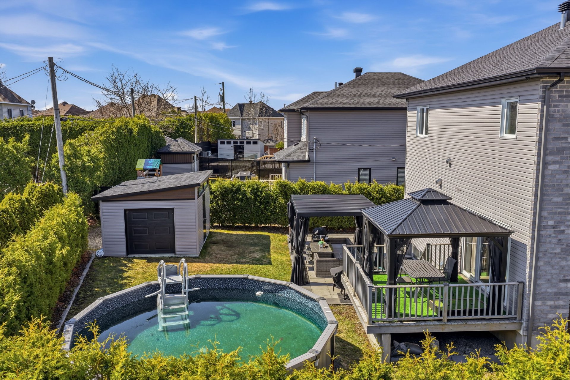 À l'extérieur, la cour arrière est entièrement aménagée pour profiter pleinement de la saison estivale avec piscine hors terre, gazebo, pergola et cabanon ainsi qu'un garage intégré. De plus, en face de la maison, vous bénéficiez d'un boisé ainsi que d'une zone verte, offrant un environnement paisible et une belle intimité.