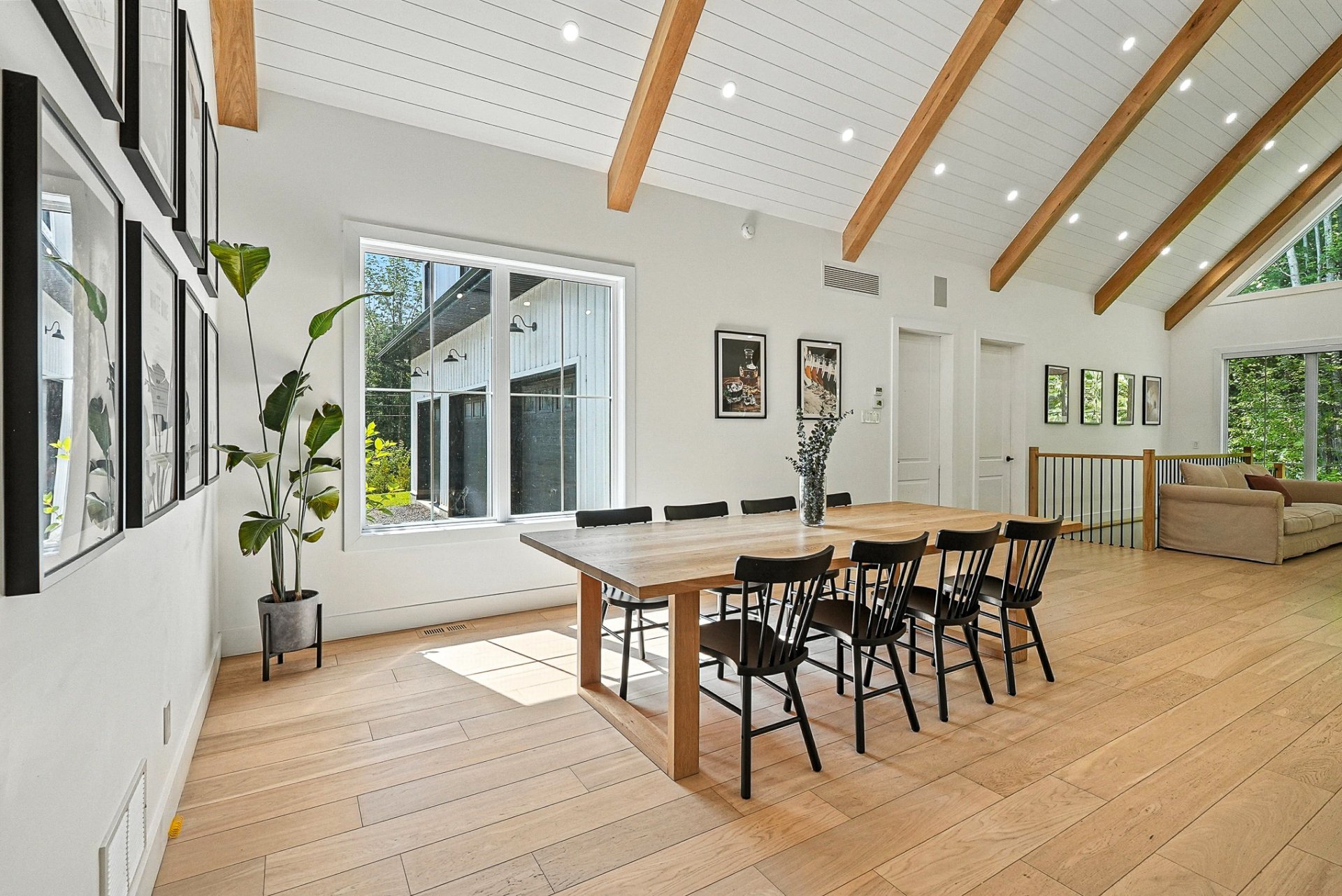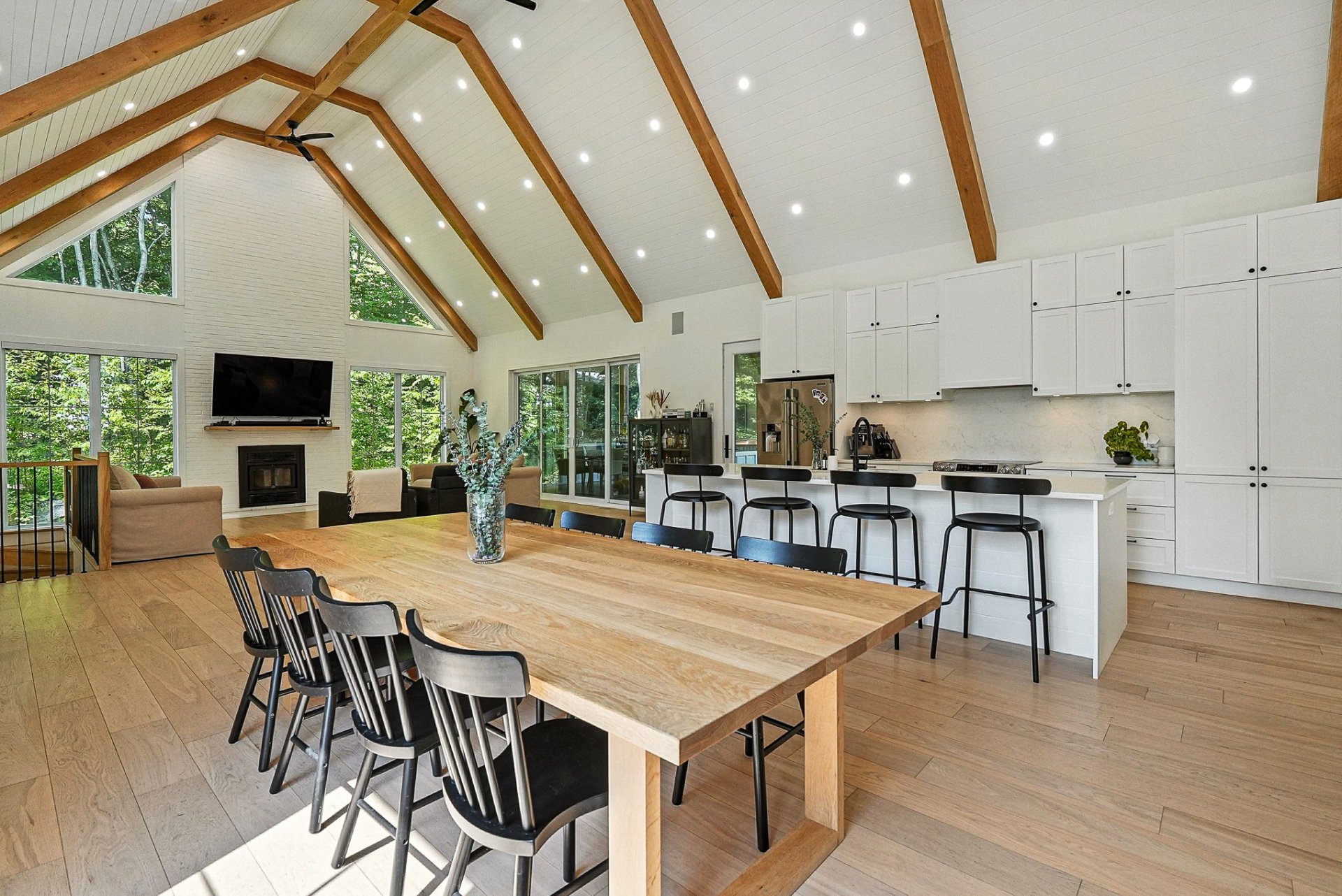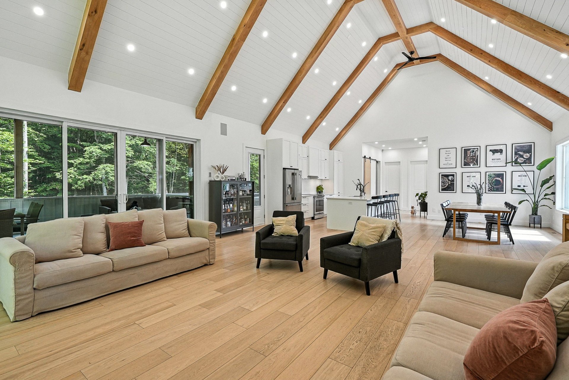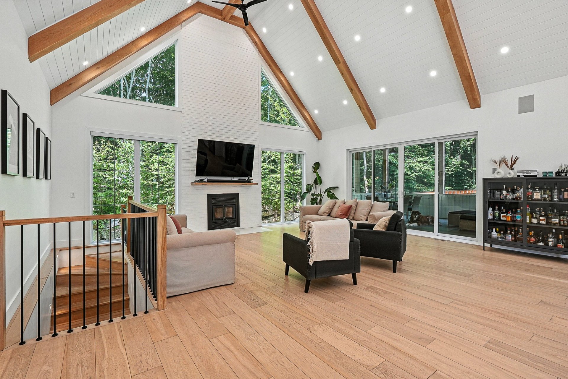 -Le salon est rehaussé d'un haut plafond remarquable, alliée avec des fenêtres qui procurent une luminosité abondante, accompagné d'un foyer au bois qui confère une atmosphère chaleureuse.
