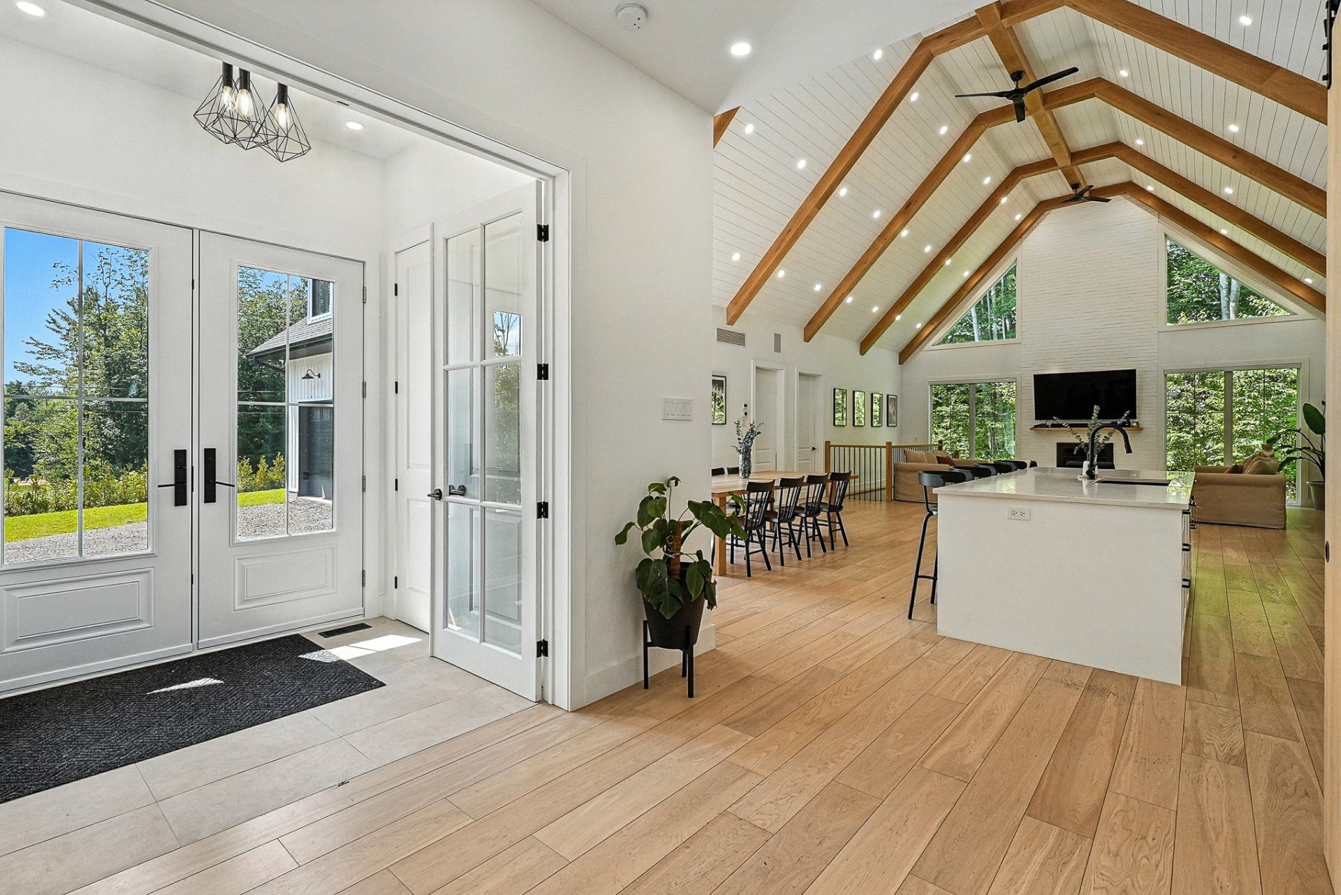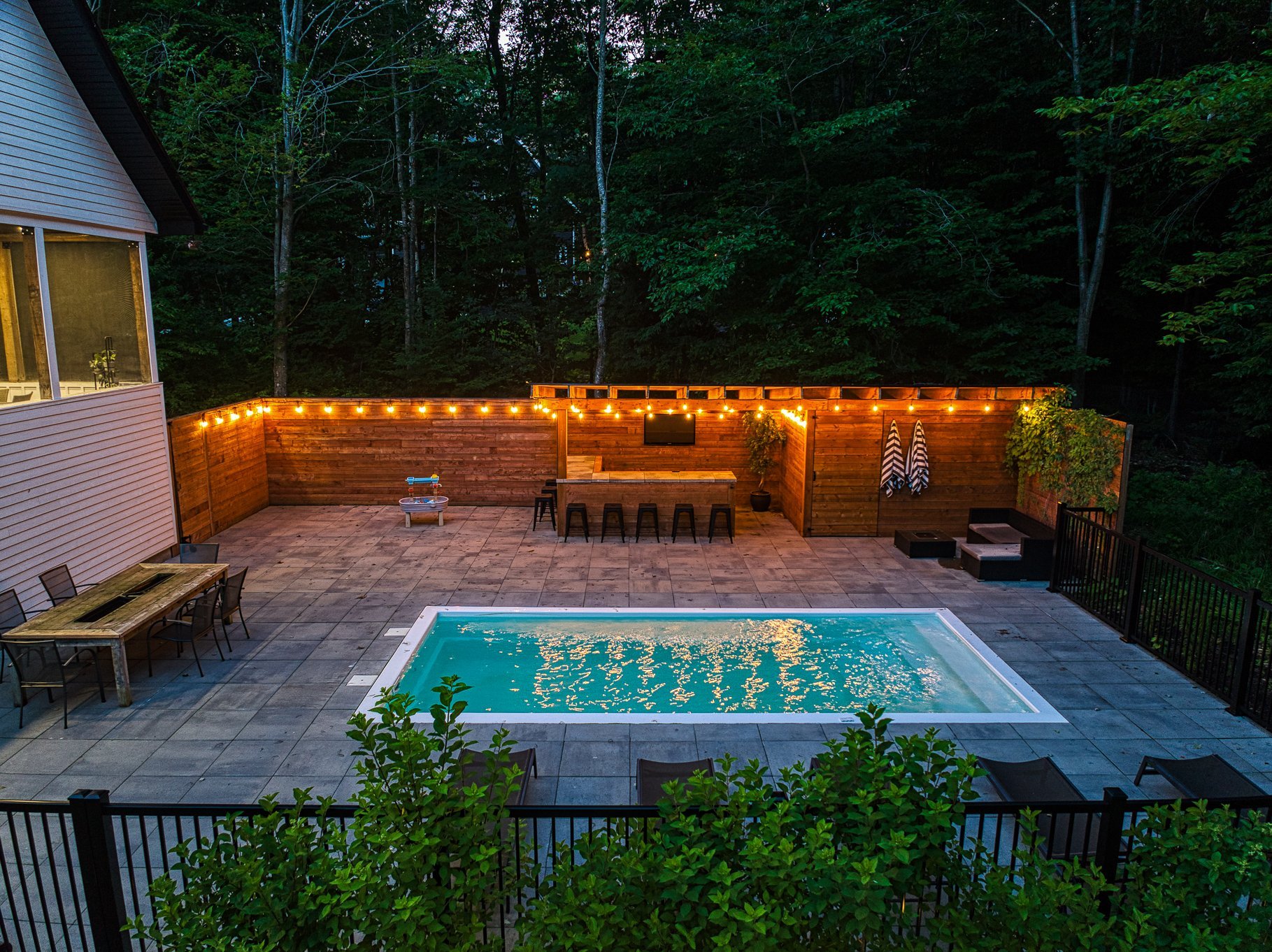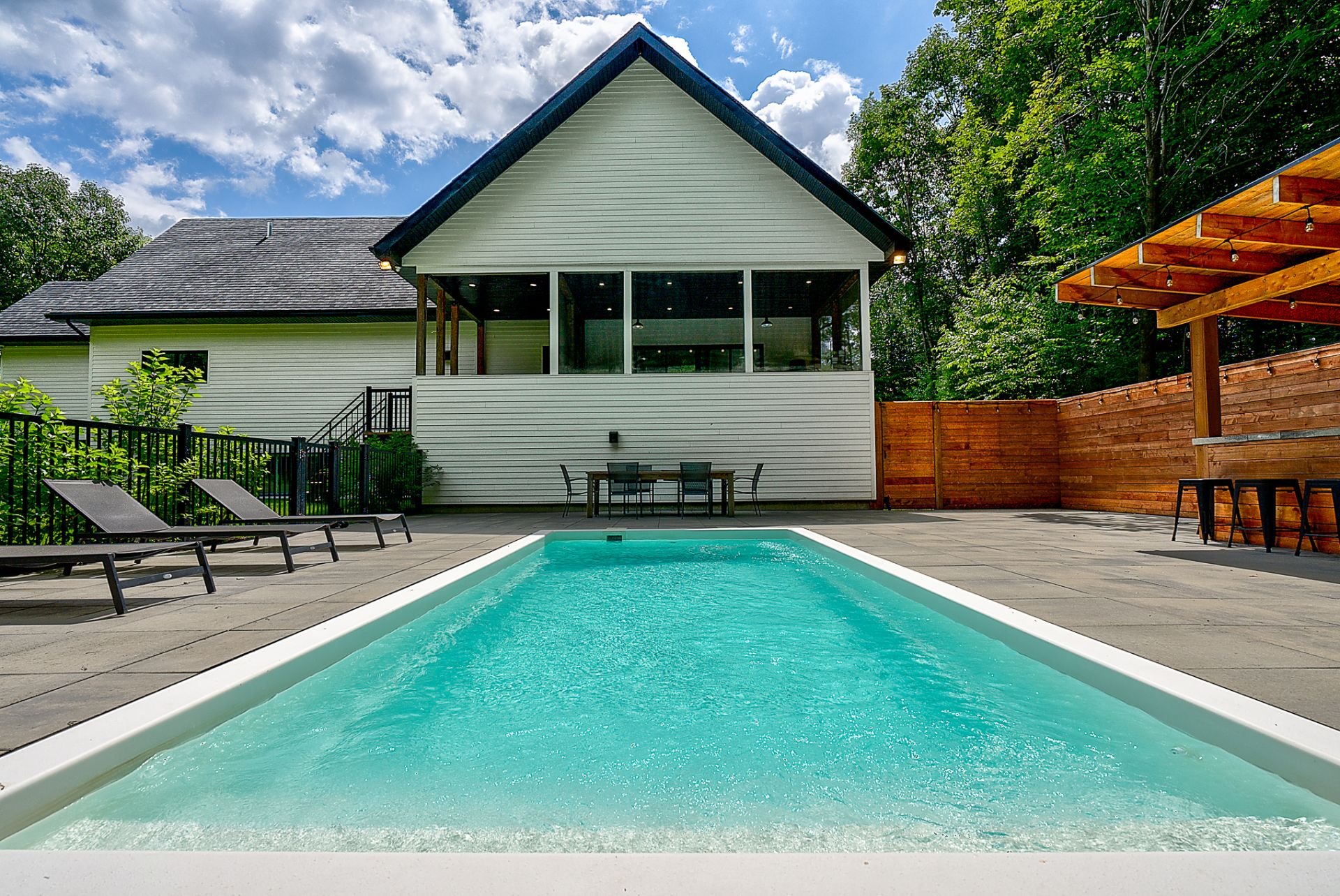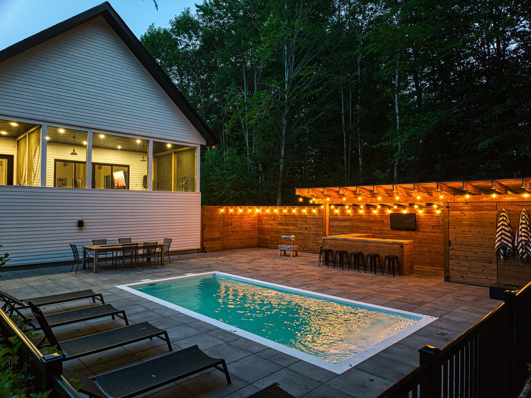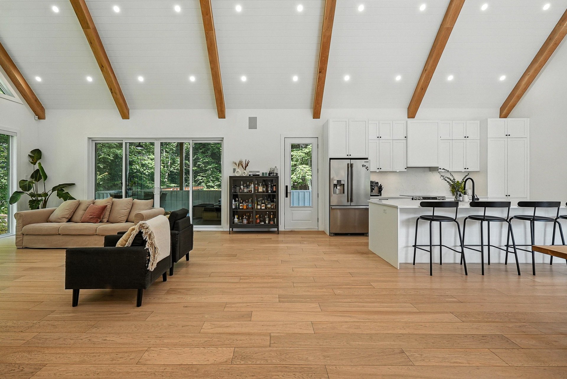 -Le salon est rehaussé d'un haut plafond remarquable, alliée avec des fenêtres qui procurent une luminosité abondante, accompagné d'un foyer au bois qui confère une atmosphère chaleureuse.