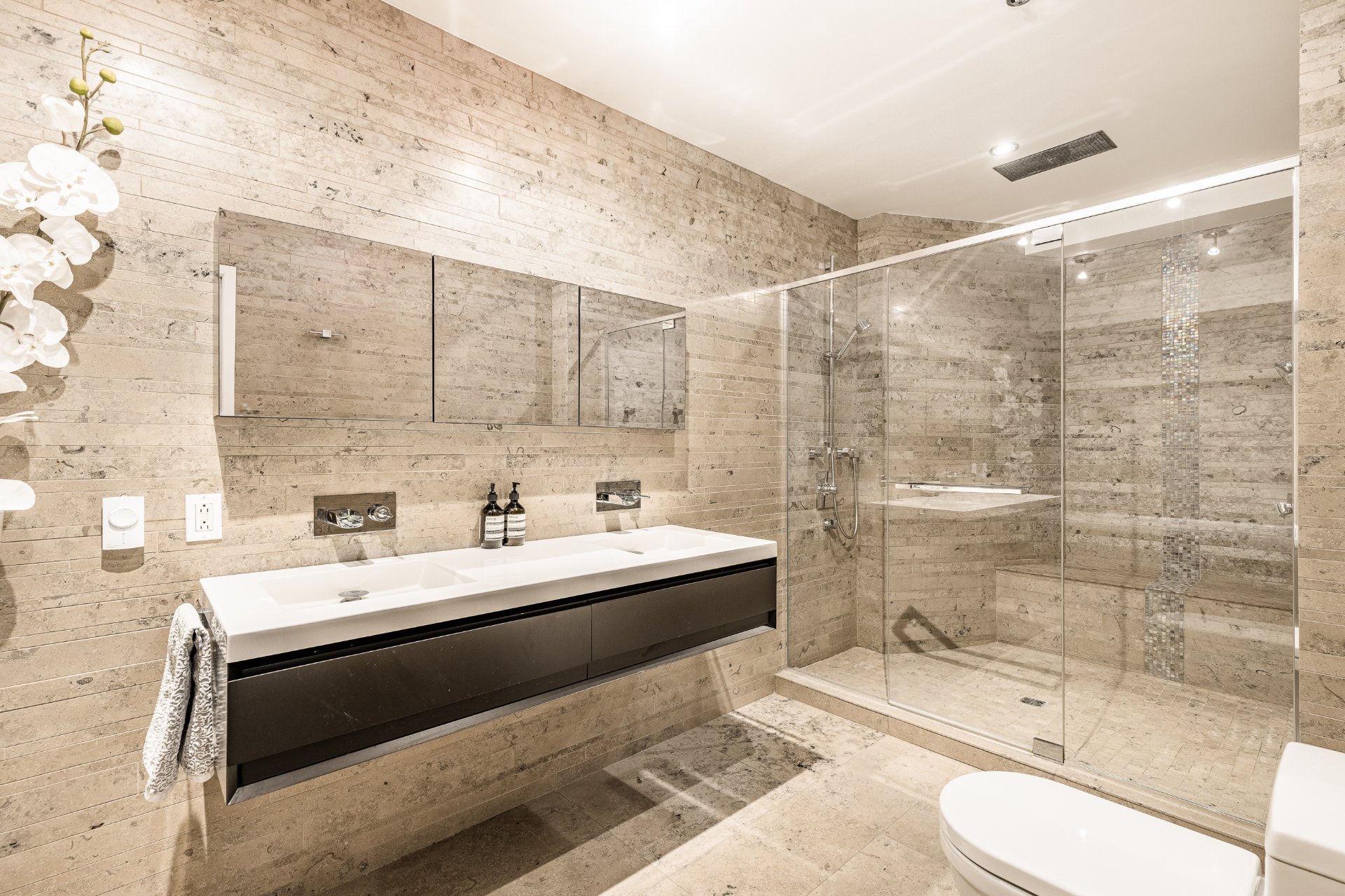 - Suite principale: salle de bain des maîtres en pierre naturelle Jura Grey, plancher chauffant, double lavabo, baignoire et douche indépendante avec jets hydromassants