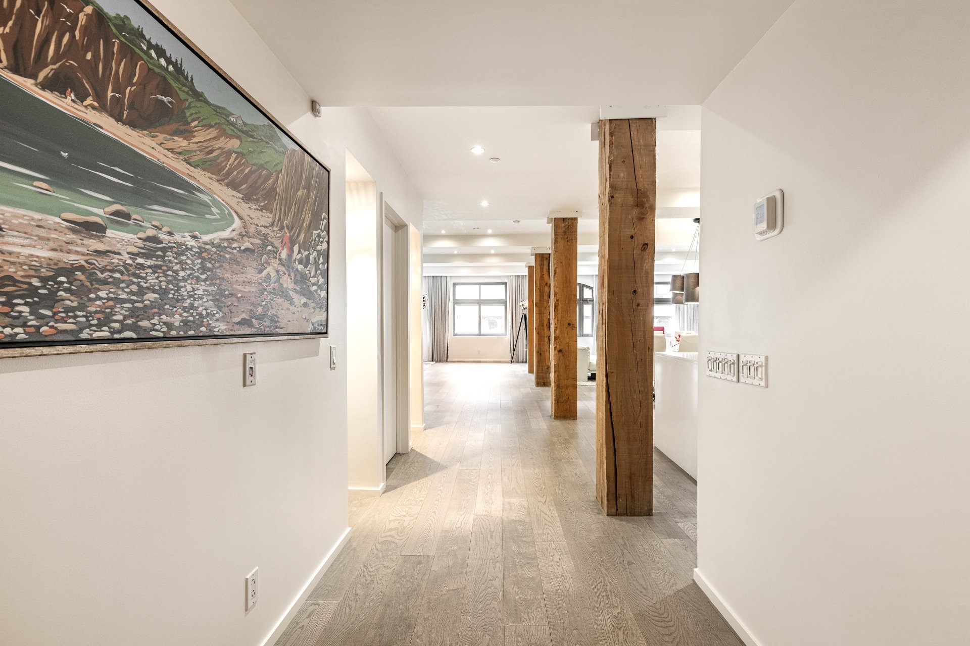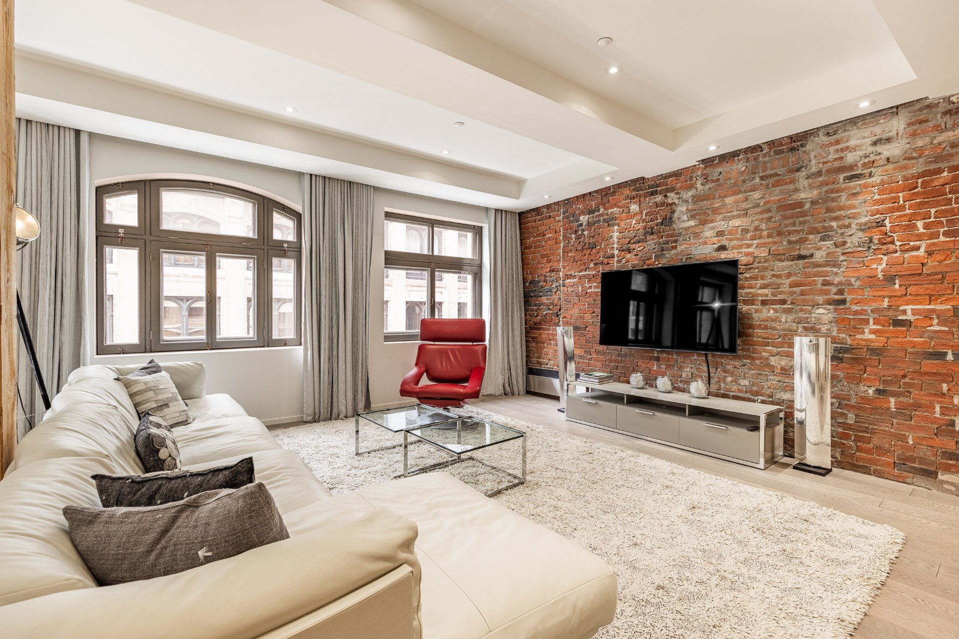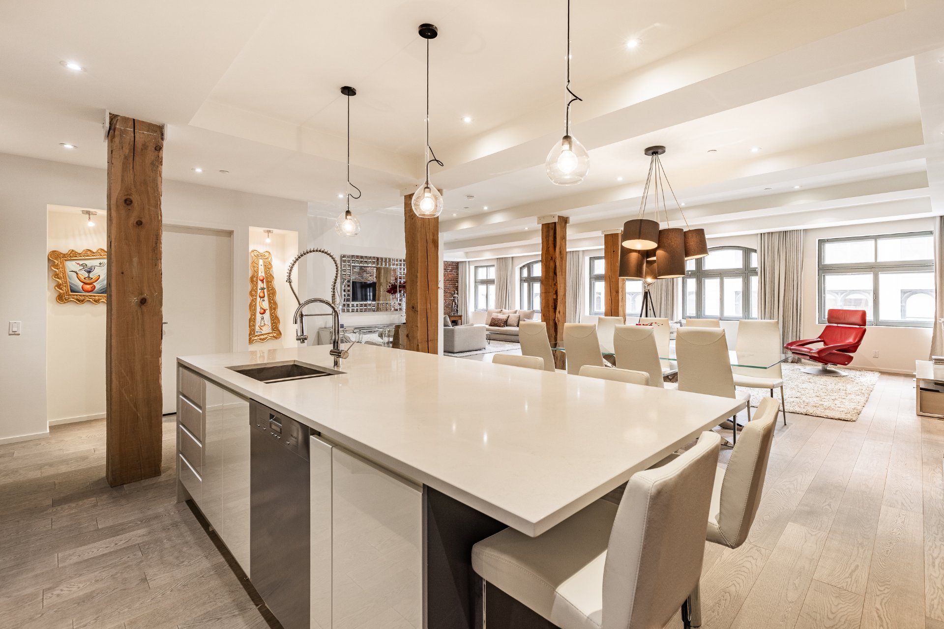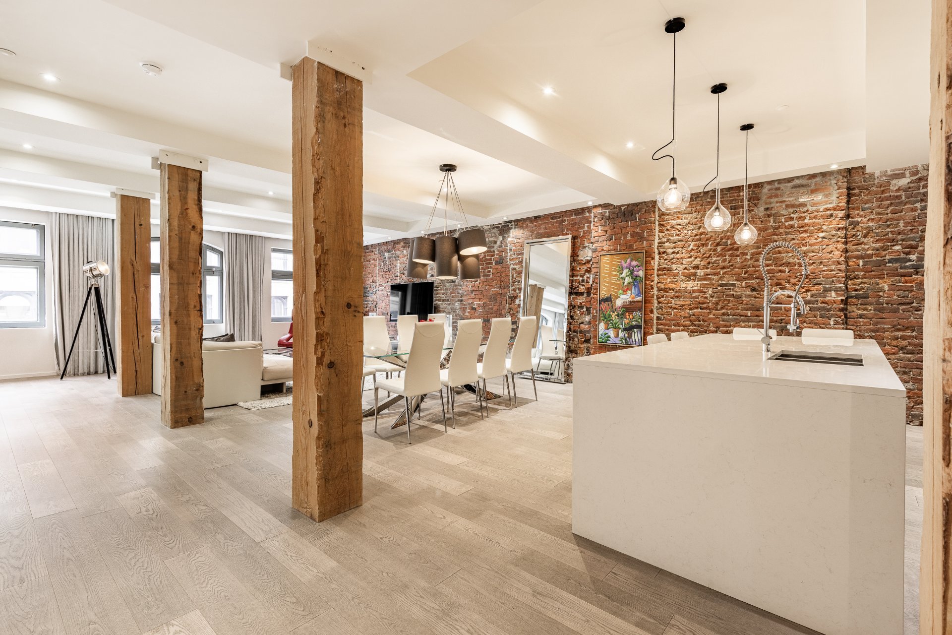 Cette unité d'exception à la Cité Nouveau Monde offre un espace de vie ouvert et spectaculaire, rehaussé par une fenestration hors du commun sur la rue St-Paul.