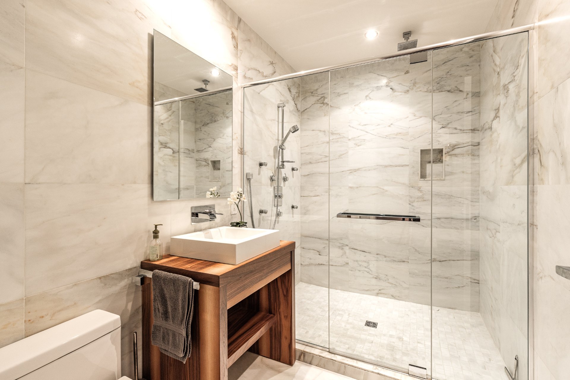 - Deuxième salle de bain en marbre Calacatta Cream delicato, cabinet Wet Style en noyer, douche indépendant