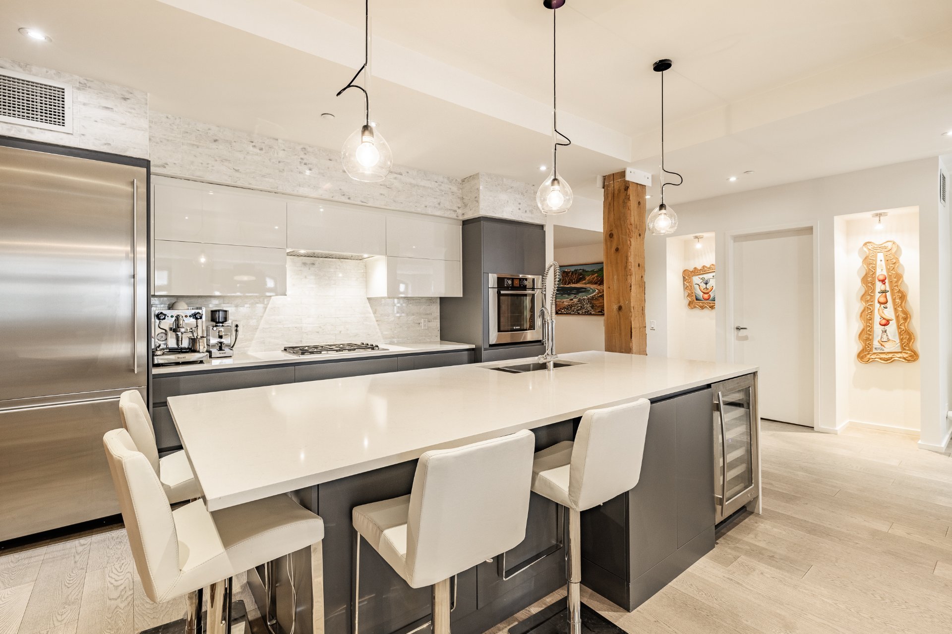 - Cuisine gastronomique sur mesure Cuisine Denis Couture, laque grise mate et blanche brillante, à aire ouverte