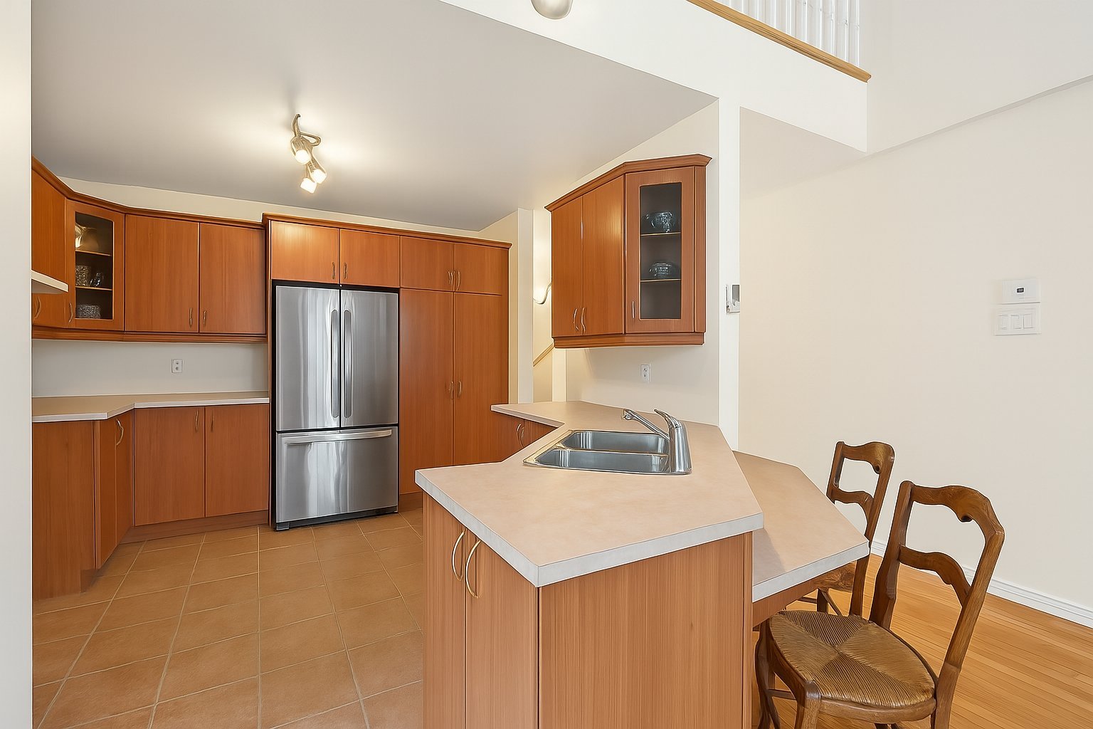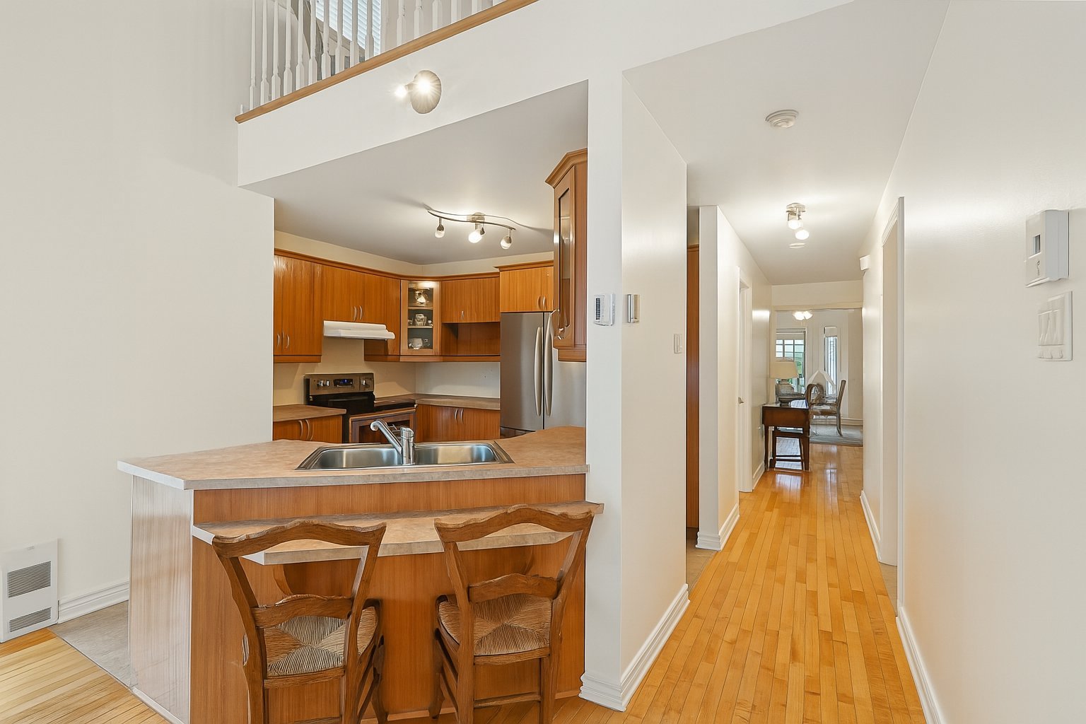 Dès votre arrivée, la vaste aire ouverte baignée de soleil impressionne par son orientation plein sud et sa vue panoramique spectaculaire sur la rivière des Prairies. Le salon chaleureux avec foyer au gaz, la salle à manger conviviale et la cuisine fonctionnelle s'harmonisent dans un espace à la fois élégant et accueillant, idéal pour recevoir ou simplement profiter du quotidien.