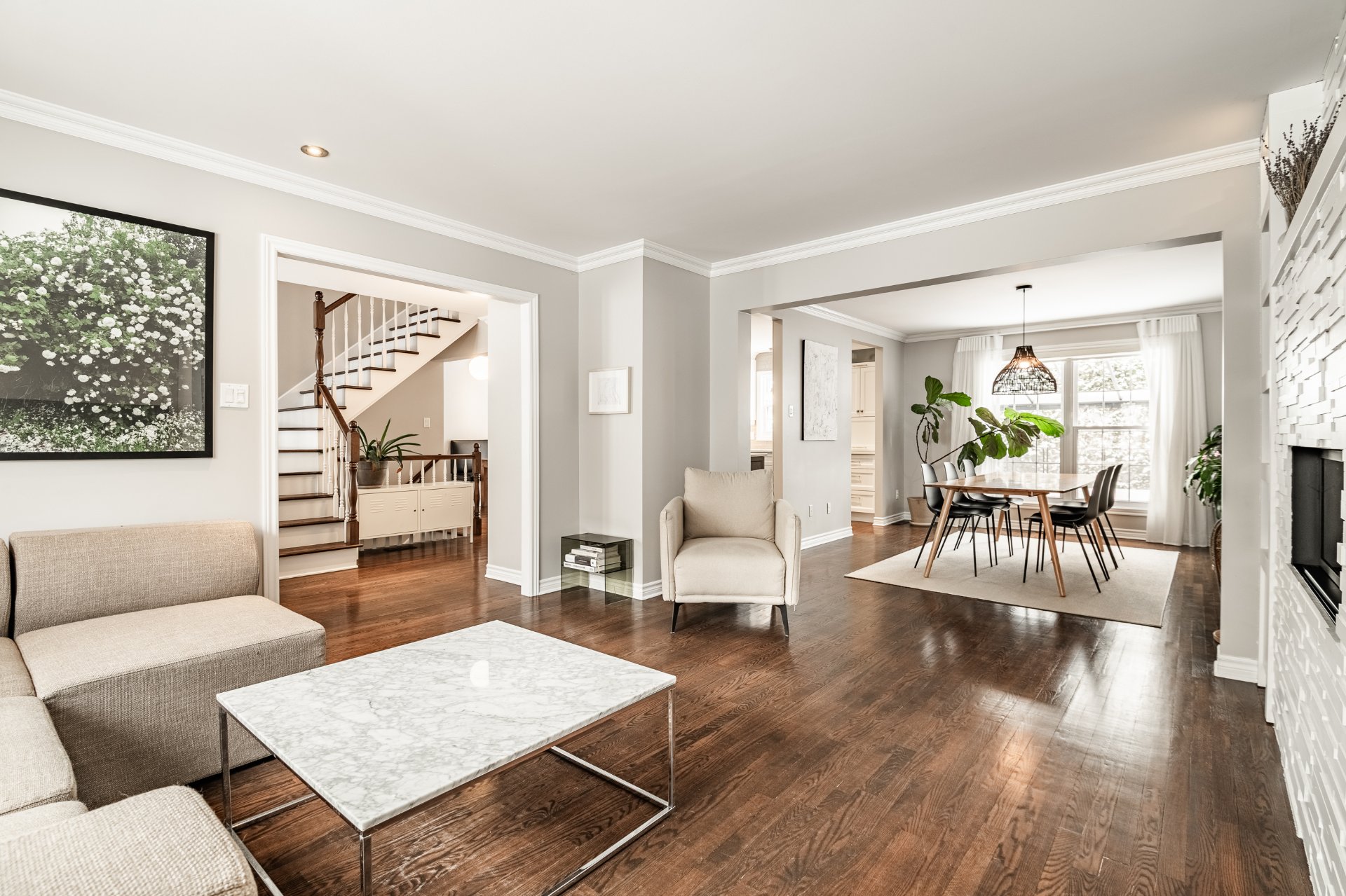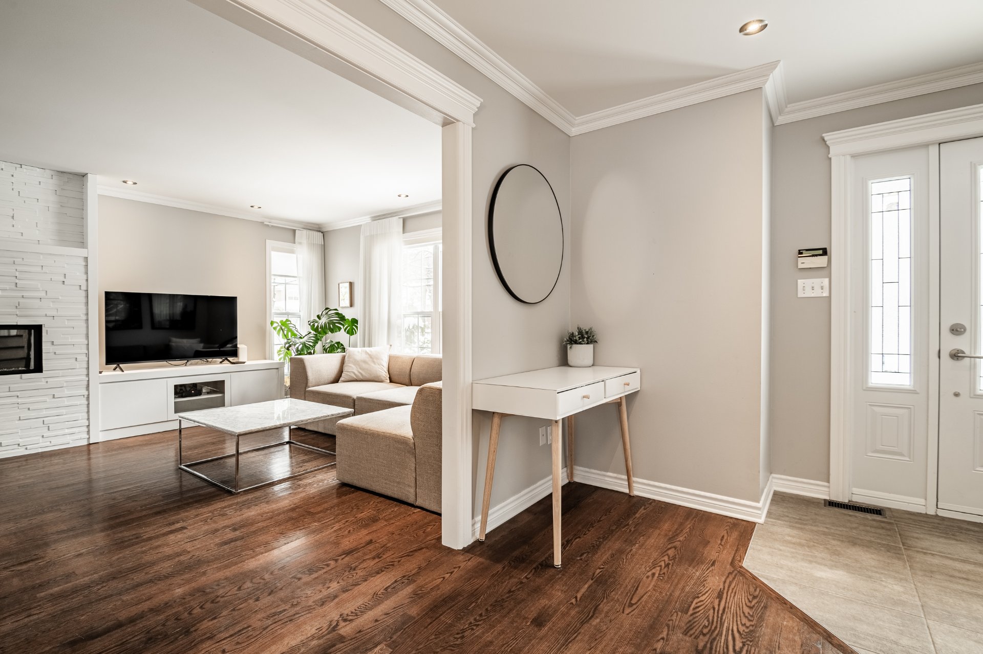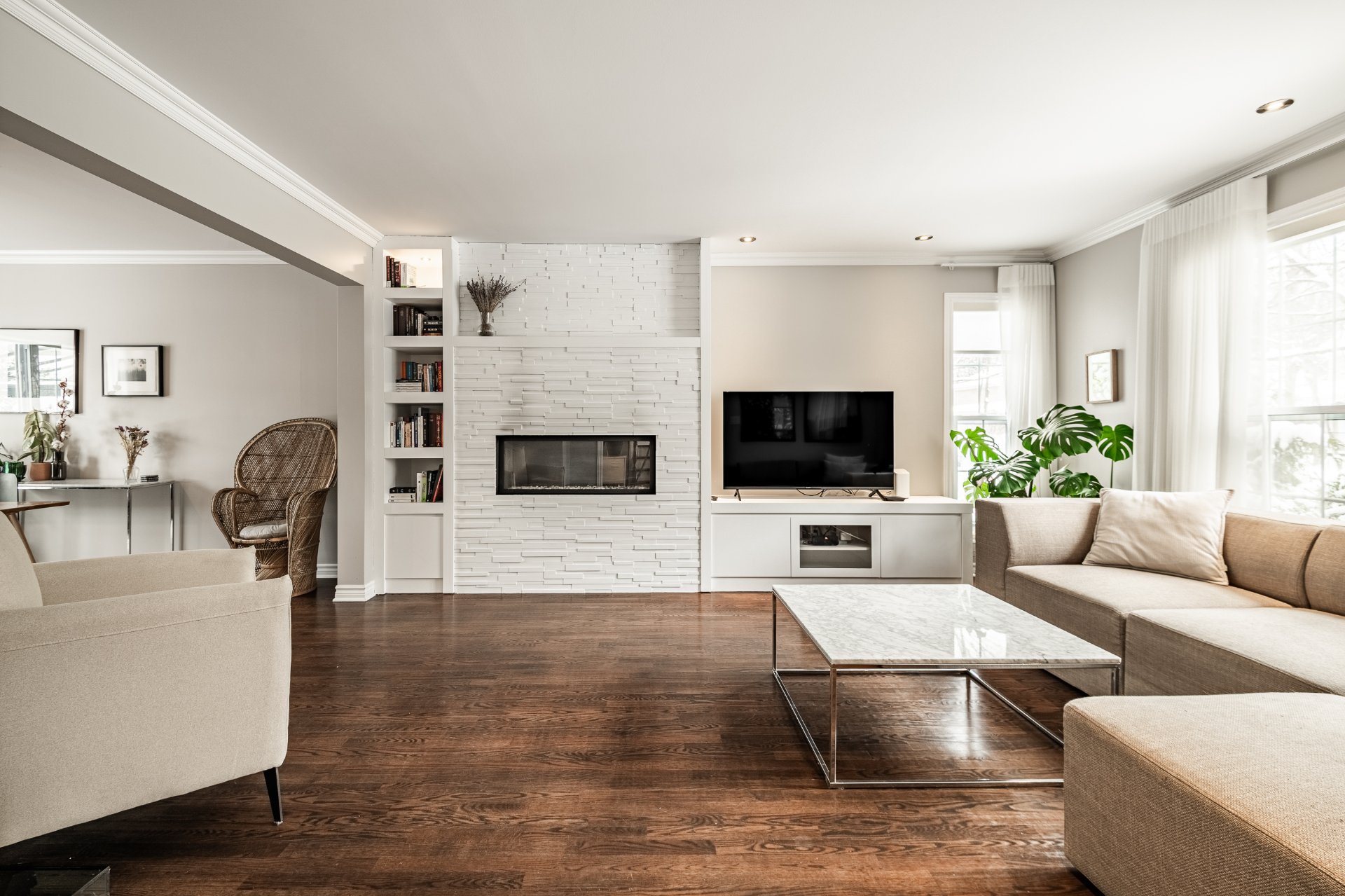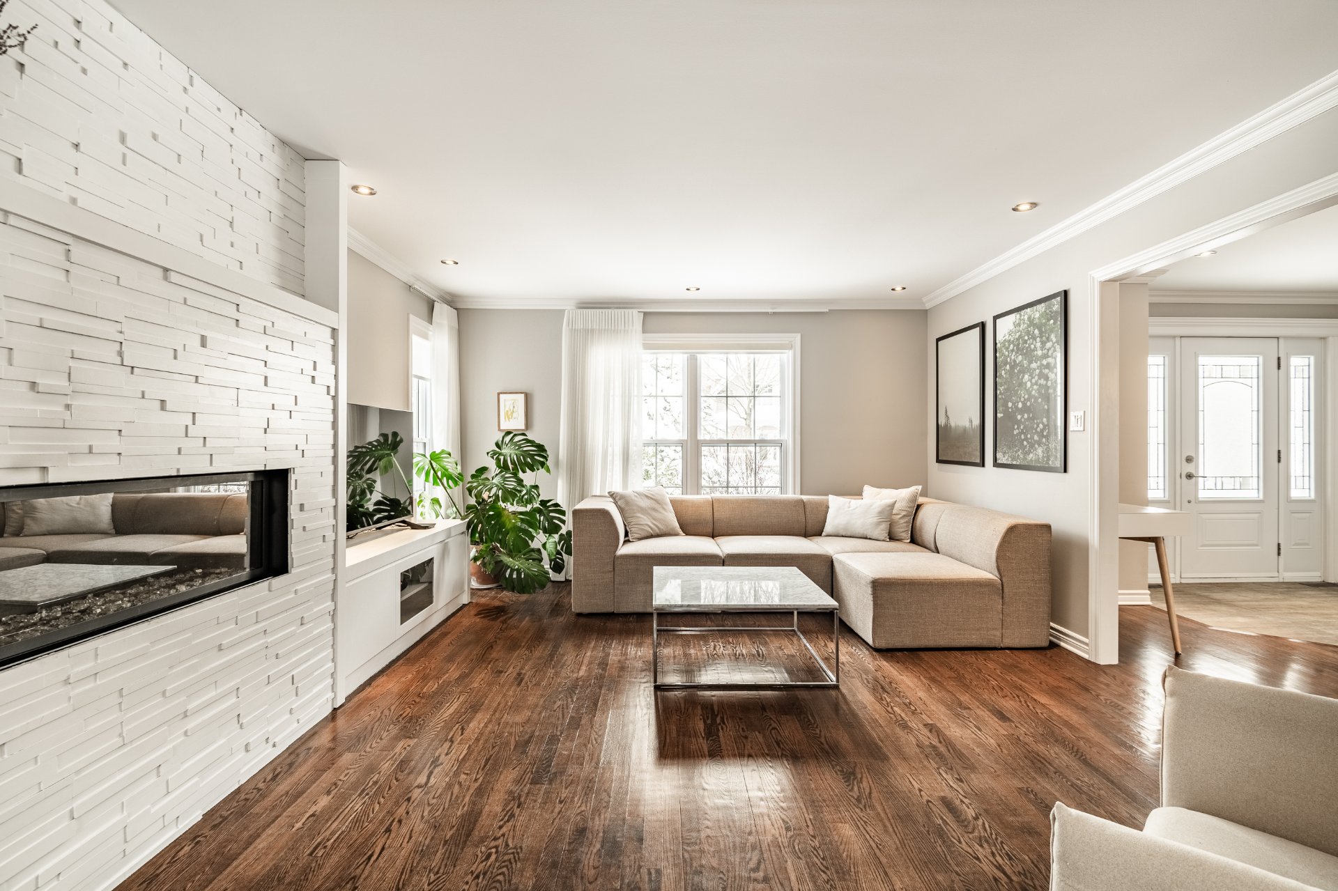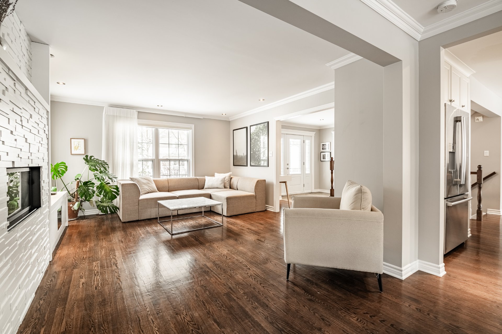 * Fenestration abondante et surdimensionnée au salon avec foyer au gaz;
