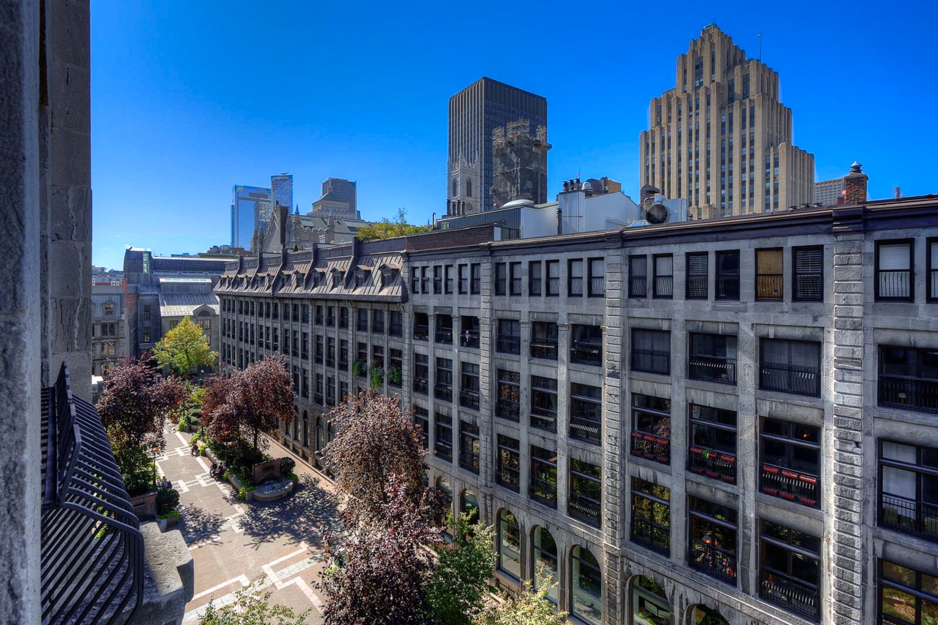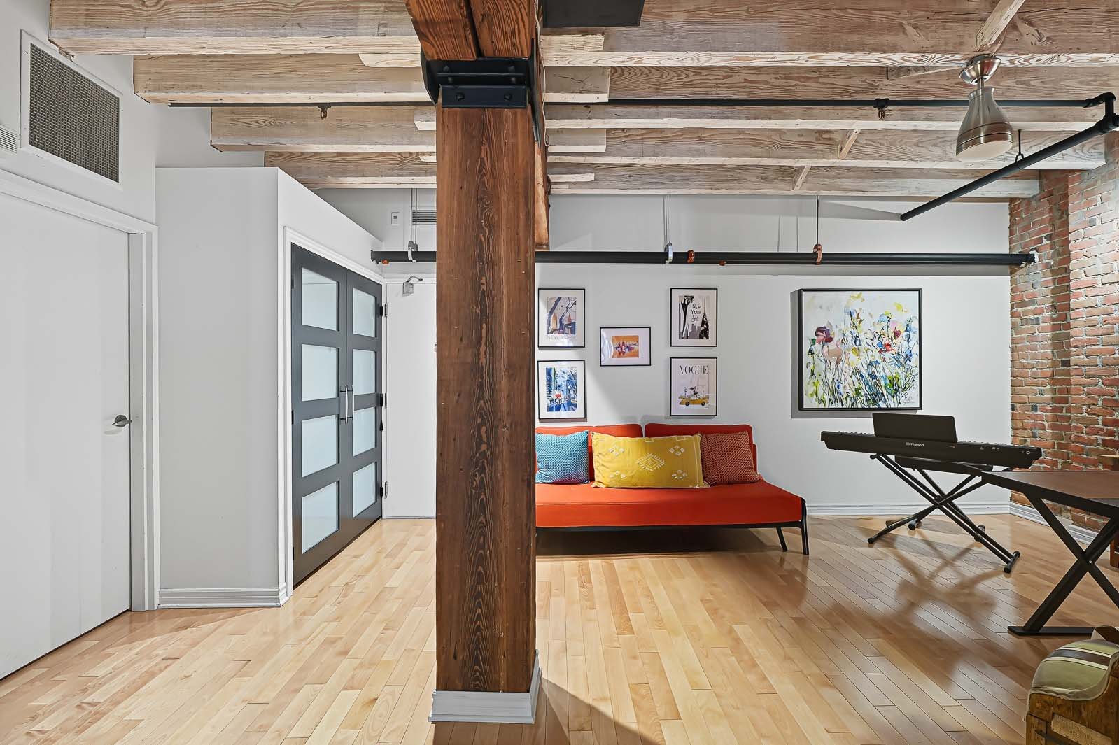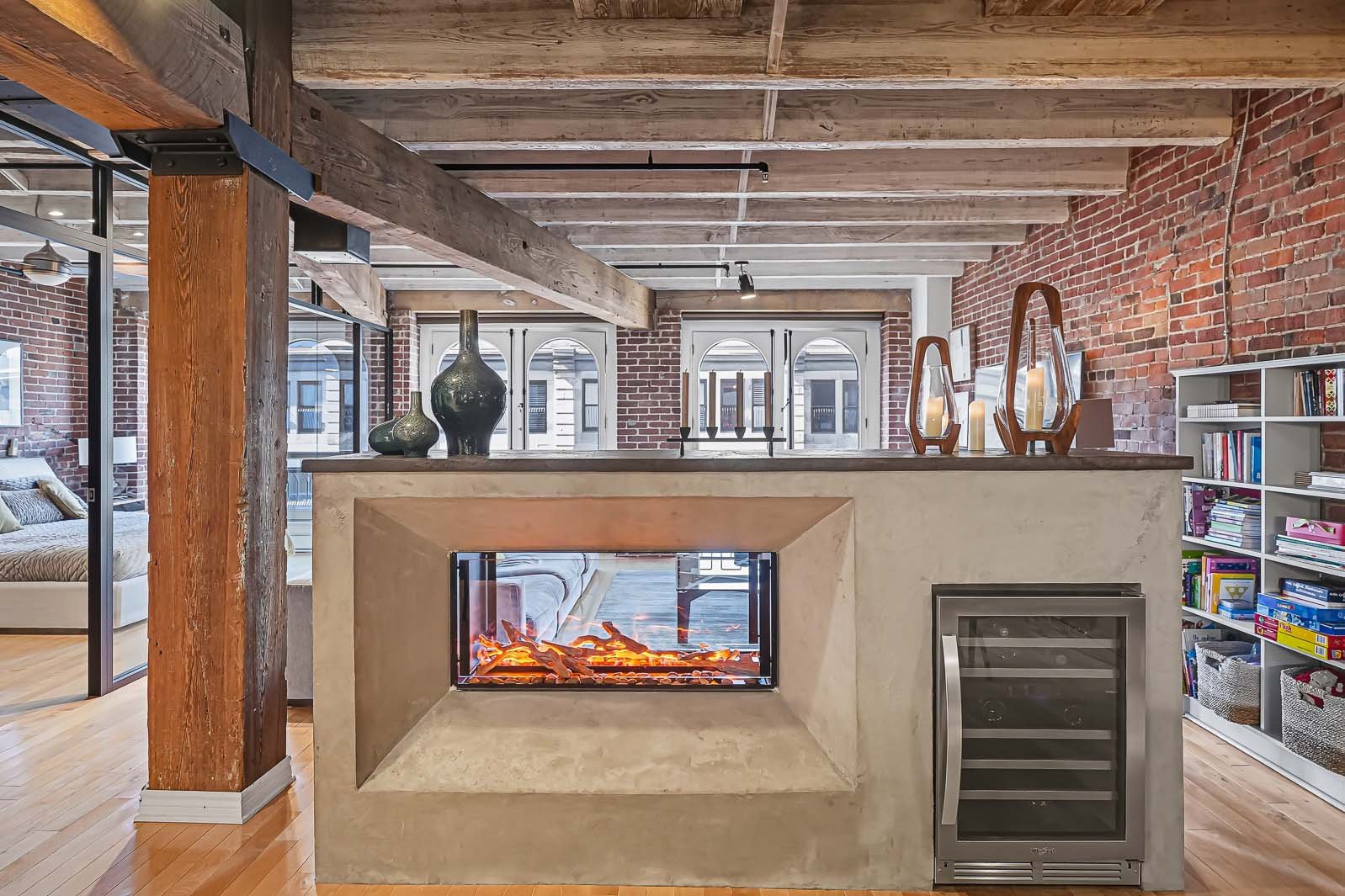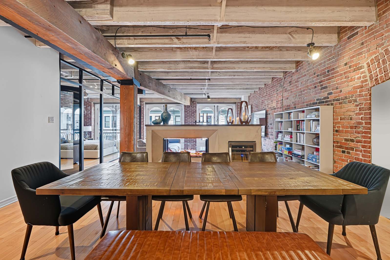 La Caserne, adresse emblématique du Vieux-Montréal. Côté cour intérieure, murmure des fontaines et aperçu du ciel offrent une belle lumière. Aire ouverte salon-salle à manger-cuisine avec foyer électrique pour l'ambiance et le confort. Chambre principale sublimée par un mur de verre, esprit loft affirmé. Planchers de bois, brique exposée, poutres blanchies et hauts plafonds. Cuisine rénovée, coin bureau/chambre d'appoint à l'entrée. Pièce de résistance : la salle de bains attenante, véritable oasis avec baignoire européenne et douche à l'italienne, digne d'un spa. Vieux-Montréal vivant, cafés et restos à vos portes.