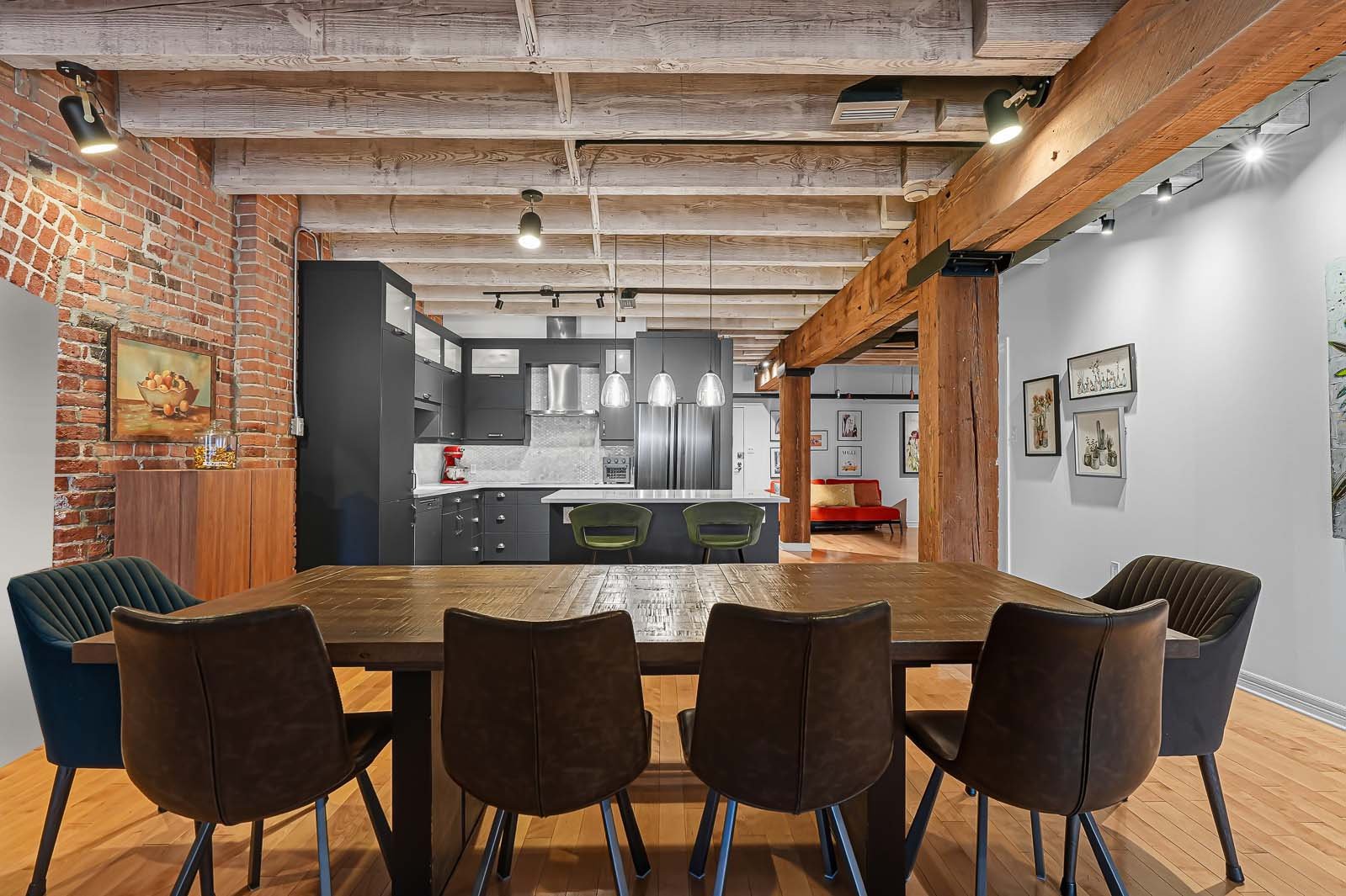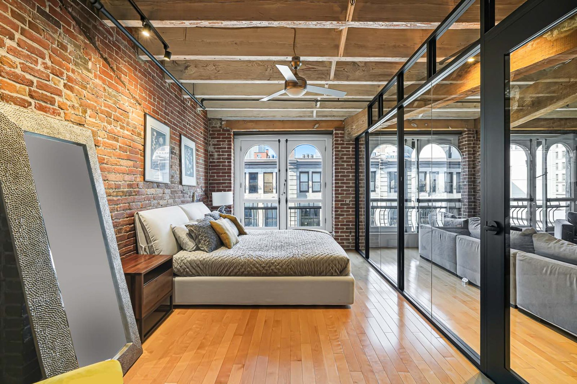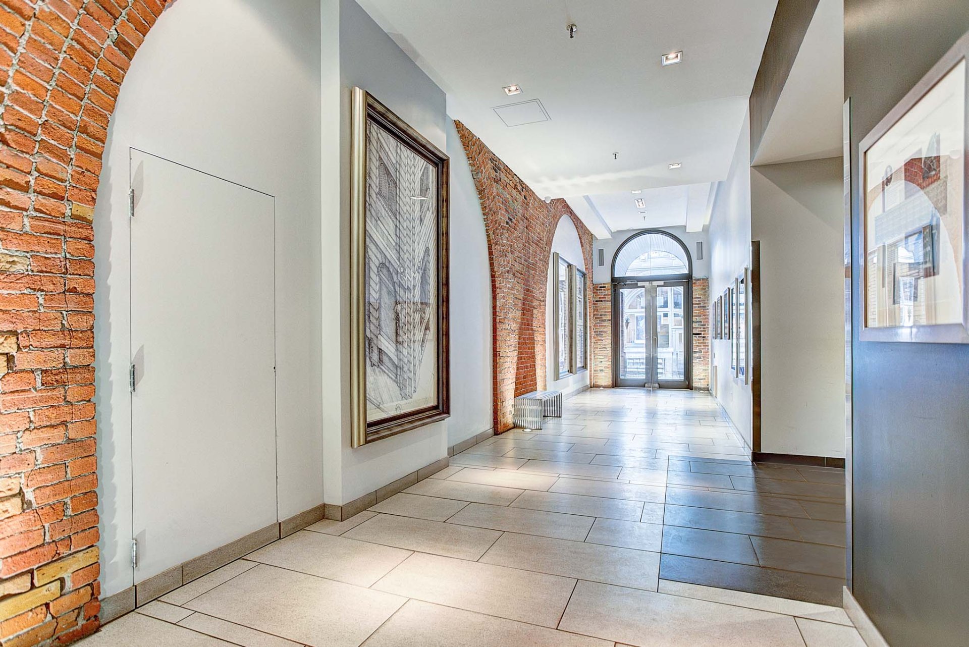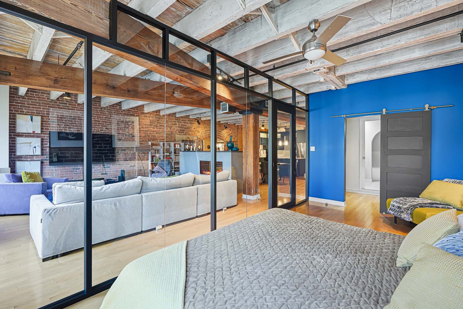 La Caserne, adresse emblématique du Vieux-Montréal. Côté cour intérieure, murmure des fontaines et aperçu du ciel offrent une belle lumière. Aire ouverte salon-salle à manger-cuisine avec foyer électrique pour l'ambiance et le confort. Chambre principale sublimée par un mur de verre, esprit loft affirmé. Planchers de bois, brique exposée, poutres blanchies et hauts plafonds. Cuisine rénovée, coin bureau/chambre d'appoint à l'entrée. Pièce de résistance : la salle de bains attenante, véritable oasis avec baignoire européenne et douche à l'italienne, digne d'un spa. Vieux-Montréal vivant, cafés et restos à vos portes.