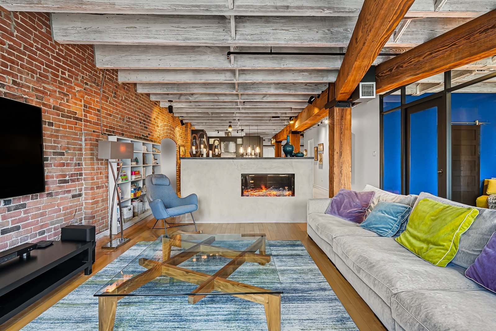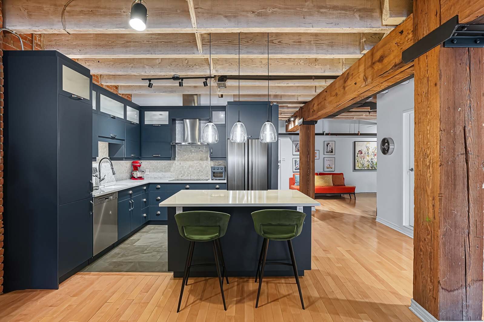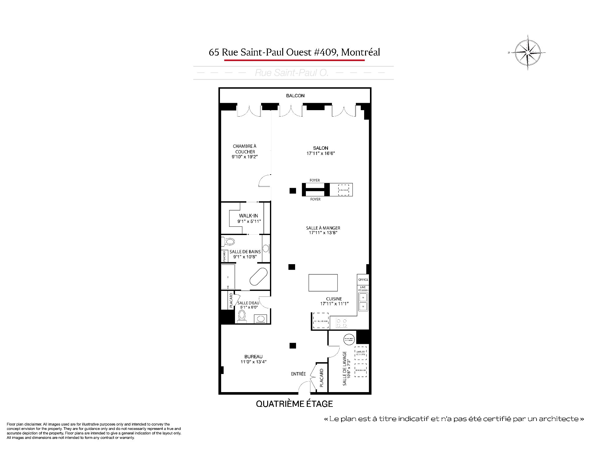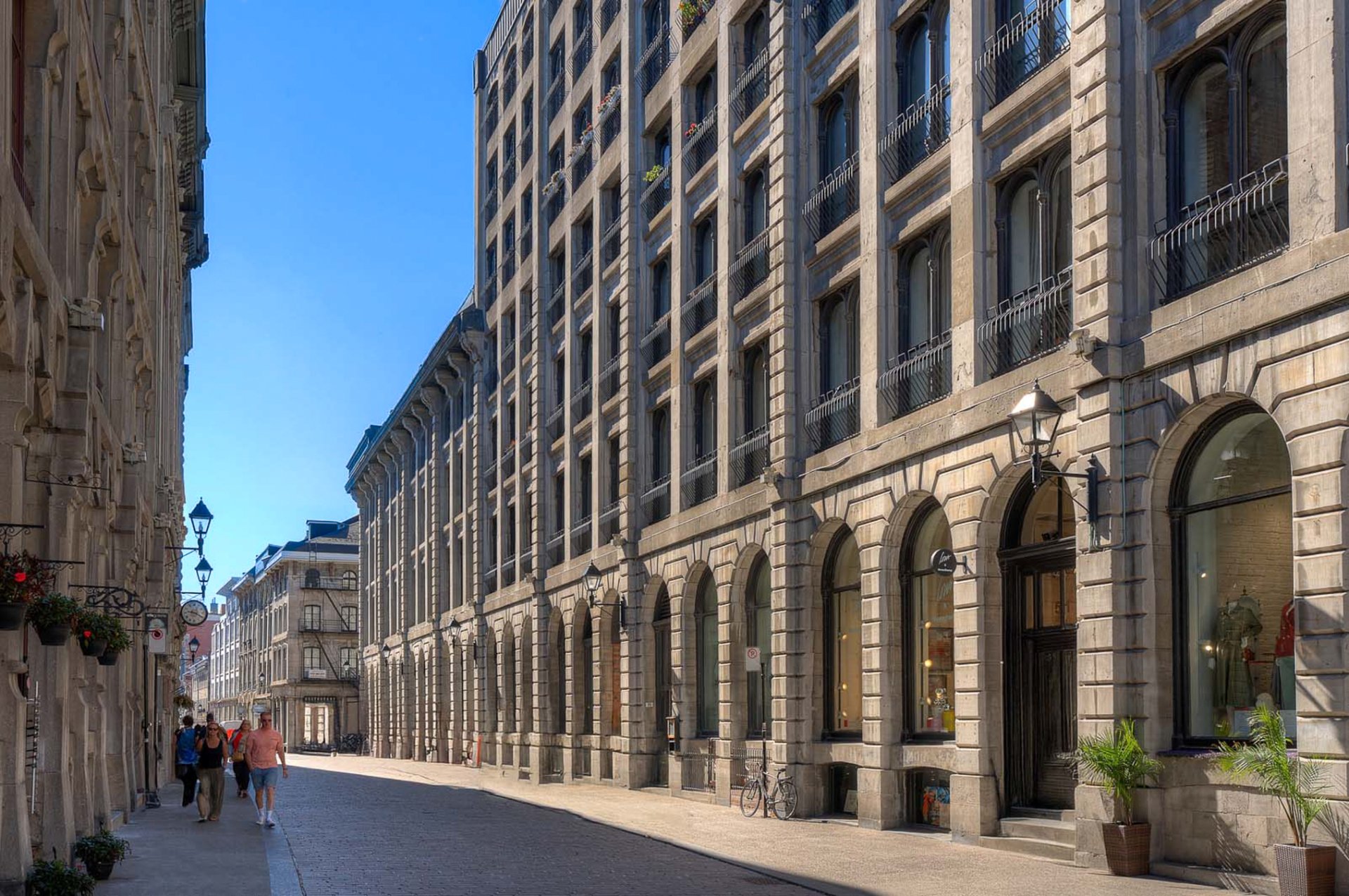 La Caserne, adresse emblématique du Vieux-Montréal. Côté cour intérieure, murmure des fontaines et aperçu du ciel offrent une belle lumière. Aire ouverte salon-salle à manger-cuisine avec foyer électrique pour l'ambiance et le confort. Chambre principale sublimée par un mur de verre, esprit loft affirmé. Planchers de bois, brique exposée, poutres blanchies et hauts plafonds. Cuisine rénovée, coin bureau/chambre d'appoint à l'entrée. Pièce de résistance : la salle de bains attenante, véritable oasis avec baignoire européenne et douche à l'italienne, digne d'un spa. Vieux-Montréal vivant, cafés et restos à vos portes.