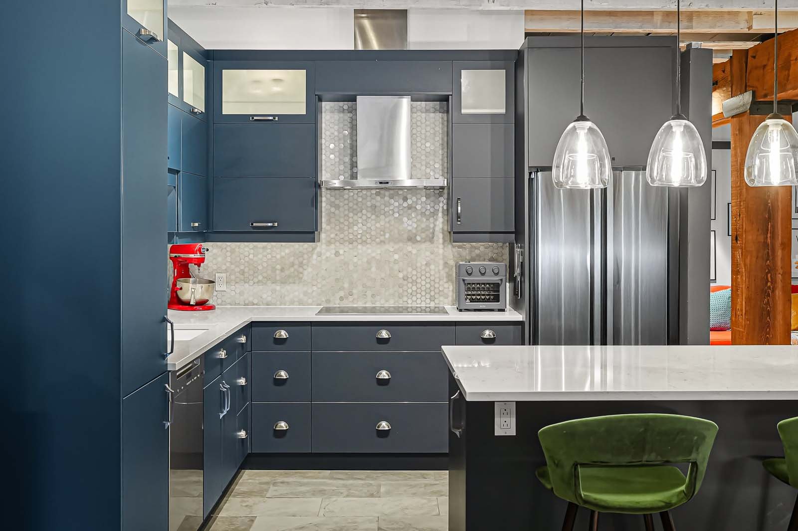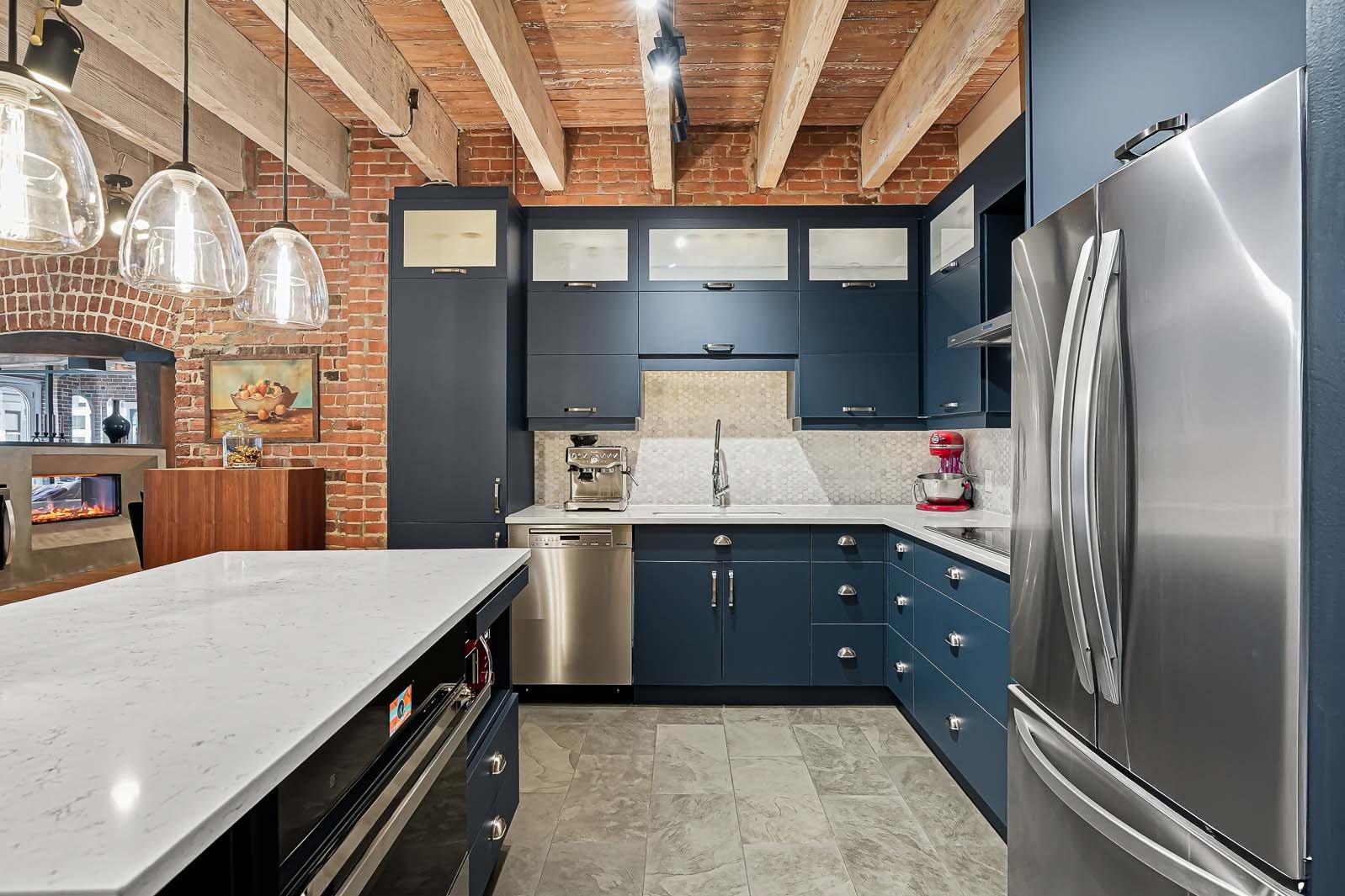 - Réfrigérateur/congélateur LG et Whirlpool, refroidisseur à vin Whirlpool, plaque de cuisson àminduction Frigidaire, four encastré Jenn Air, lave-vaisselle Miele, laveuse et sécheuse à condensation Bosch, stores en nid d'abeille motorisés, fixtures d'éclairage et foyer électrique Dimplex.