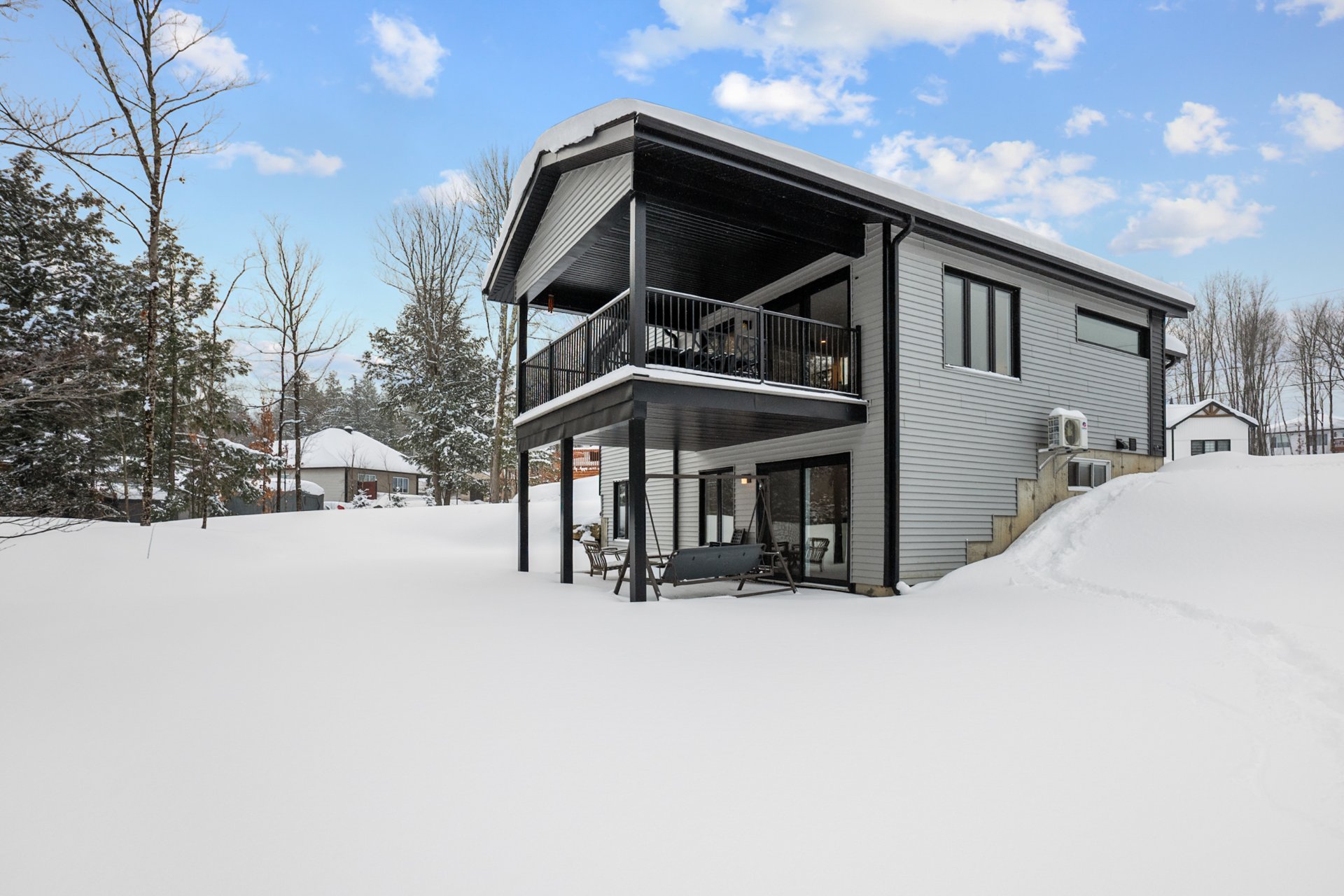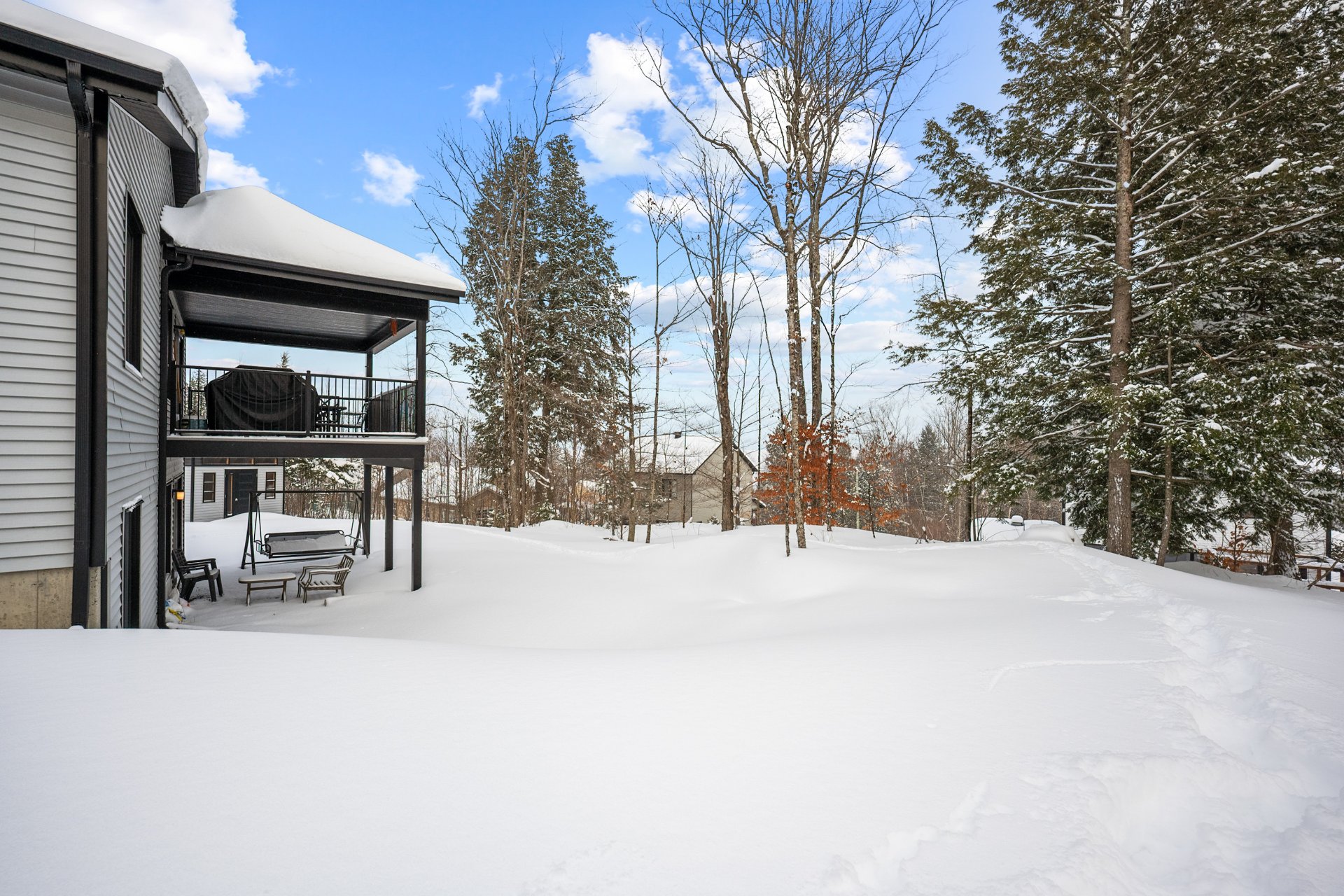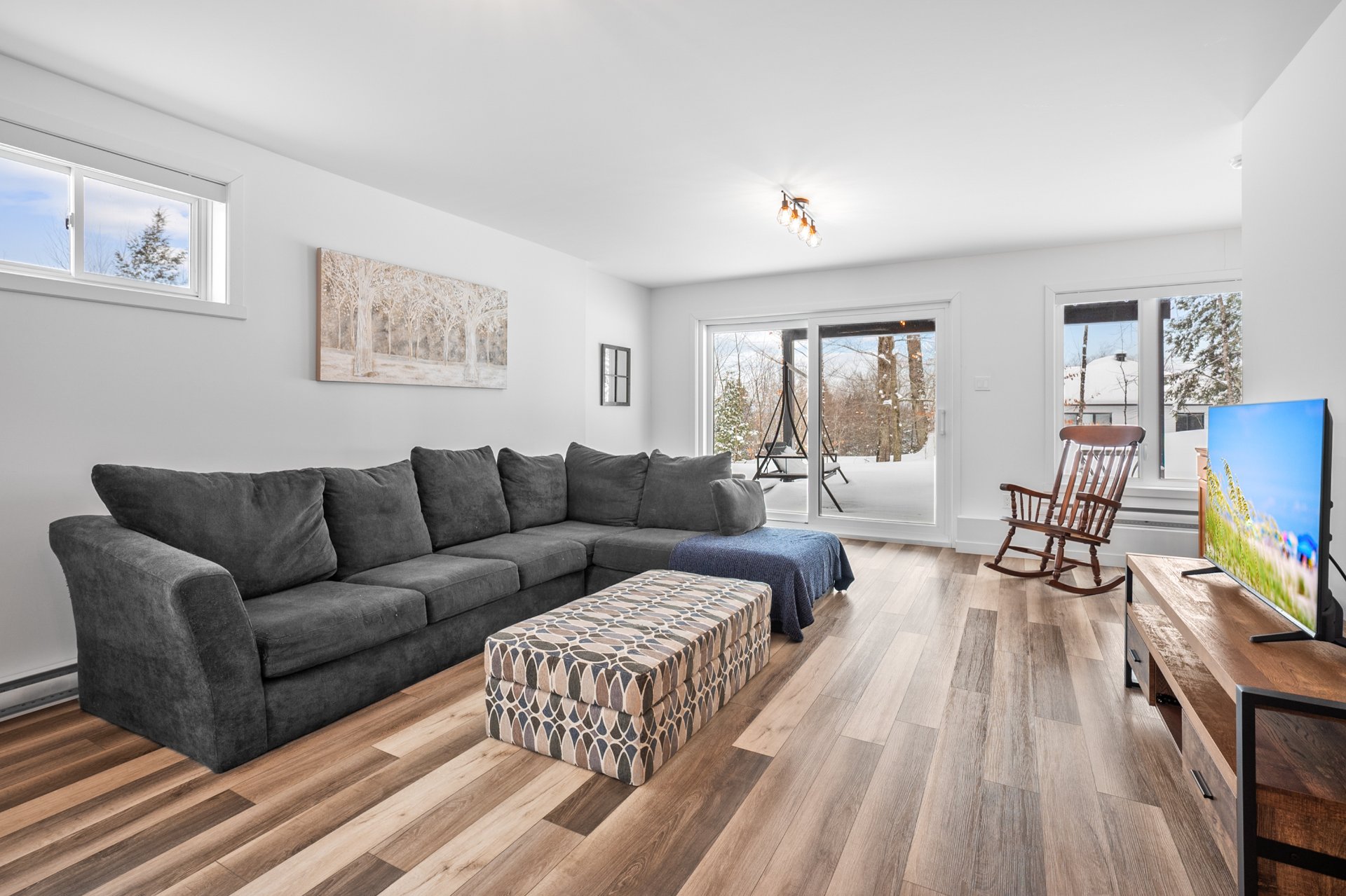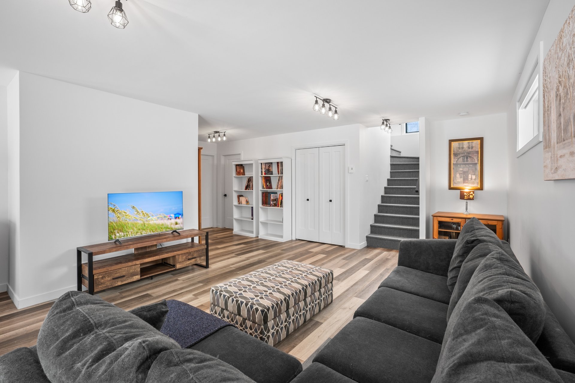 Le rez-de-jardin, entièrement baigné de lumière naturelle, offre deux chambres supplémentaires de belles dimensions, une deuxième salle de bains, ainsi qu'une vaste salle familiale s'ouvrant sur une terrasse de béton. La cour arrière intime, bordée d'un terrain boisé, crée un véritable havre de paix, en parfaite symbiose avec la nature.