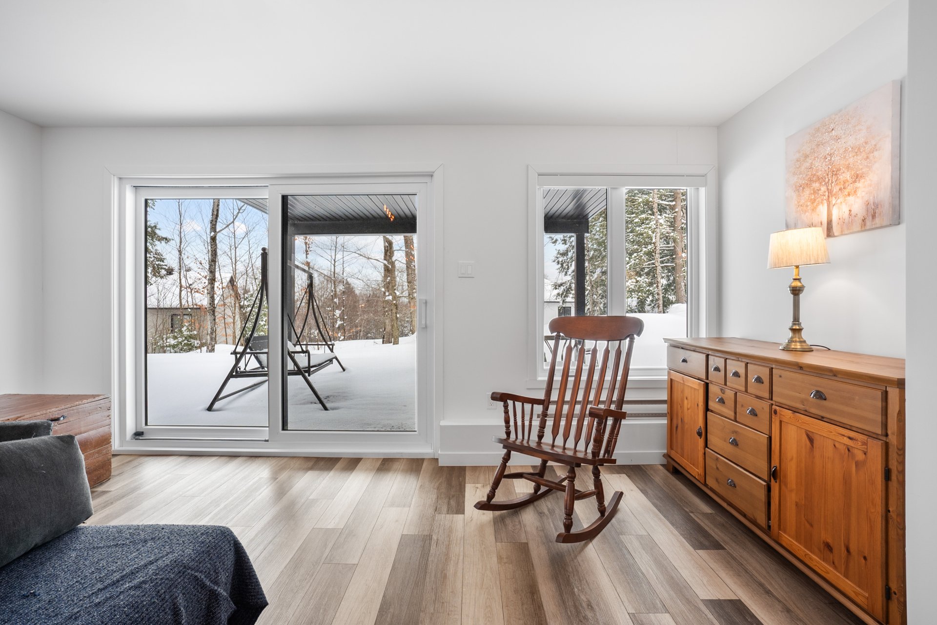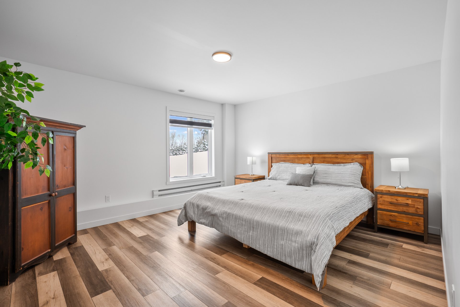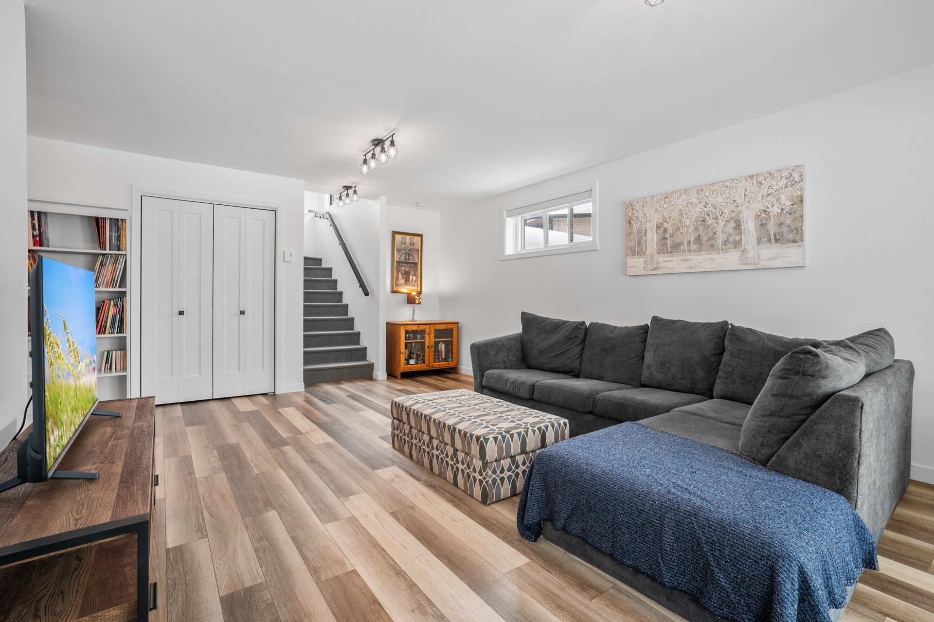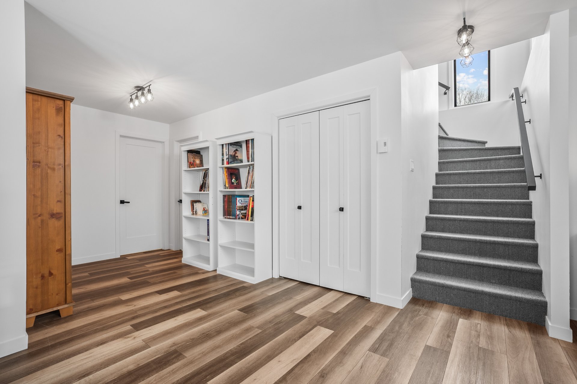 Le rez-de-jardin, entièrement baigné de lumière naturelle, offre deux chambres supplémentaires de belles dimensions, une deuxième salle de bains, ainsi qu'une vaste salle familiale s'ouvrant sur une terrasse de béton. La cour arrière intime, bordée d'un terrain boisé, crée un véritable havre de paix, en parfaite symbiose avec la nature.