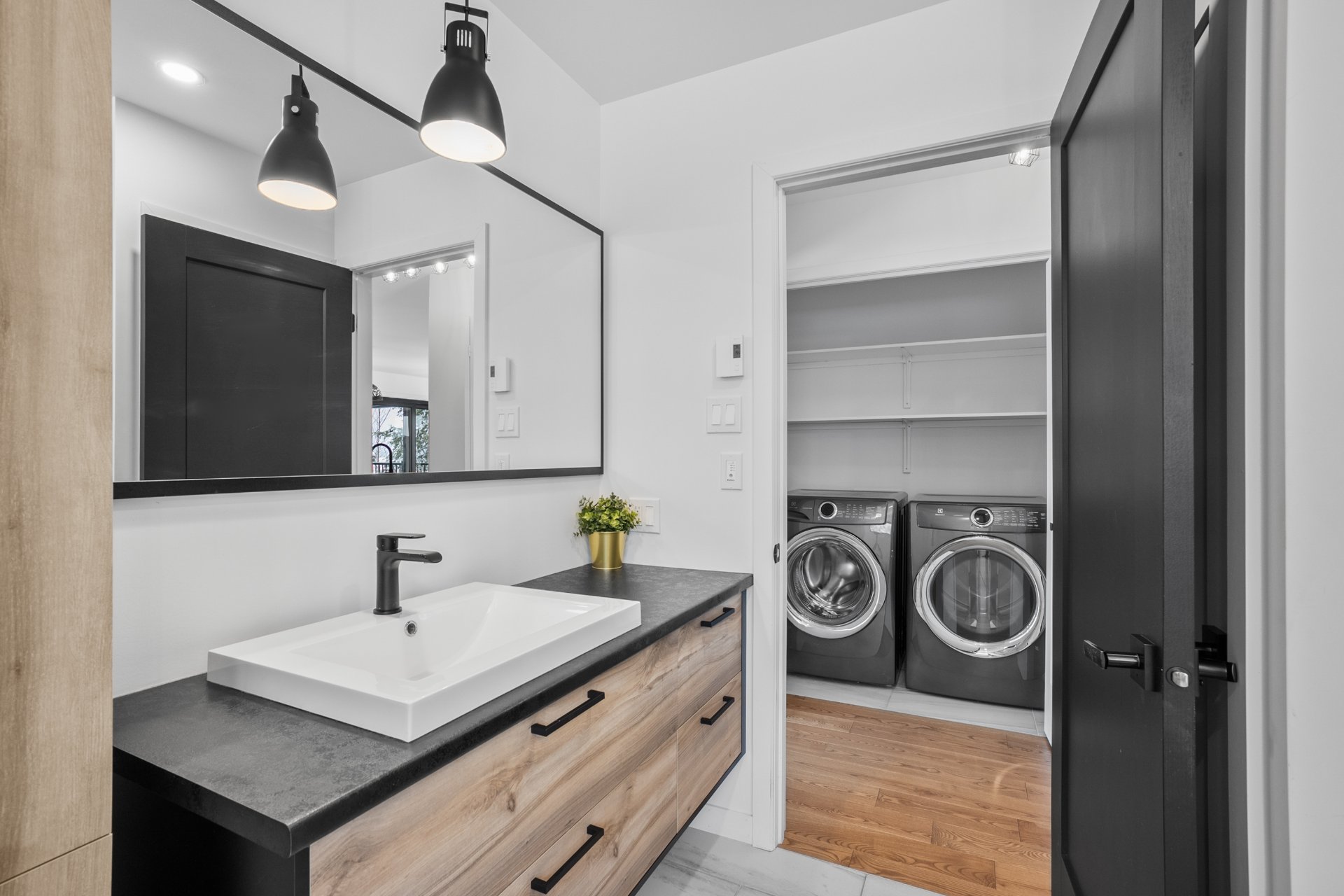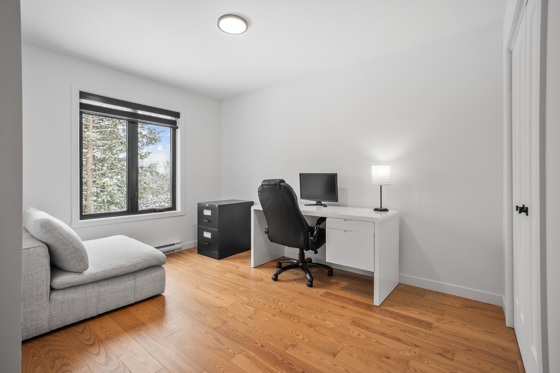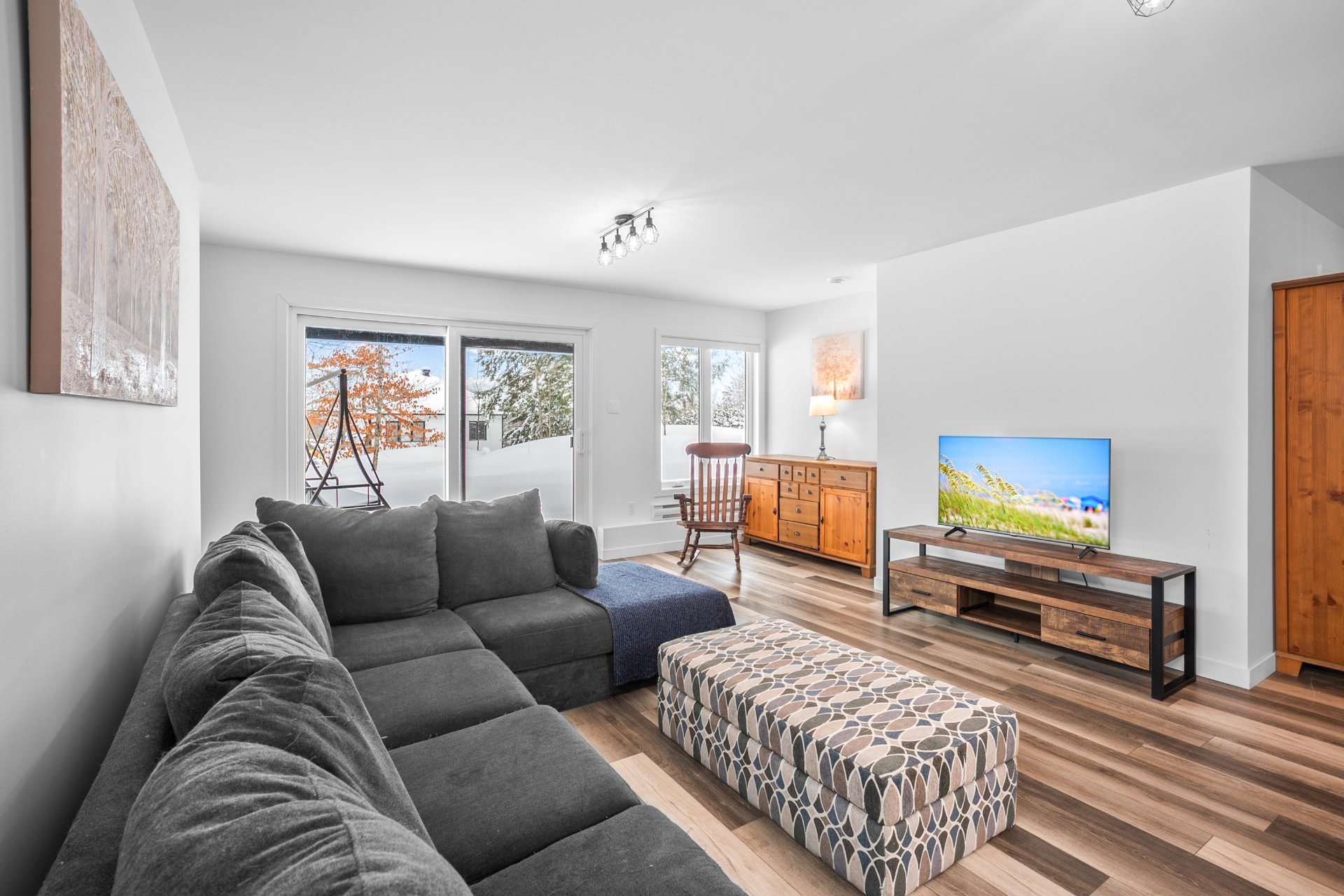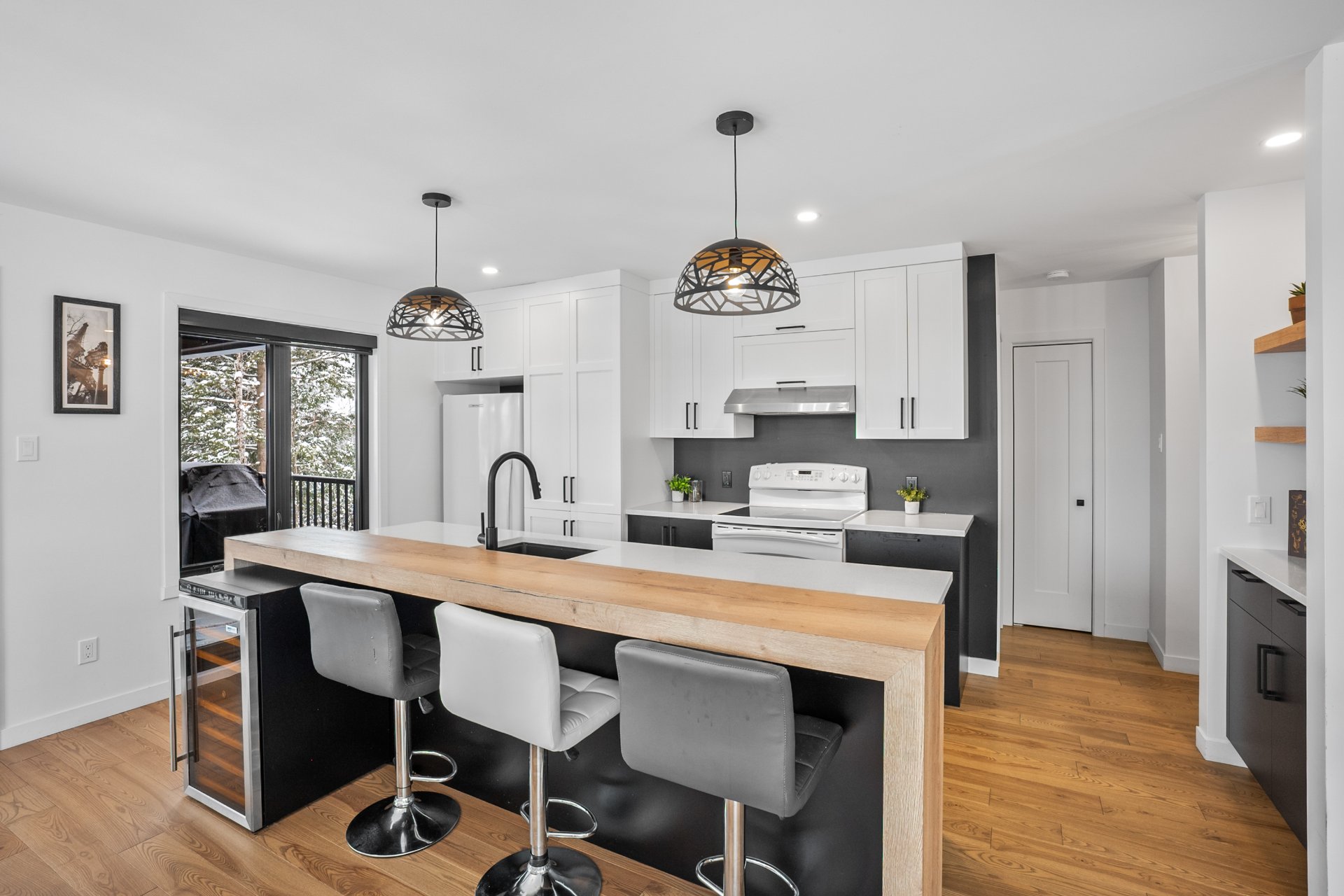Le rez-de-jardin, entièrement baigné de lumière naturelle, offre deux chambres supplémentaires de belles dimensions, une deuxième salle de bains, ainsi qu'une vaste salle familiale s'ouvrant sur une terrasse de béton. La cour arrière intime, bordée d'un terrain boisé, crée un véritable havre de paix, en parfaite symbiose avec la nature.