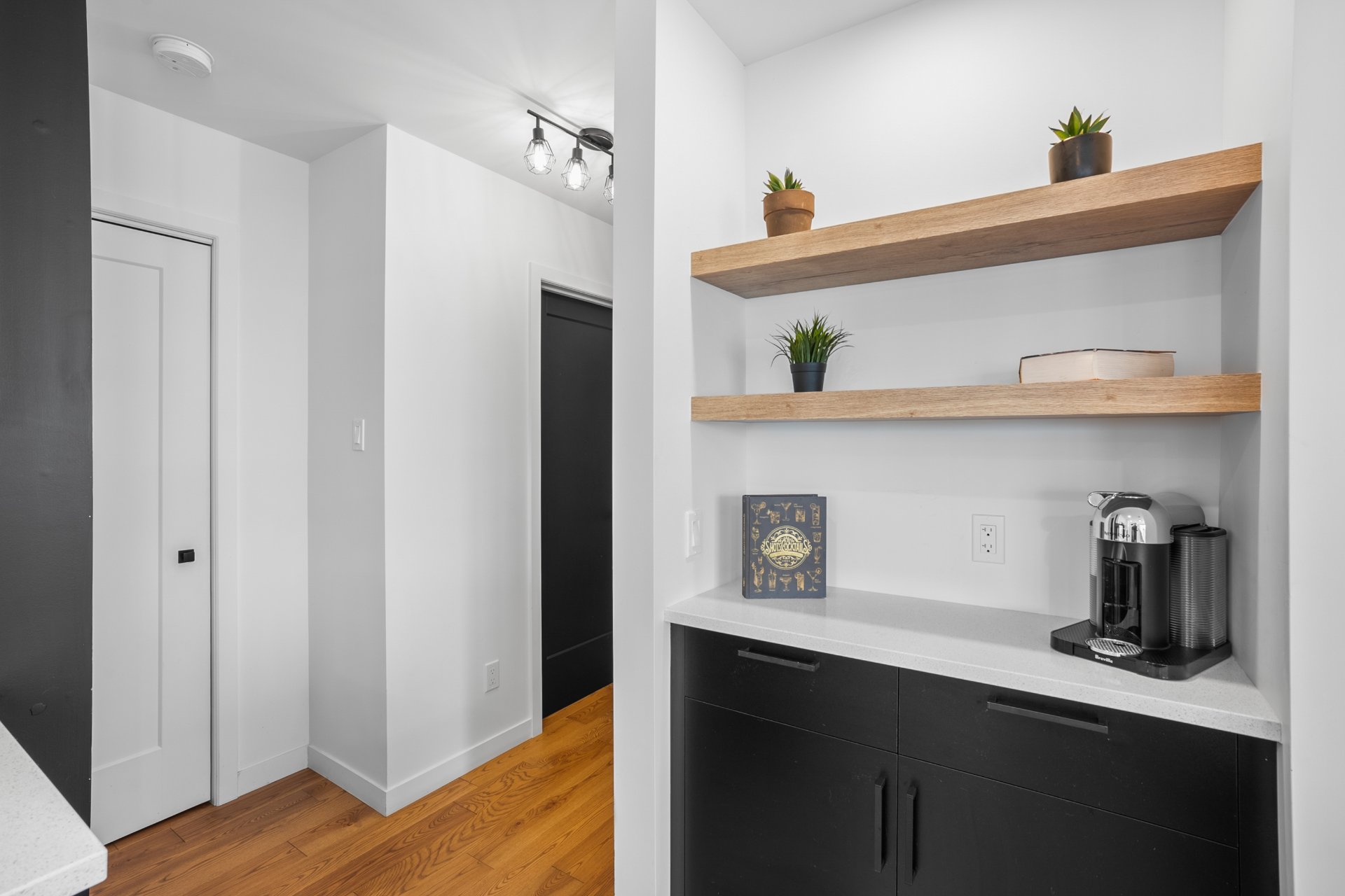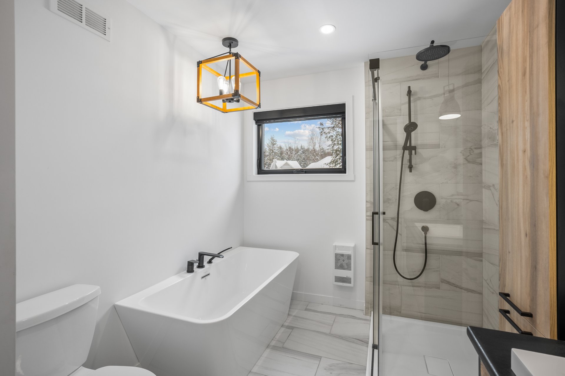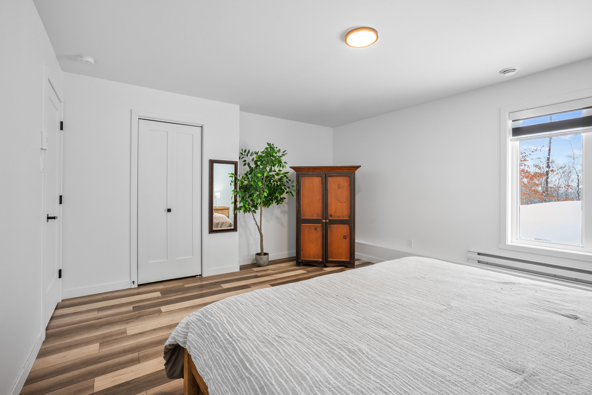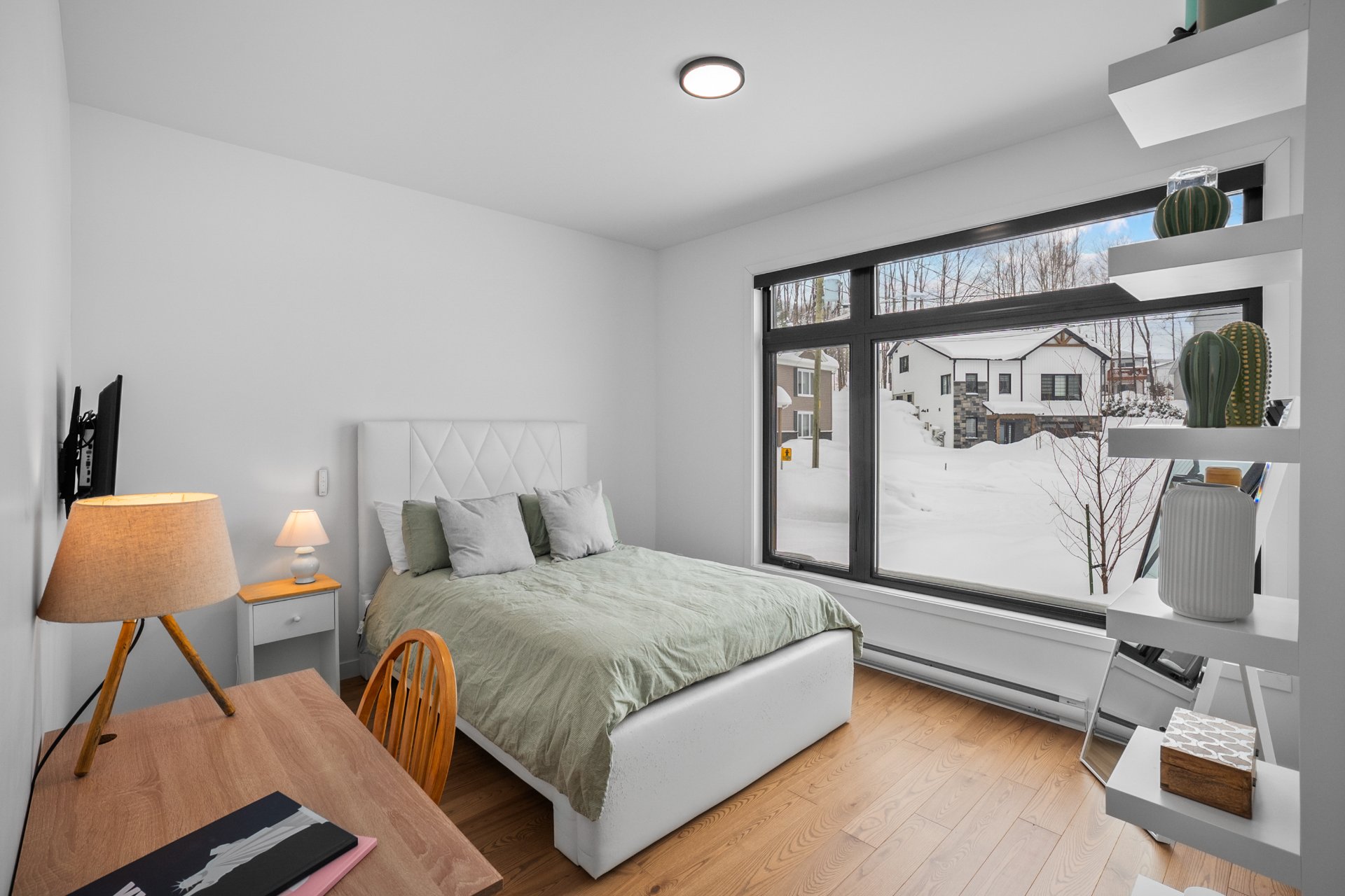 Le rez-de-chaussée à aire ouverte se distingue par son atmosphère chaleureuse et ses généreuses fenestrations. Le balcon couvert permet de profiter d'une vue saisonnière sur le lac Waterloo, un cadre invitant à la détente. Deux chambres s'y trouvent, se partageant une salle de bains raffinée avec bain autoportant et douche indépendante. La cuisine, au design soigné, propose un îlot central, des comptoirs de quartz ainsi qu'un garde-manger de style walk-in, répondant aux attentes des plus exigeants. Une thermopompe murale assure un confort optimal en toute saison.