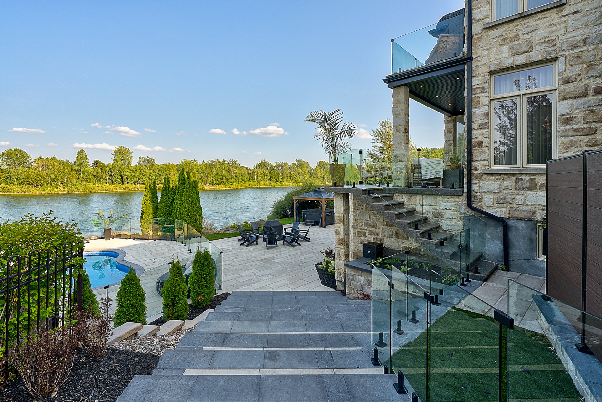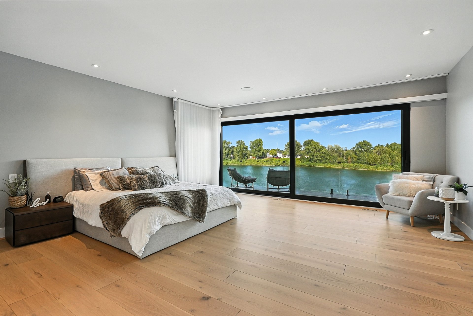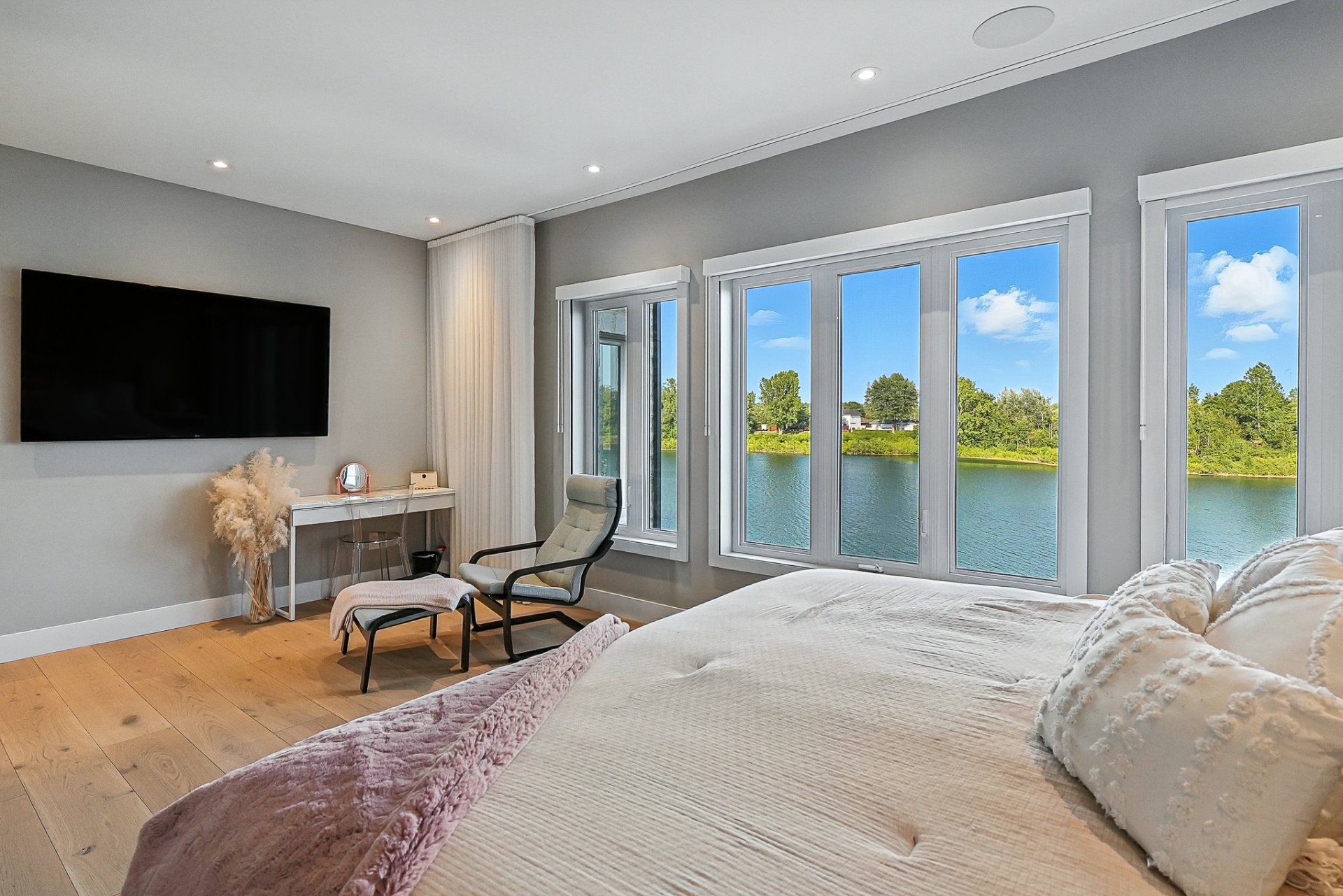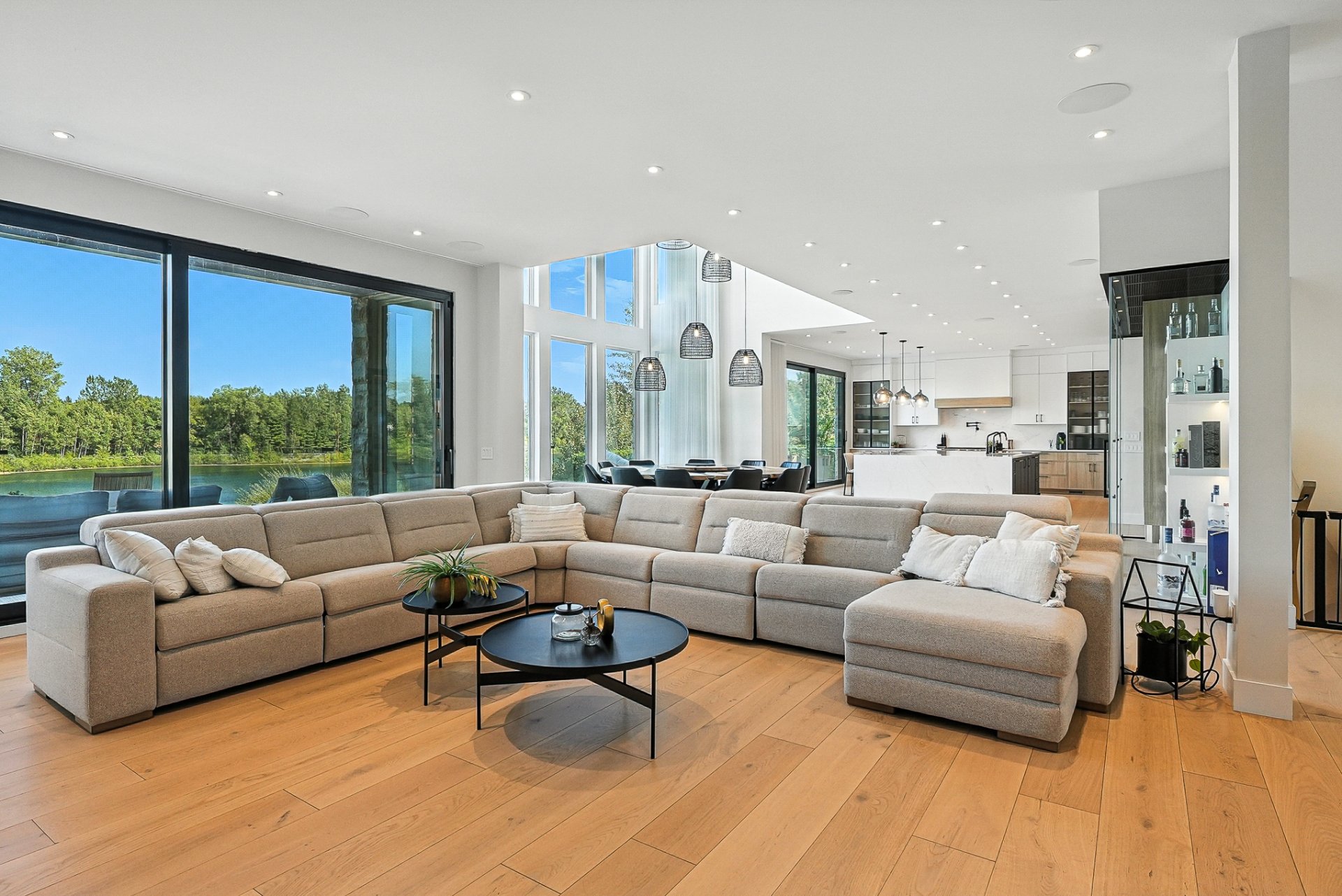 Offrez-vous un cadre de vie privilégié dans cette propriété située au coeur de Blainville-sur-le-Lac, en bordure du lac. Dès l'entrée, un hall lumineux avec de grandes portes vitrées mène à un escalier en bois desservant les trois niveaux de la maison. Le rez-de-chaussée à aire ouverte est conçu pour la vie de famille et les réceptions. On y retrouve un salon avec foyer au bois donnant sur une terrasse avec vue sur le lac, une salle à manger aux fenêtres de 30 pieds avec cellier intégré, ainsi qu'une cuisine fonctionnelle équipée d'électroménagers intégrés, pot filler, doubles éviers, garde-manger walk-in et porte-patio de 16 pieds menant à une seconde terrasse. Un bureau avec rangements, une salle d'eau et une salle de lavage complètent ce niveau. À l'étage, une passerelle surplombant la salle à manger mène aux chambres. La suite principale comprend un walk-in, une salle de bains avec vue sur l'eau et un balcon privé. Deux autres chambres partagent une salle de bains, et une pièce vitrée polyvalente -- actuellement un gym -- peut servir de bureau ou d'espace créatif. Le rez-de-jardin propose une grande salle familiale avec bar, une salle de cinéma maison et trois chambres supplémentaires, dont deux avec walk-in et salle de bains attenante. À l'extérieur, la cour comprend une piscine creusée, un spa, un cabanon, un quai privé et un accès direct au lac sur un terrain de plus de 30 000 pi². Un garage triple avec plancher en époxy, de nombreux rangements, un vaste stationnement, un système d'irrigation, une borne de recharge, le chauffage au gaz naturel et des planchers chauffants complètent l'ensemble. La propriété a bénéficié de plusieurs rénovations au fil des ans. À proximité des écoles, garderies, parcs, transports et axes routiers, cette résidence combine confort et qualité de vie.