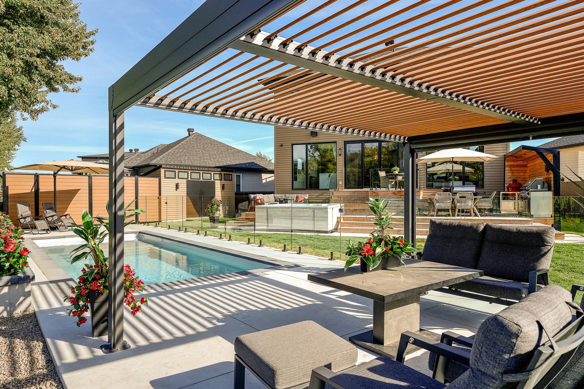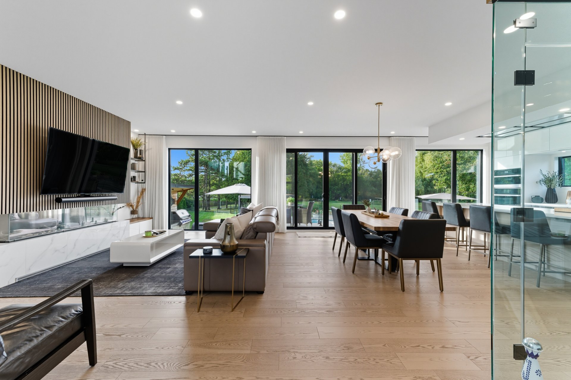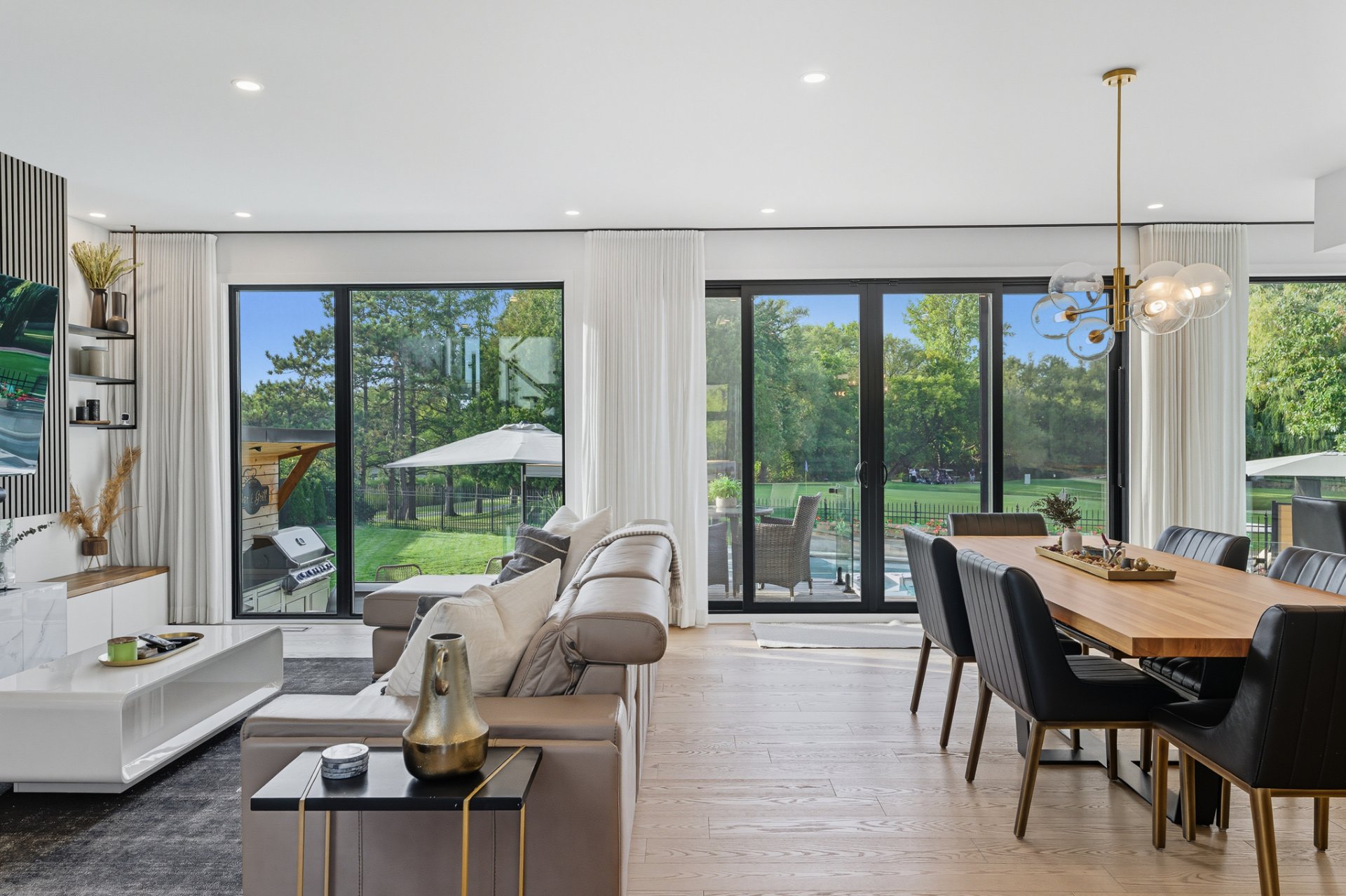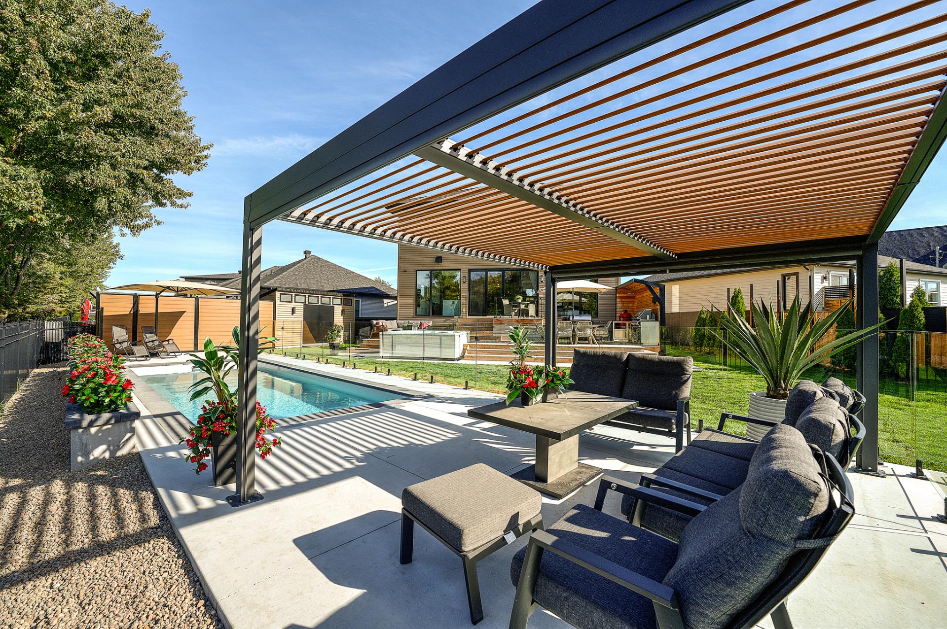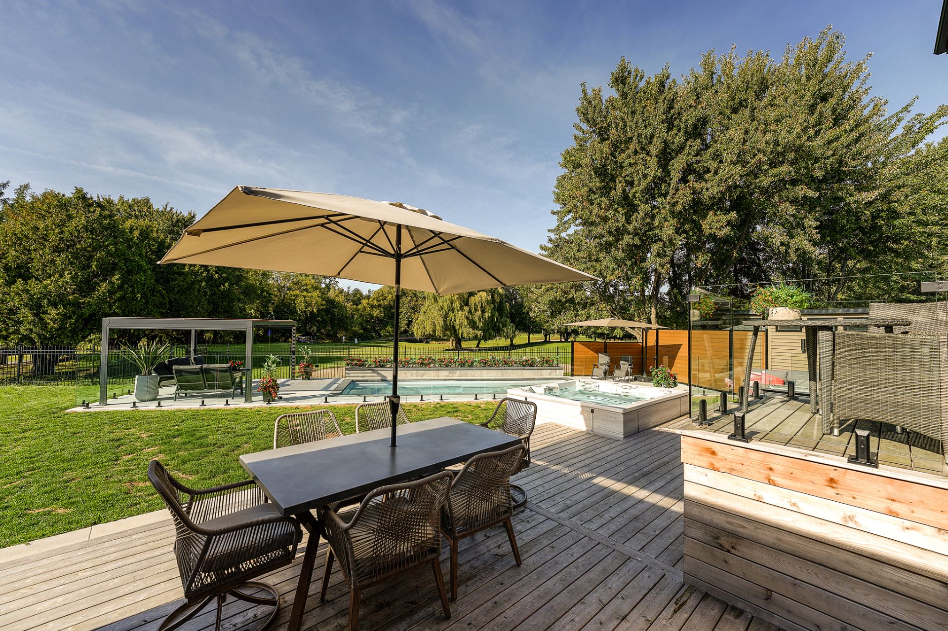 - Réfrigérateur Jenn-Air, cuisinière au gaz Wolf, four encastré Jenn-Air, lave-vaisselle Jenn-Air, micro-ondes/four Jenn-Air, revêtements de fenêtres, toiles et rideaux électriques, fixtures d'éclairage, alarme, aspirateur central et acc., équipements et thermopompe de piscine, ouvre-porte de garage, ameublement de bureau dans CAC au 2ème, foyer électrique Napoléon dans CCP, tous les miroirs du gym, cuisine ext.: meubles et BBQ Napoléon, toutes les plantes ext., pergola.