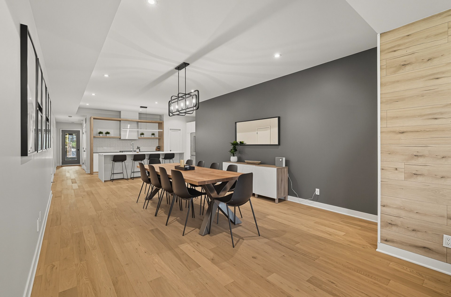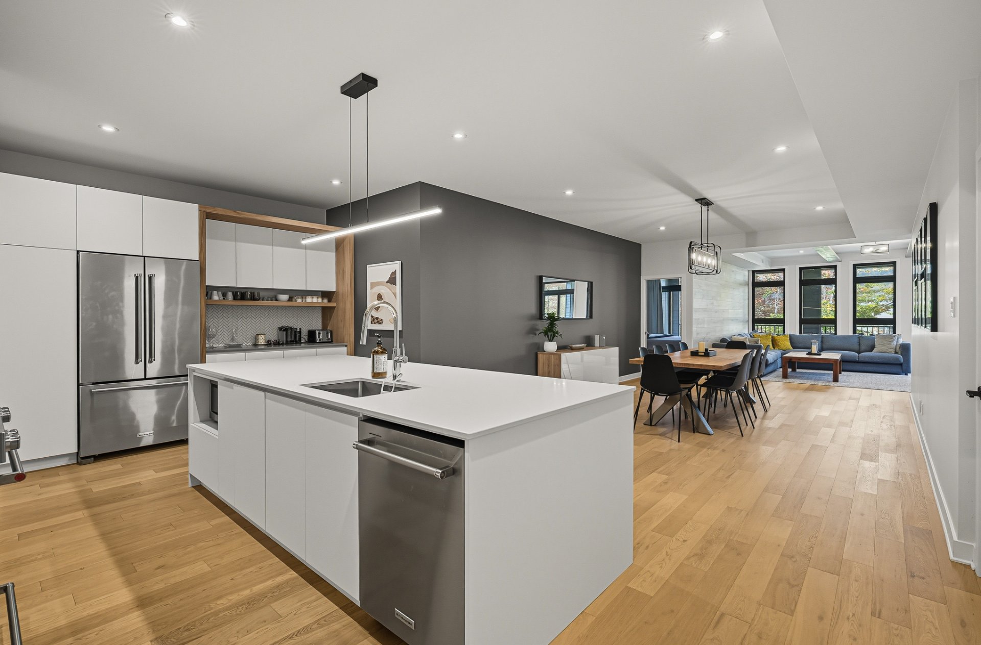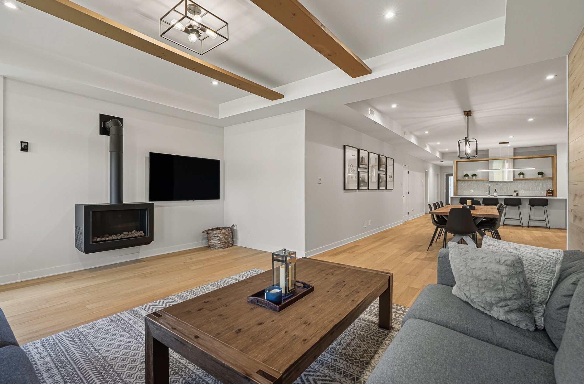 -Un espace à aire ouverte baigné de lumière comprenant un salon avec foyer au gaz, une élégante salle à manger entre le salon et la cuisine, qui est équipée d'un Walk-in et d'un îlot central.