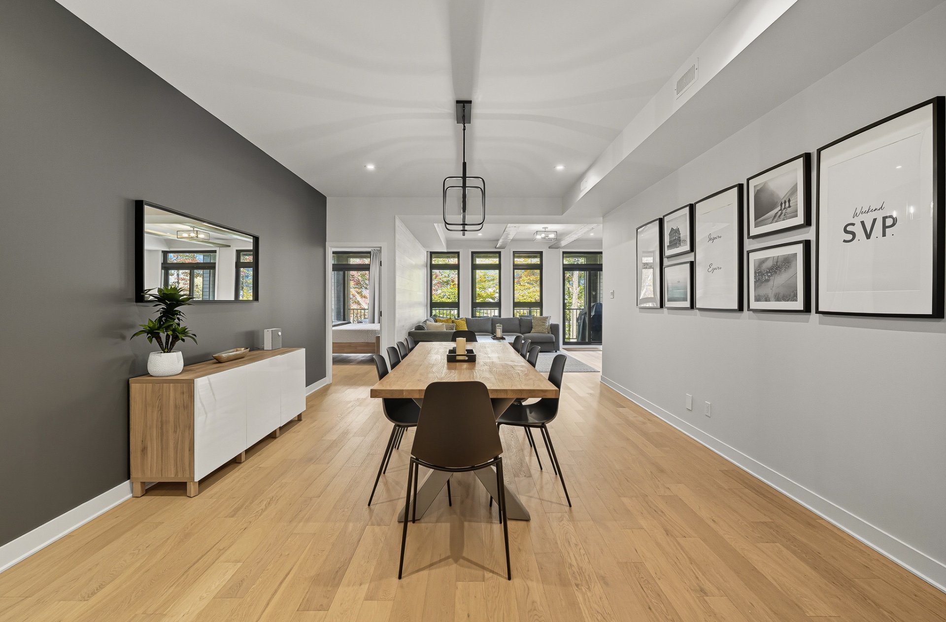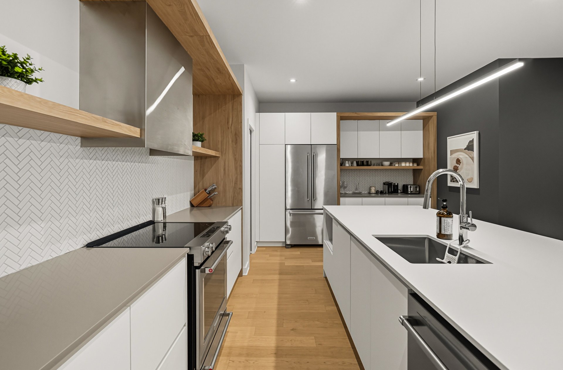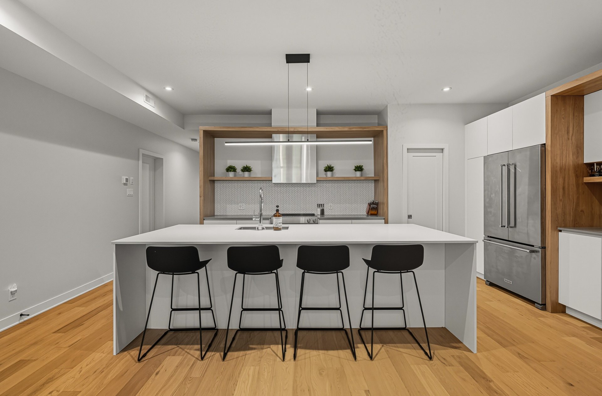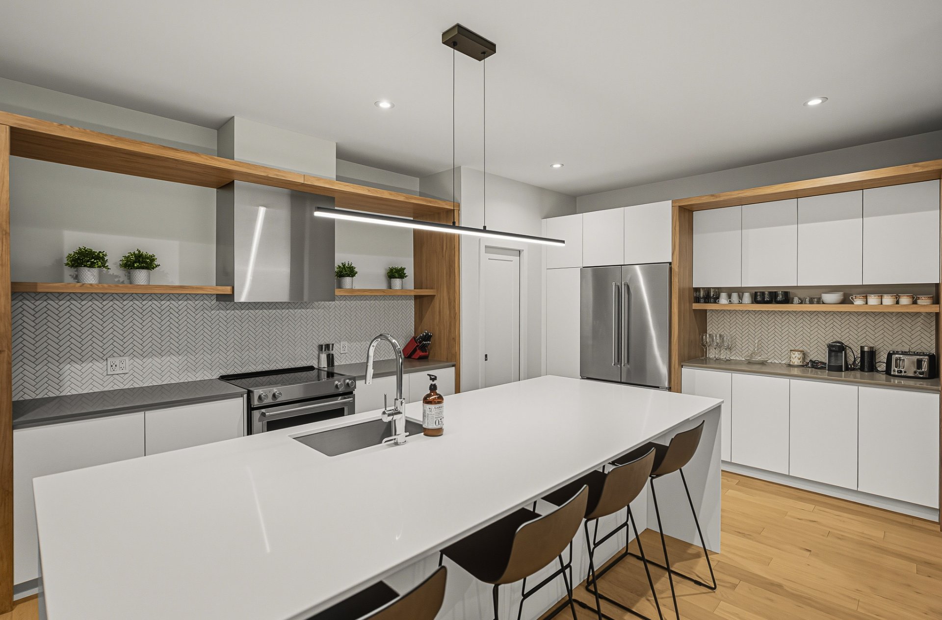 -Un espace à aire ouverte baigné de lumière comprenant un salon avec foyer au gaz, une élégante salle à manger entre le salon et la cuisine, qui est équipée d'un Walk-in et d'un îlot central.