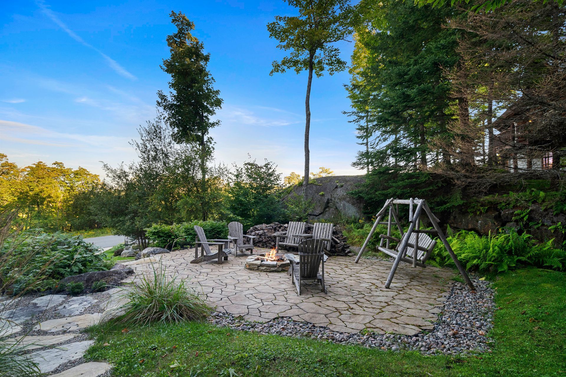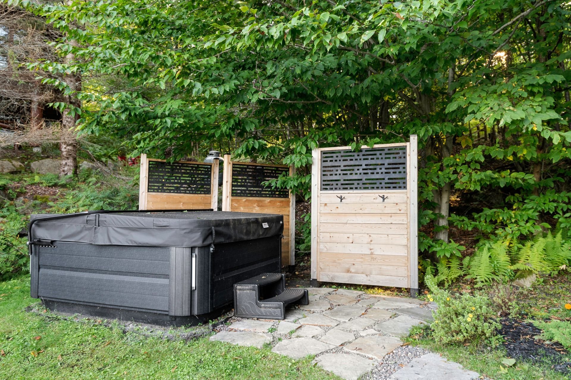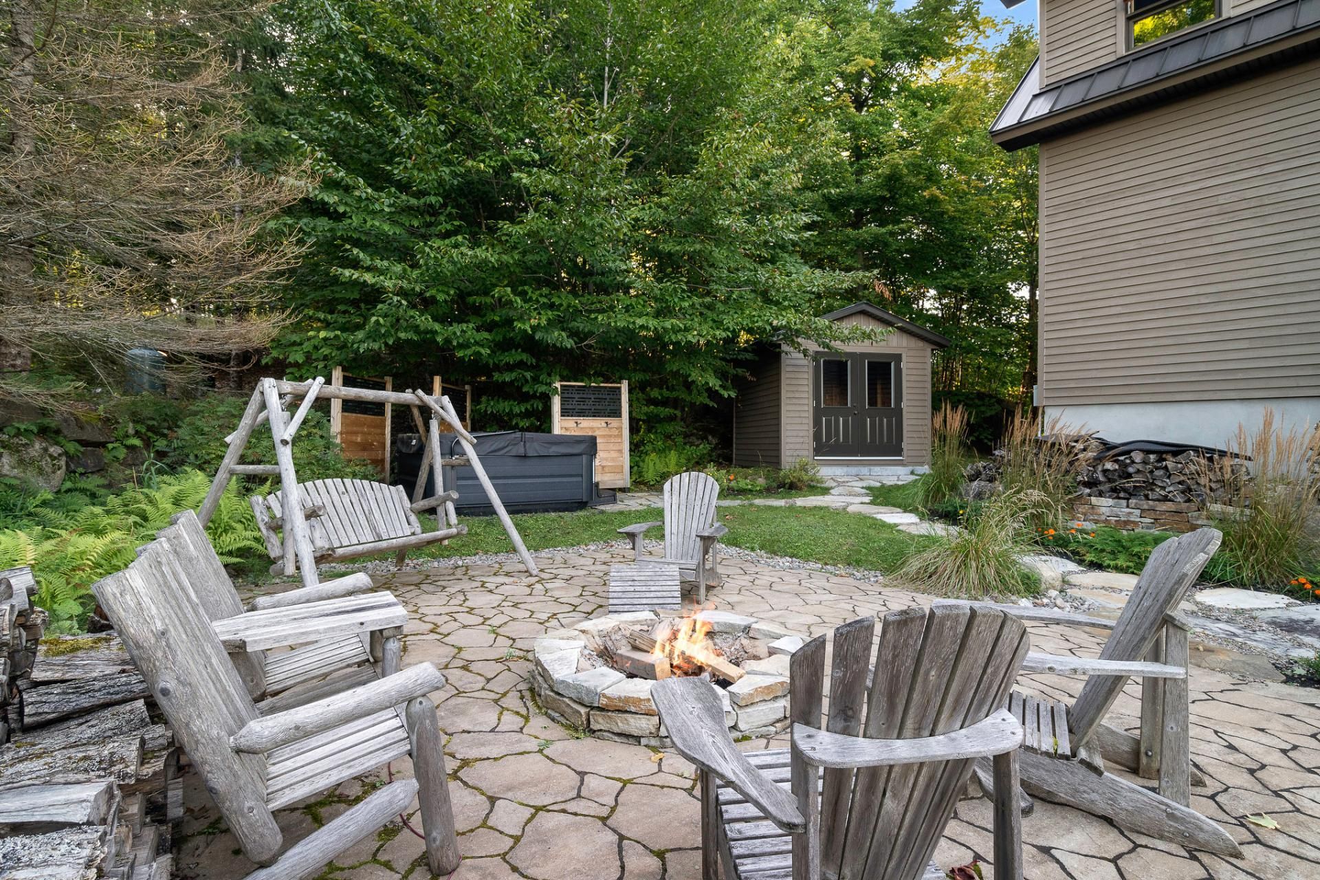 L'aménagement extérieur comprend un espace pour feu, un spa et un grand cabanon.