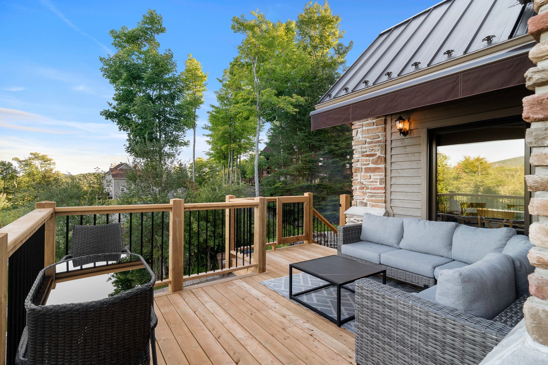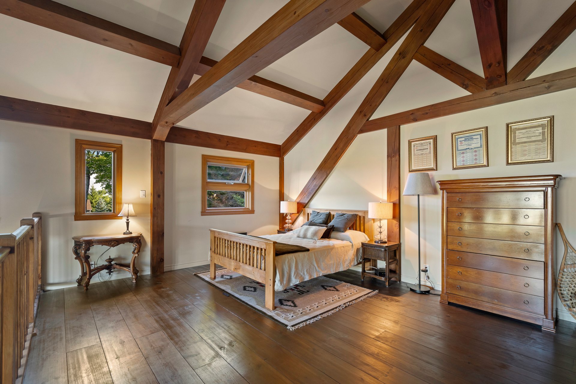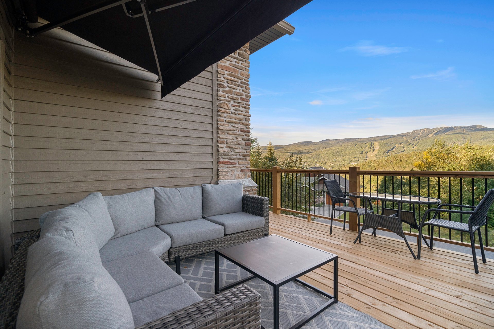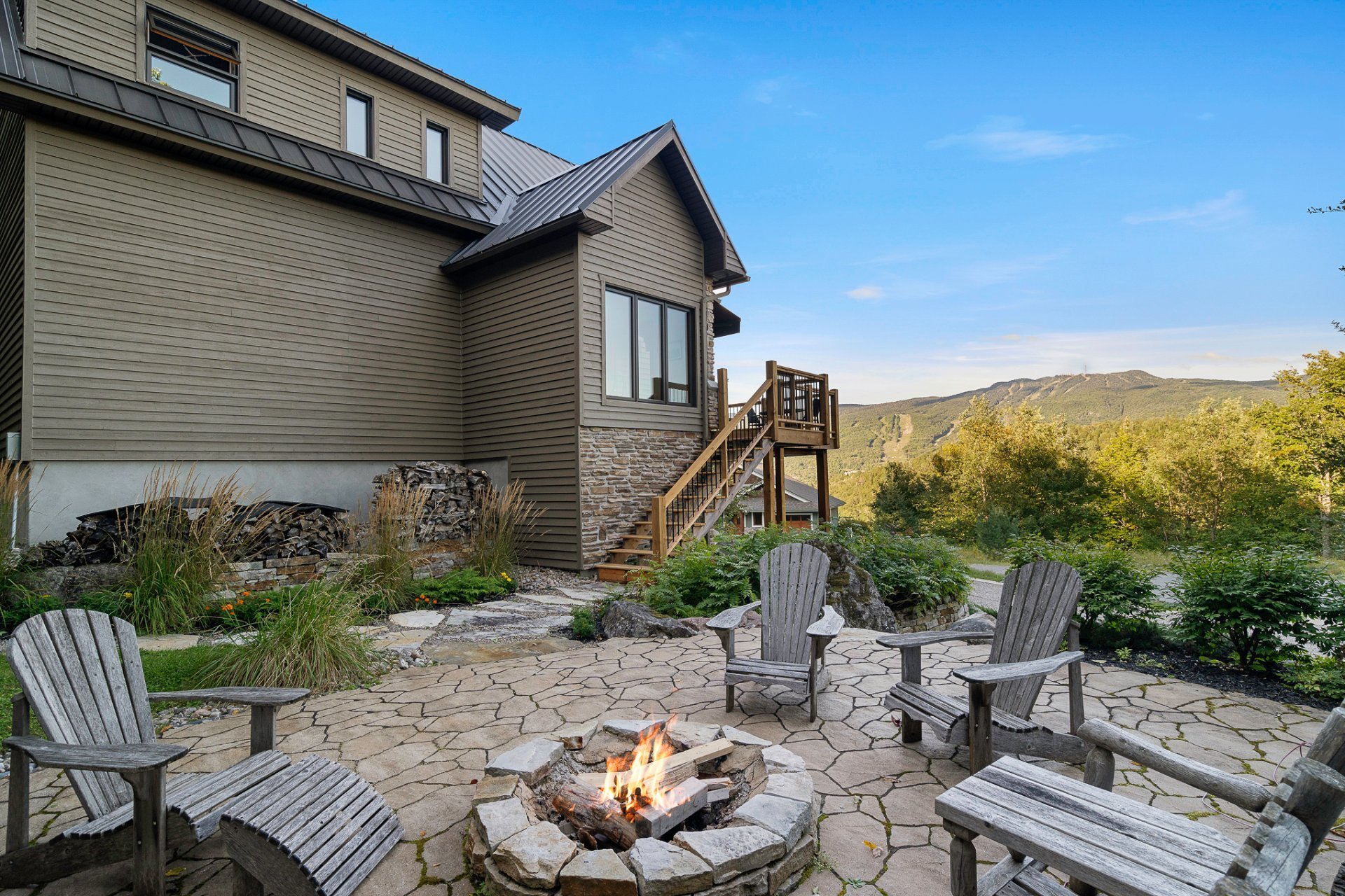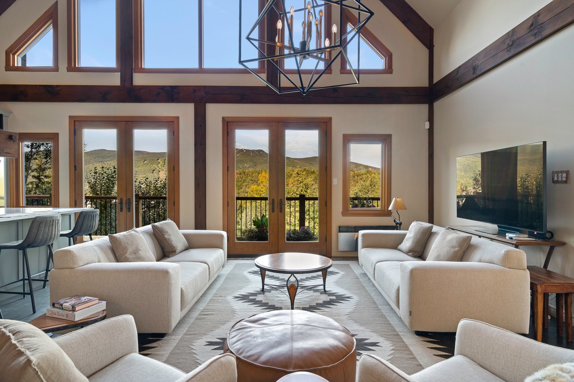 Le salon comprend un plafond cathédrale avec poutres en bois apparentes; , des planchers en bois franc, un foyer central au gaz et des vues à couper le souffle sur la montagne.
