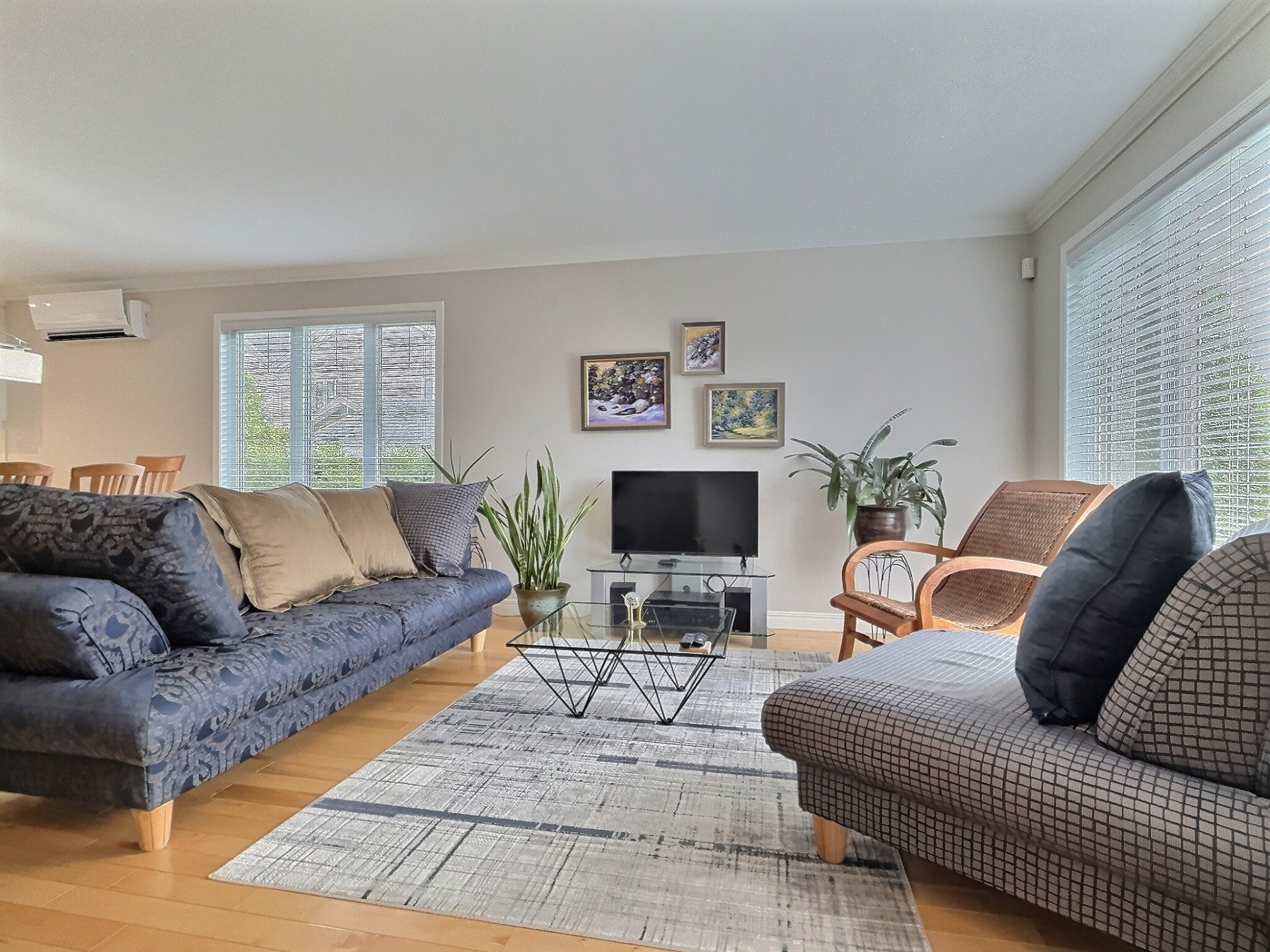 Une causeuse 2 places dans la salle familiale avec tapis, télévision panasonic avec meuble TV et système de son. Table en bois pliante 6 places. BBQ, table patio avec 4 chaises et parasol.
