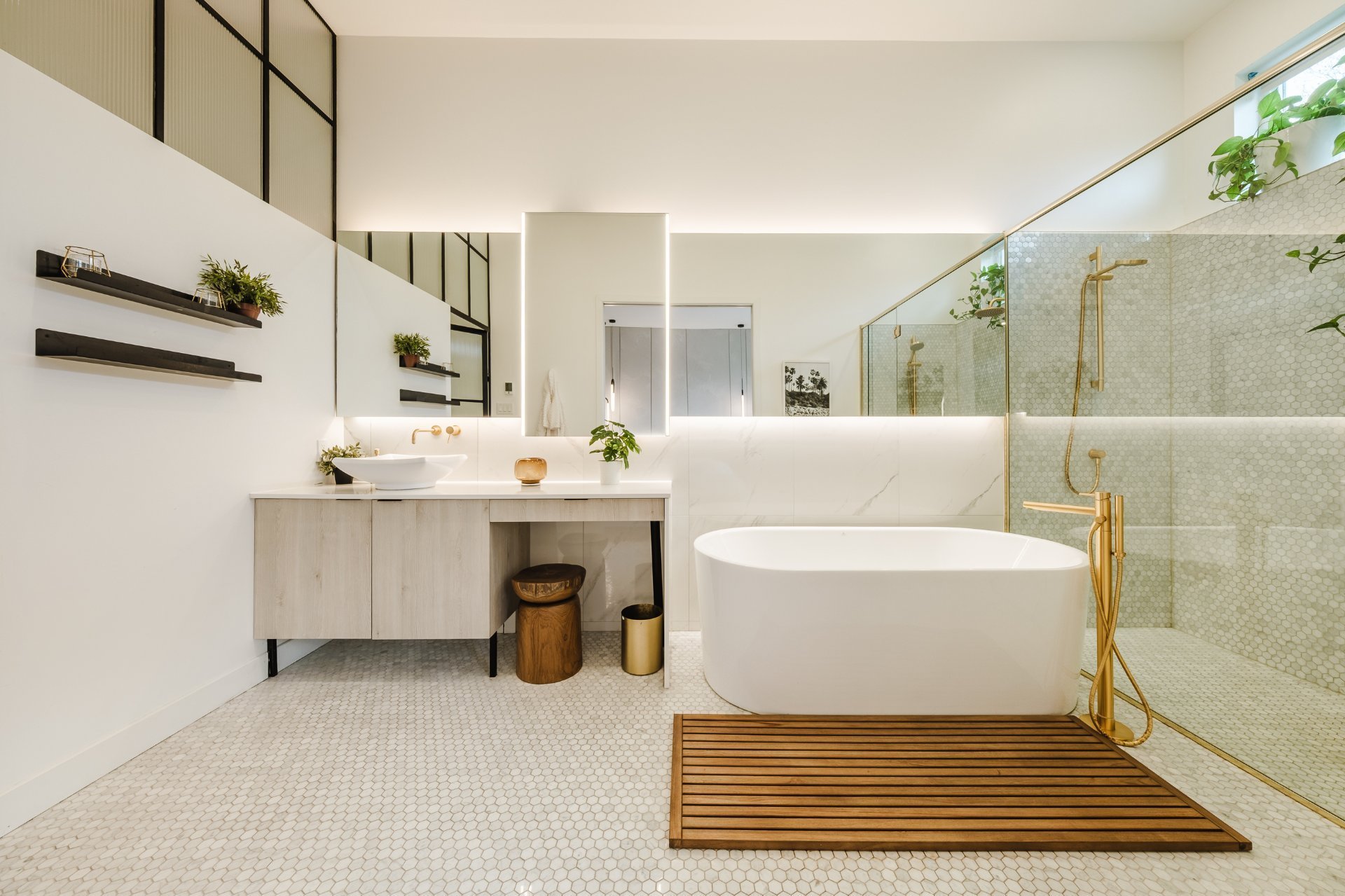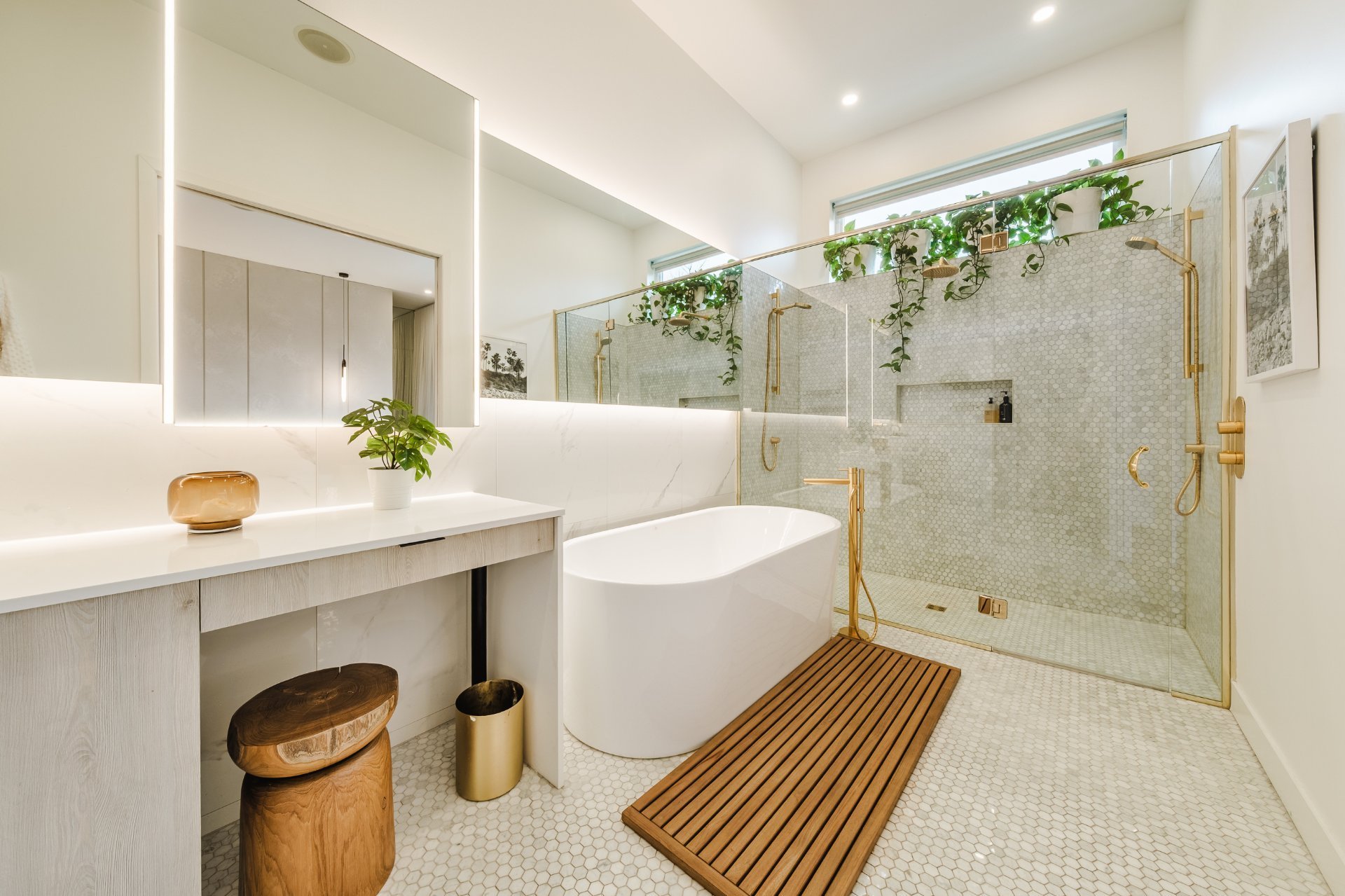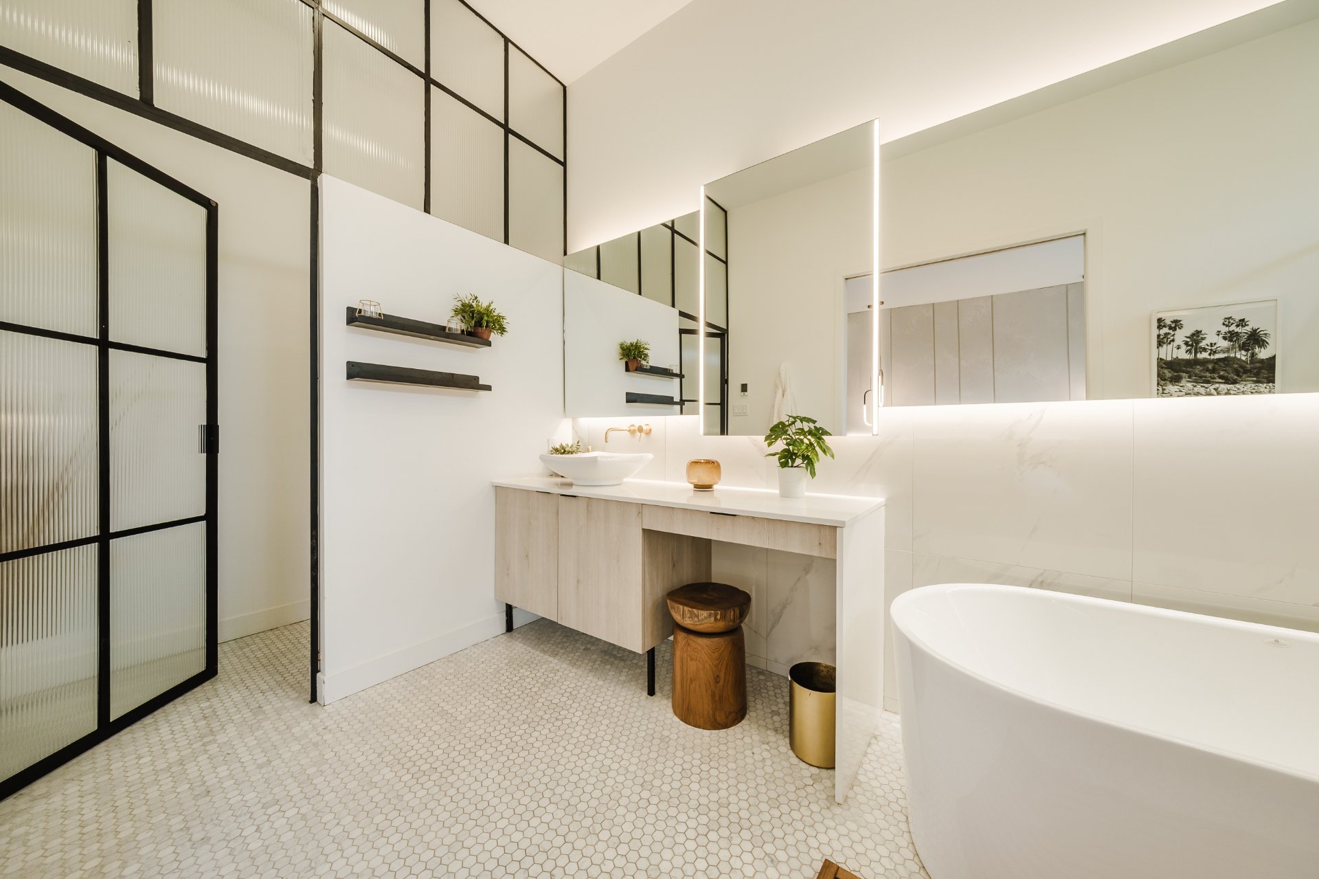 * La salle de bain attenante propose une vaste douche vitrée aux finitions dorées occupant toute la largeur du mur, ainsi qu'une coiffeuse raffinée dotée d'un miroir rétroéclairé.