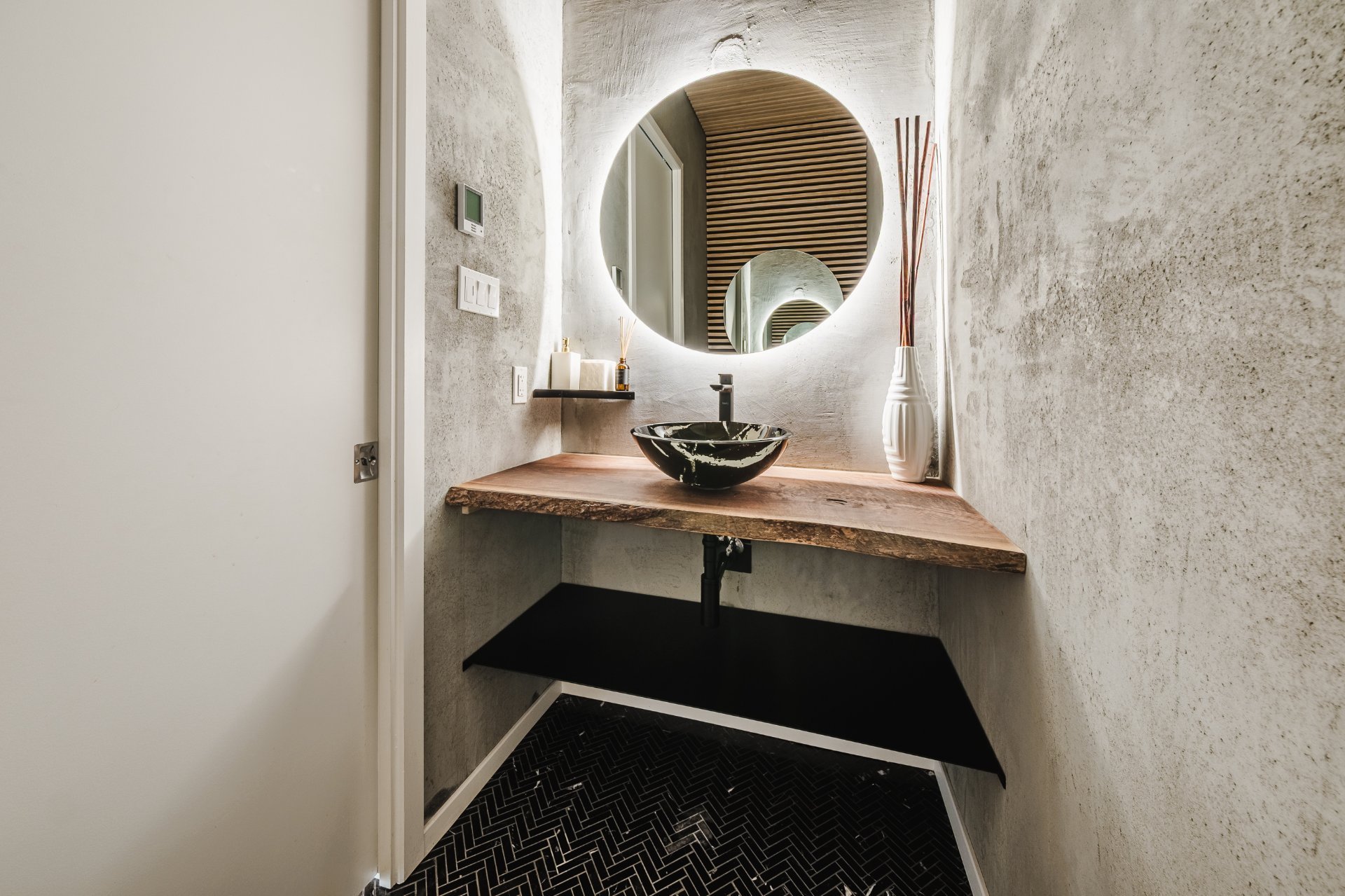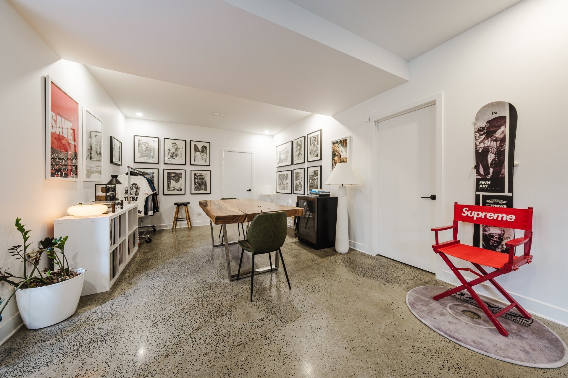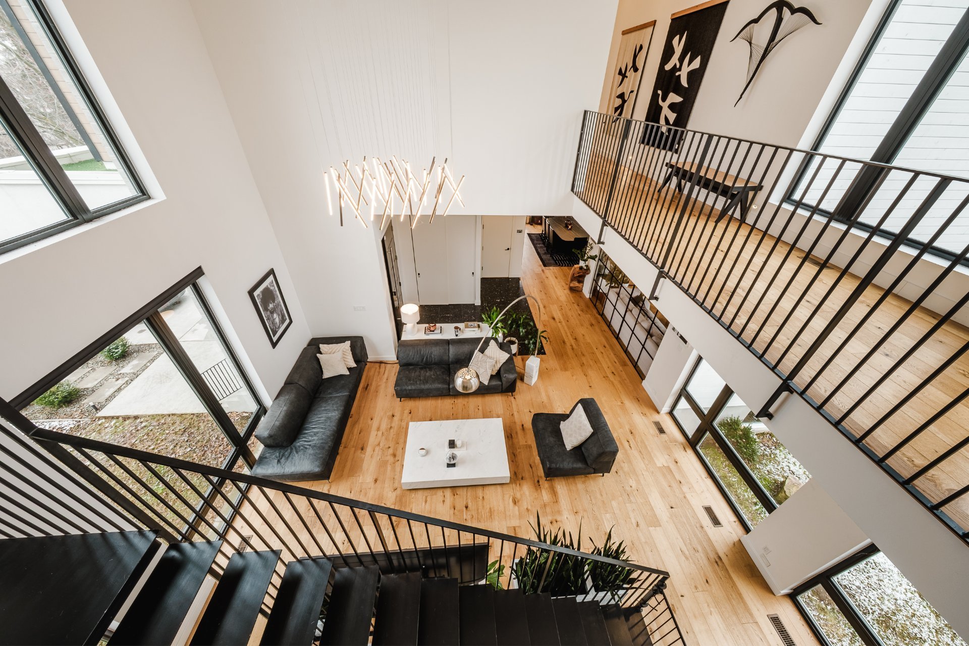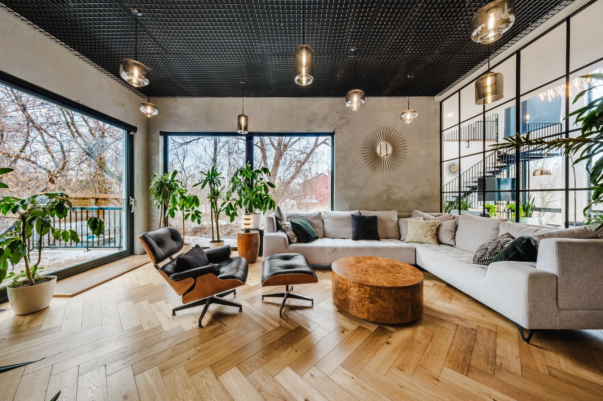 * Verrière offrant une vue imprenable sur le boisé, prolongeant l'espace de vie, de grandes cloisons vitrées de style industriel laissant pénétrer la lumière naturelle, un plafond noir texturé agrémenté de luminaires suspendus dorés, créant une ambiance chic et feutrée.