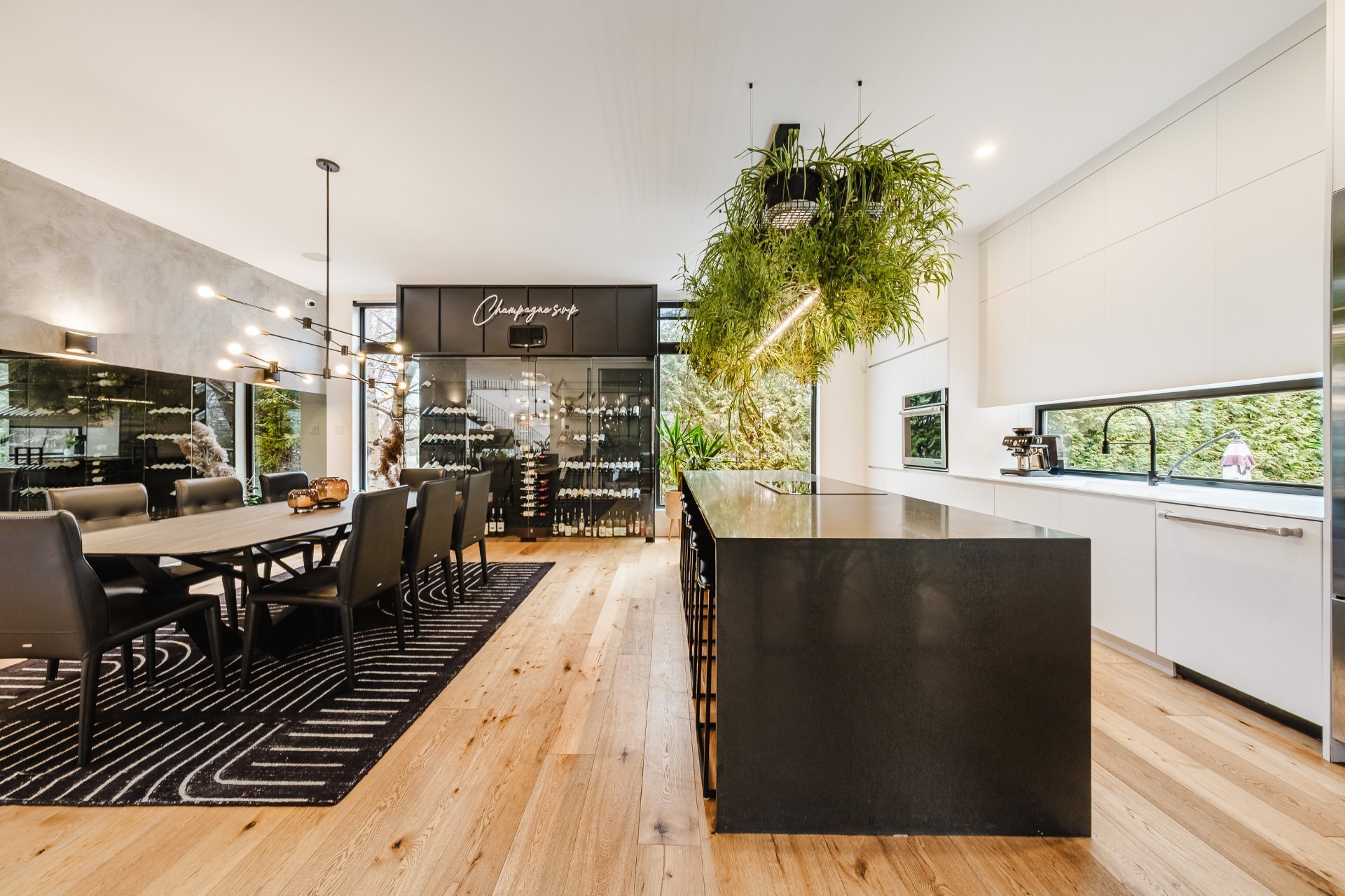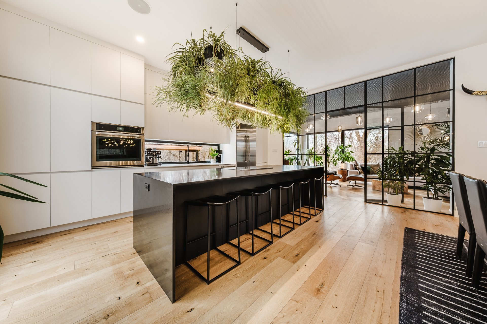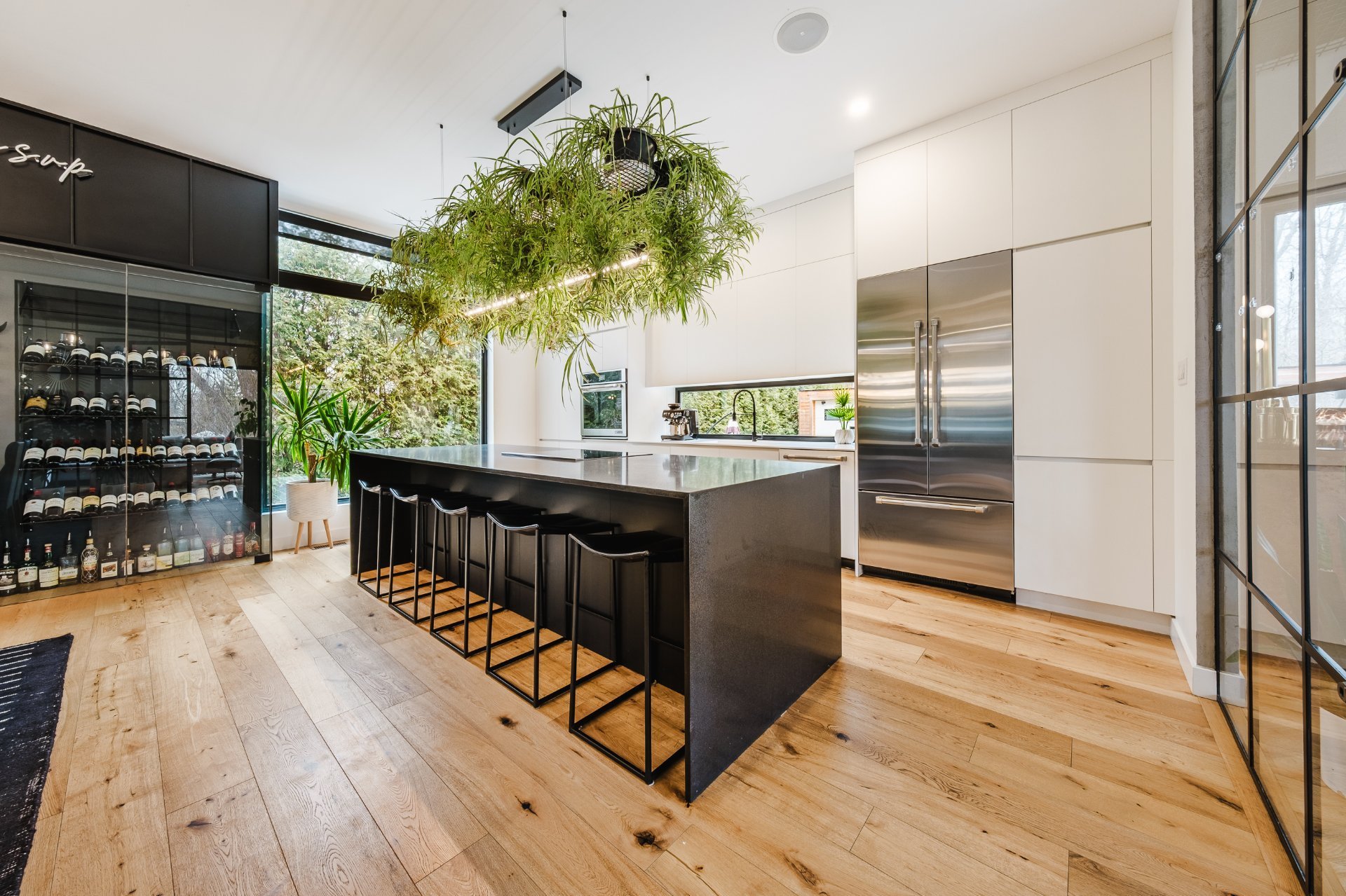 * Cuisine haut de gamme avec cellier vitré, îlot en quartz et intégration fluide à la salle à manger et à la verrière,