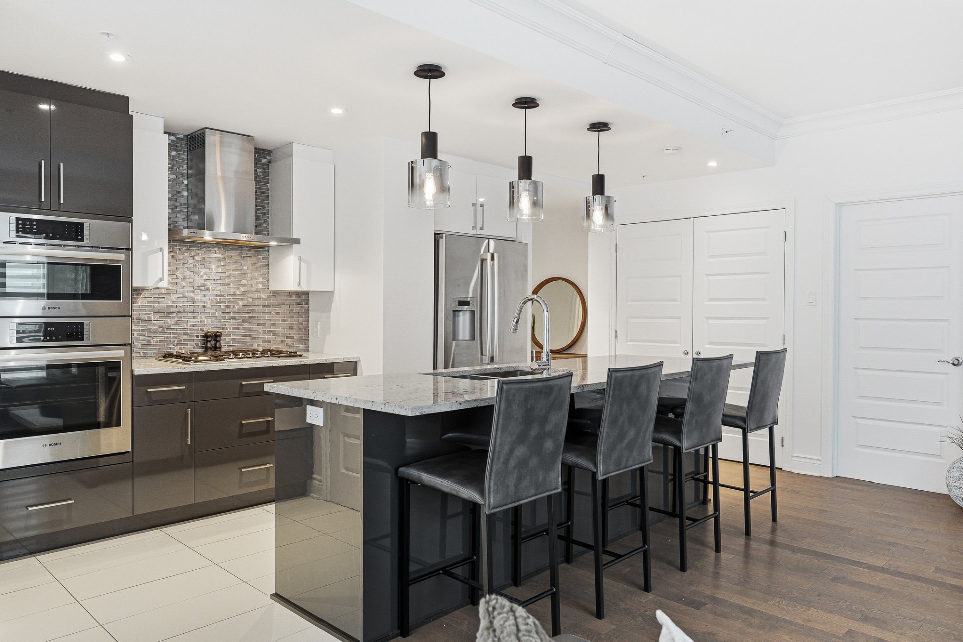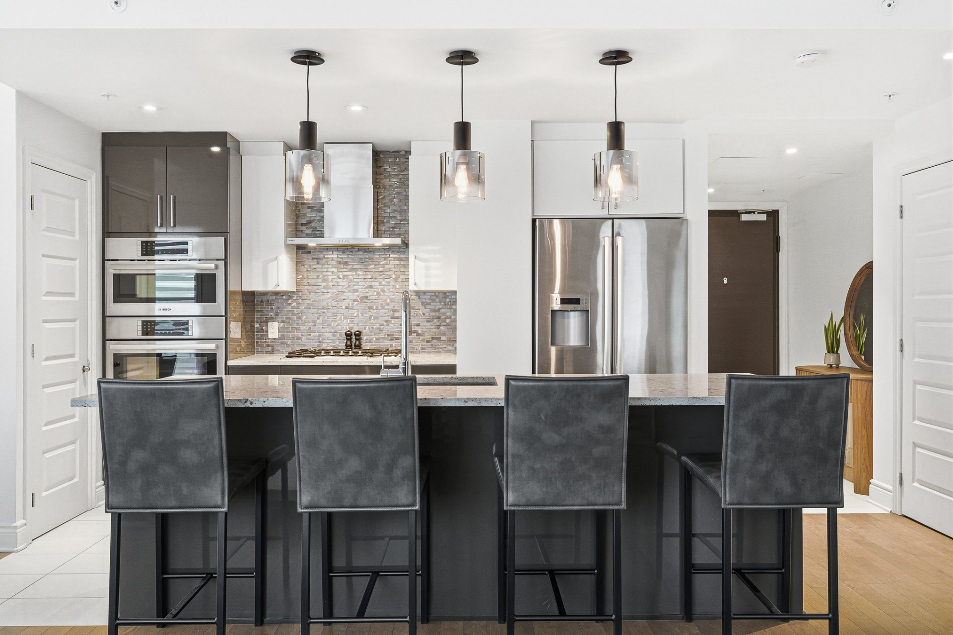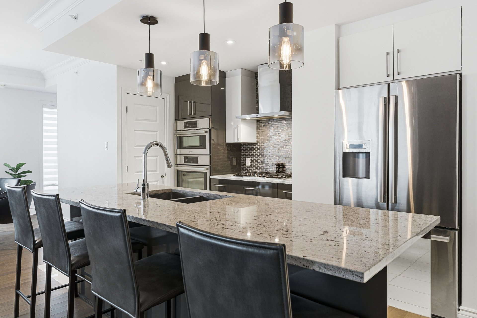 - Une cuisine avec îlot central et comptoirs en granit, offrant un espace fonctionnel pour cuisiner, échanger et recevoir.