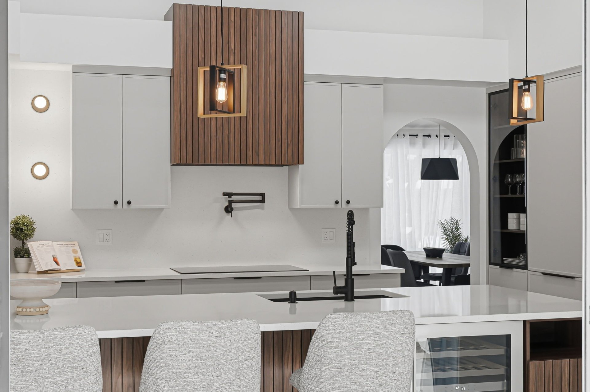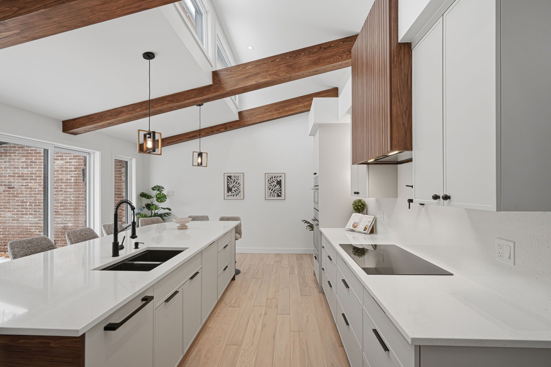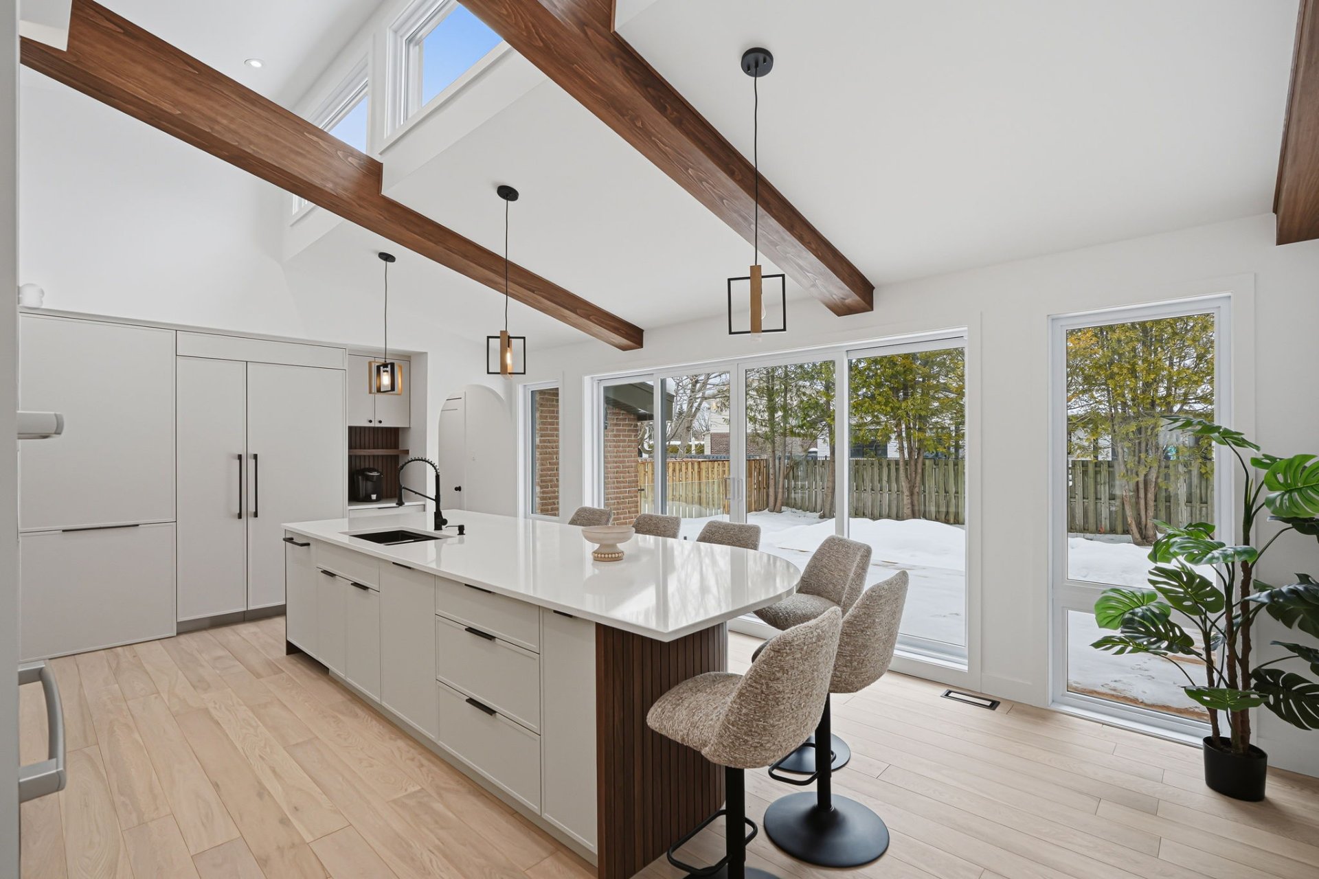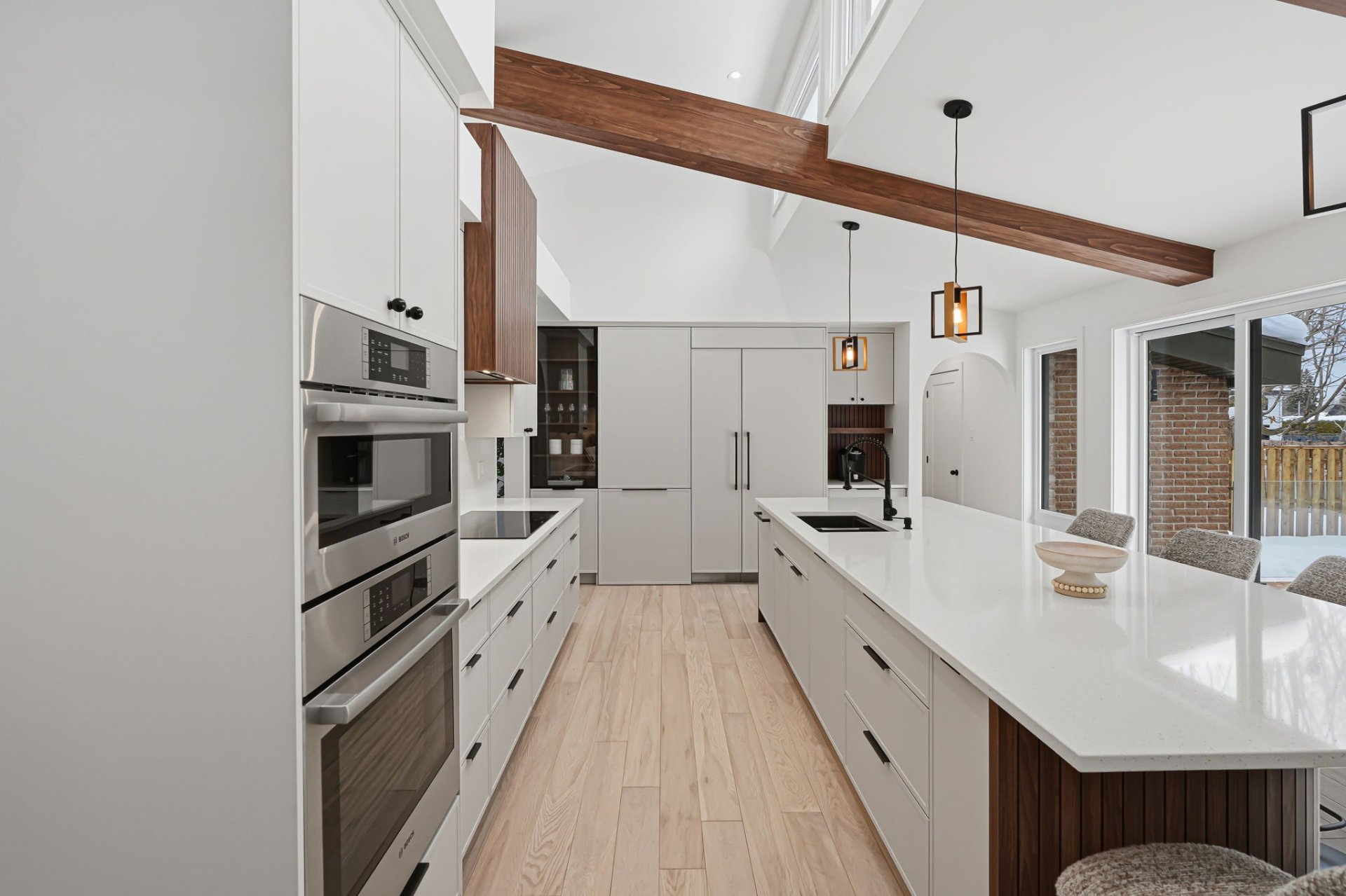- La cuisine, digne des plus prestigieuses publications de design, dépasse toutes les attentes : plafond fenestré de 8 à 14 pieds, îlot de 12' aux courbes uniques, comptoirs et dosserets en quartz, 7 électroménagers neufs, garde-manger dissimulé avec évier et espace prévu pour un second réfrigérateur et lave-vaisselle.