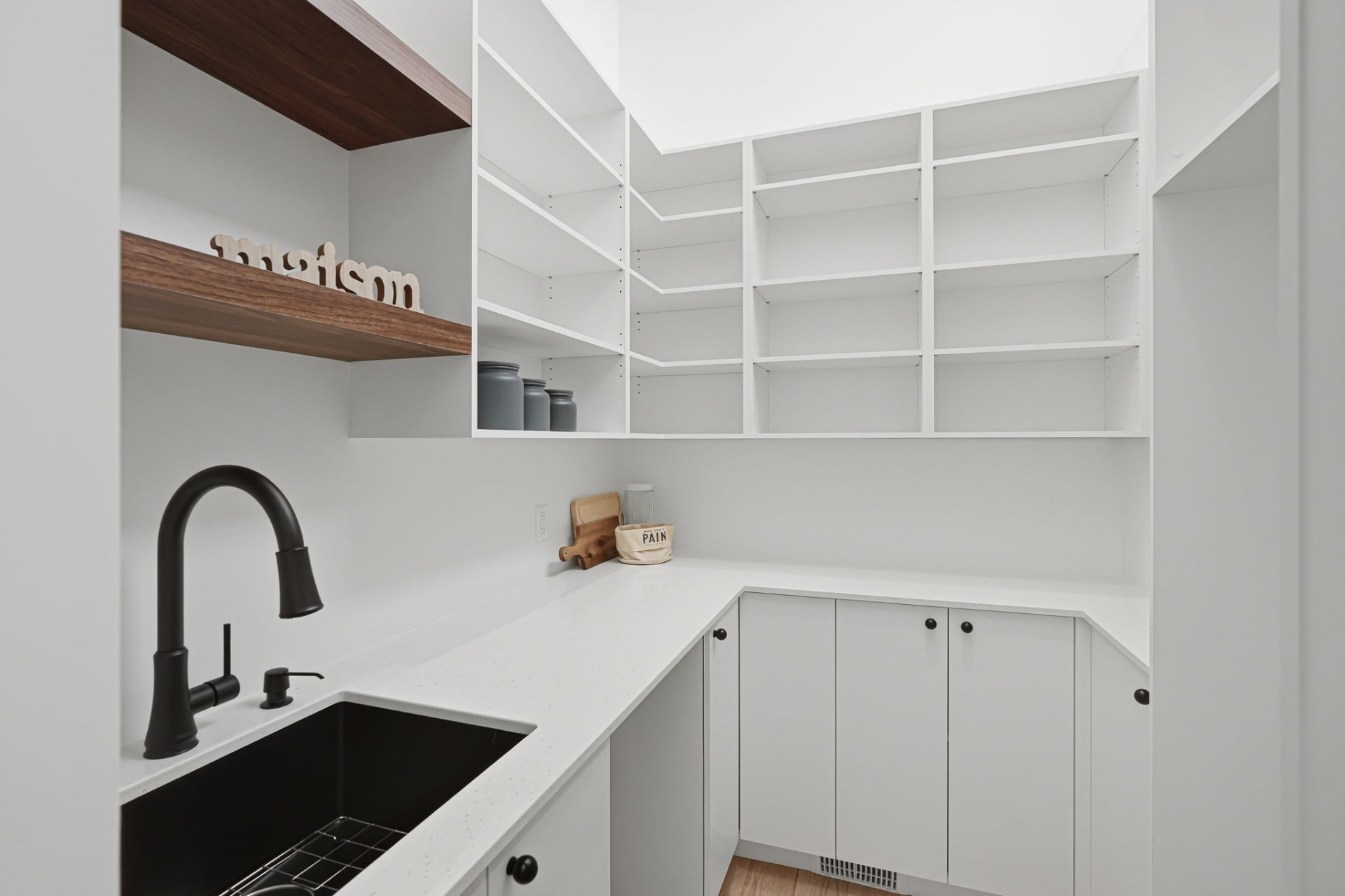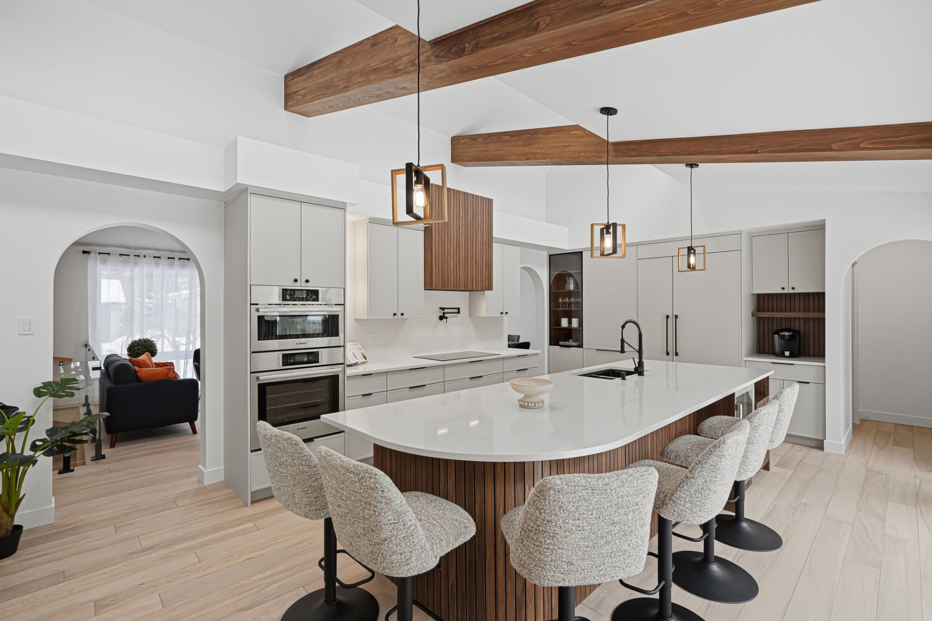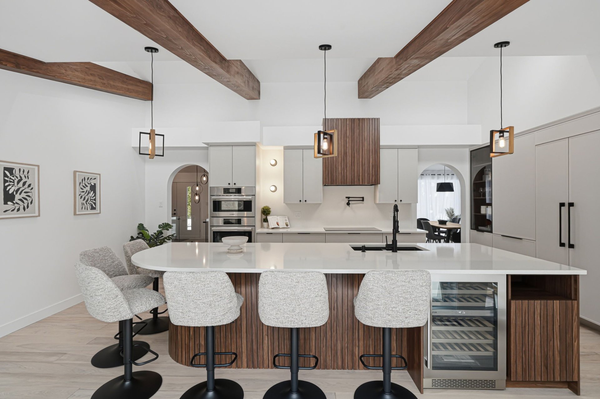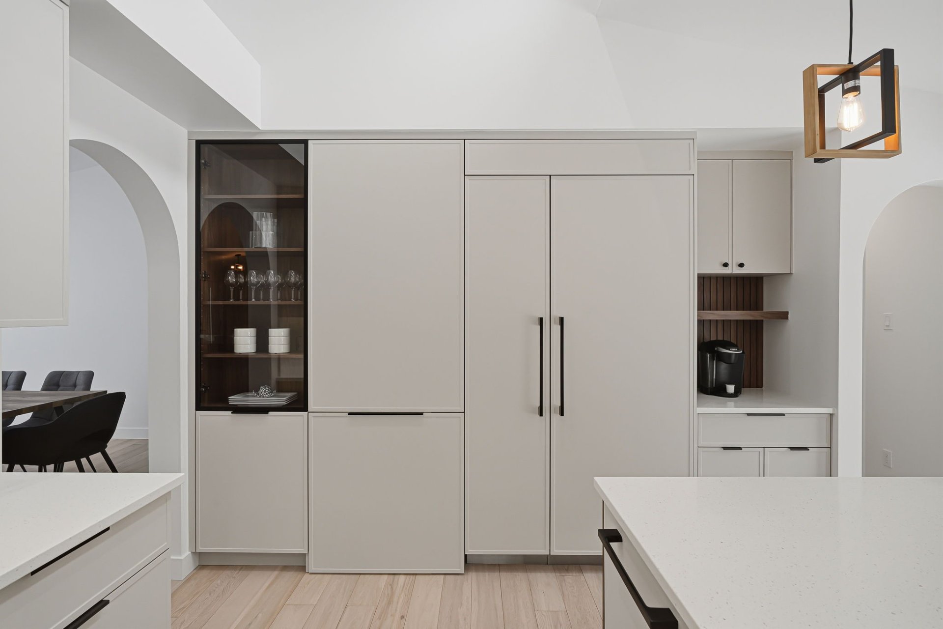 - La cuisine, digne des plus prestigieuses publications de design, dépasse toutes les attentes : plafond fenestré de 8 à 14 pieds, îlot de 12' aux courbes uniques, comptoirs et dosserets en quartz, 7 électroménagers neufs, garde-manger dissimulé avec évier et espace prévu pour un second réfrigérateur et lave-vaisselle.