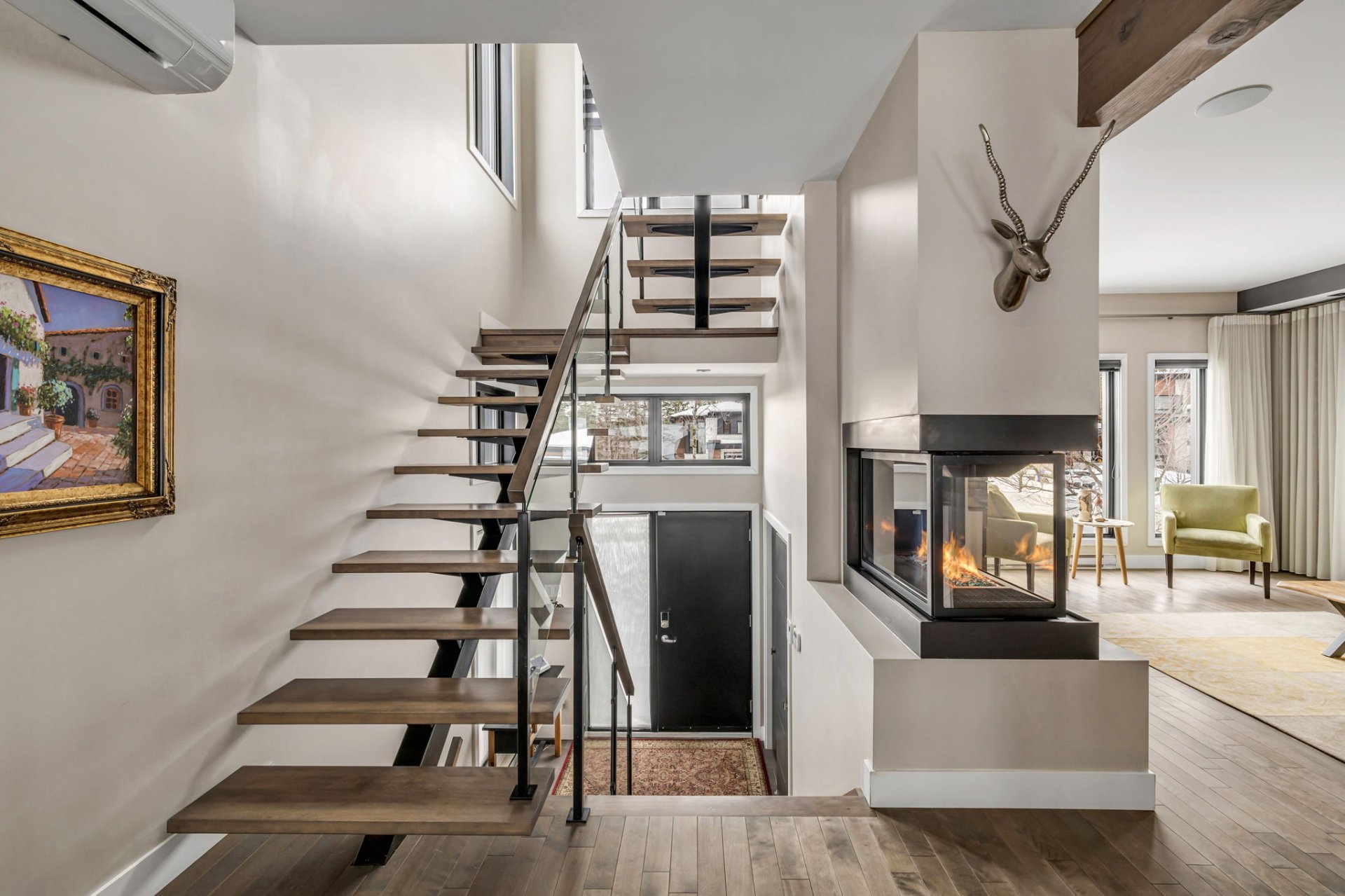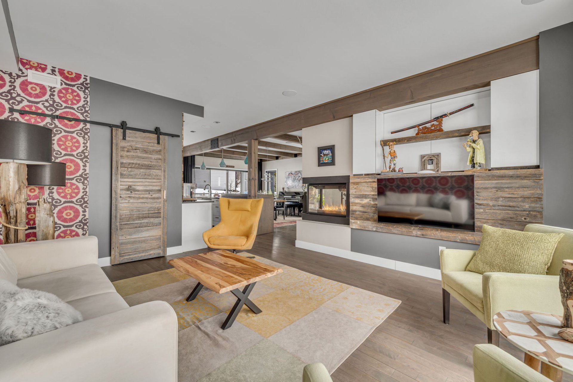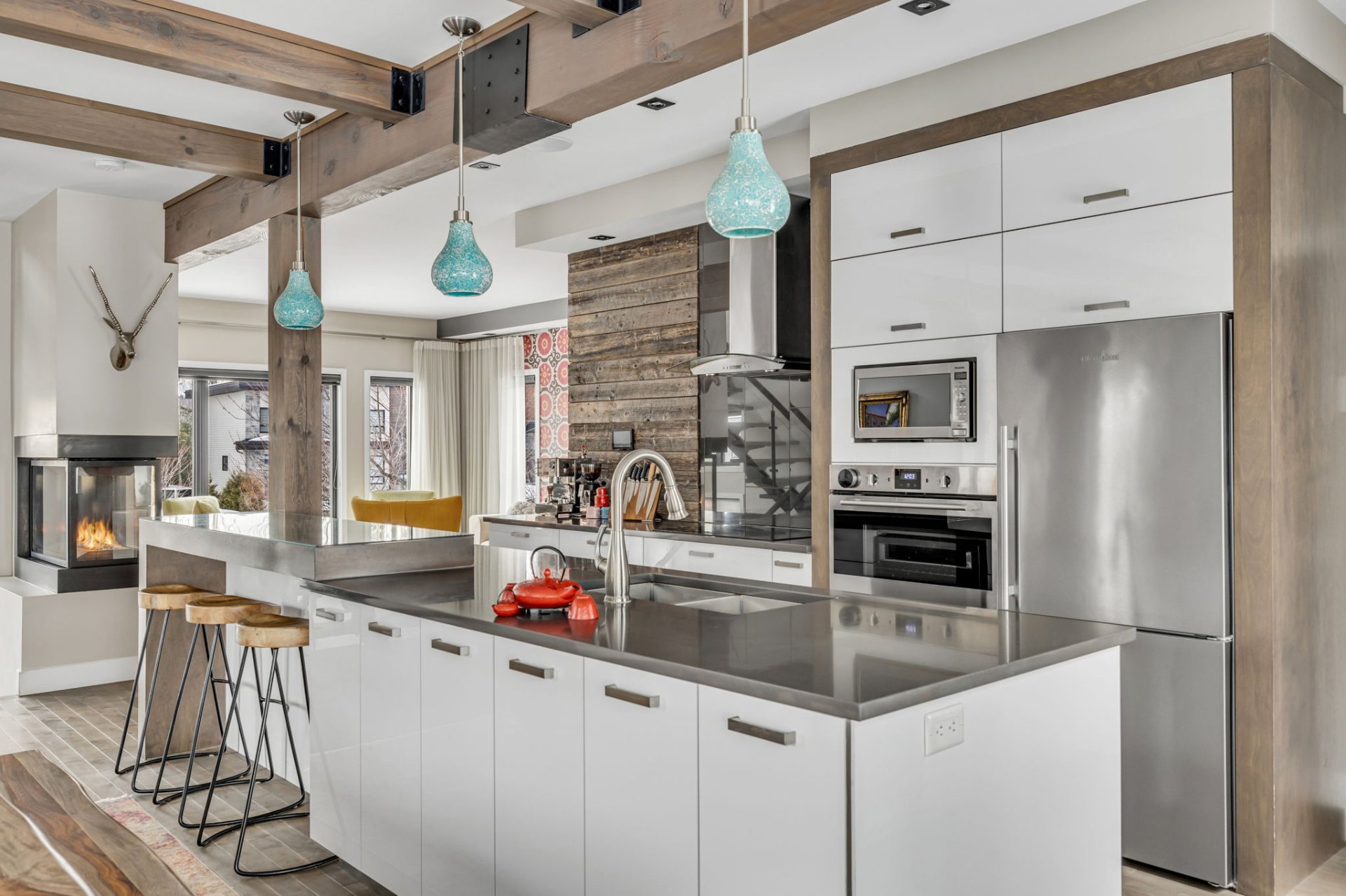Répartie sur trois niveaux, la résidence propose des espaces de vie à la fois modernes et chaleureux. Le rez-de-chaussée se distingue par son aire de vie ouverte baignée de lumière naturelle grâce à une fenestration abondante et des plafonds de 9 pieds. Le salon, convivial et élégant, est agrémenté d'un foyer au gaz qui crée une atmosphère accueillante. La cuisine contemporaine, dotée d'un grand îlot central et d'un garde-manger pratique, s'ouvre harmonieusement sur la salle à manger, idéale pour recevoir famille et invités.